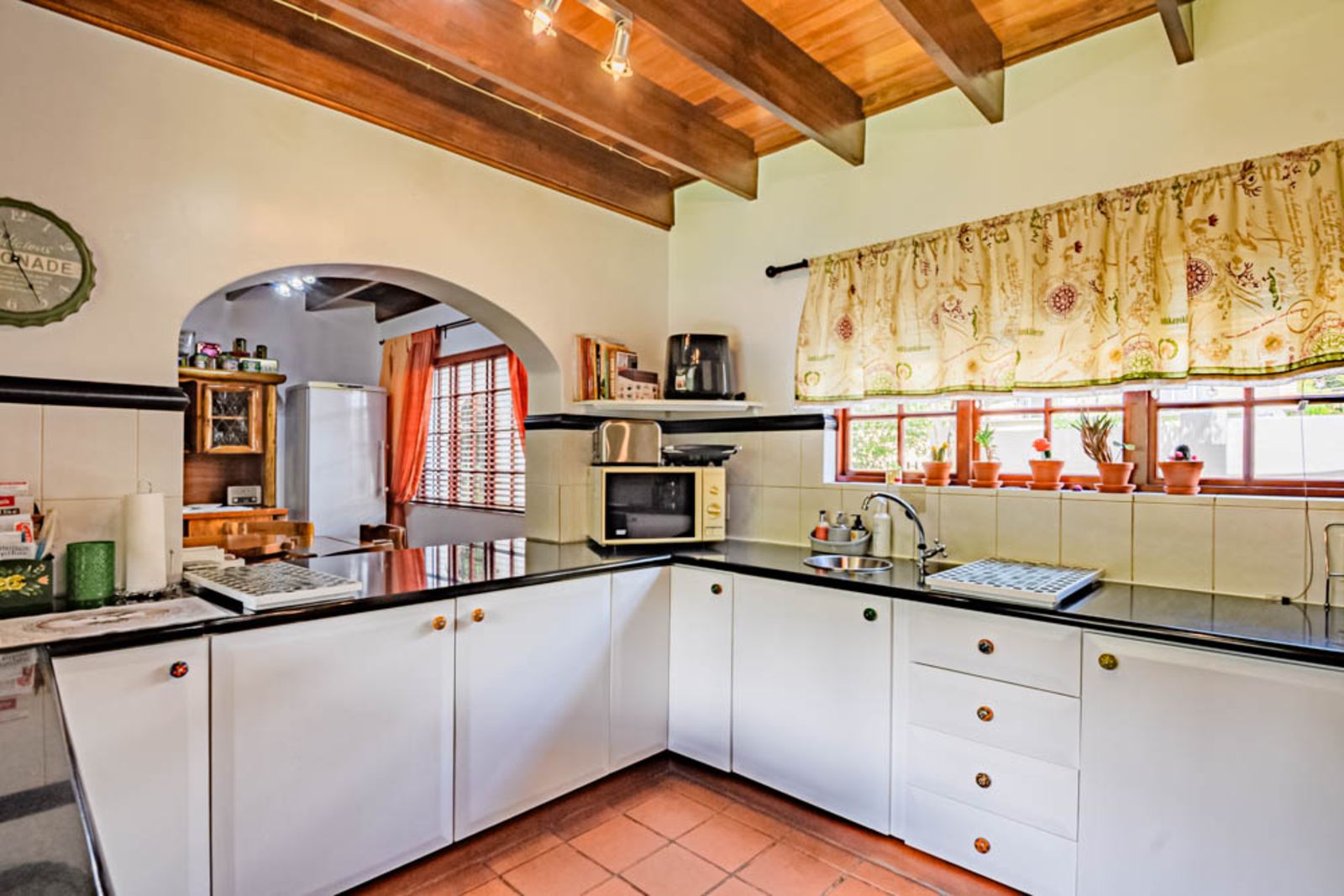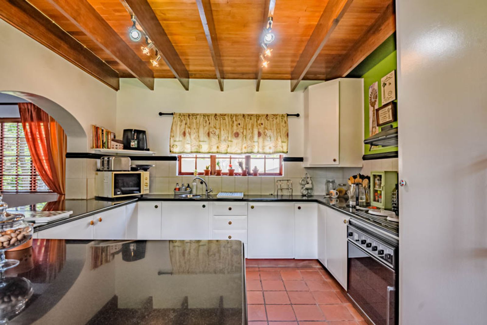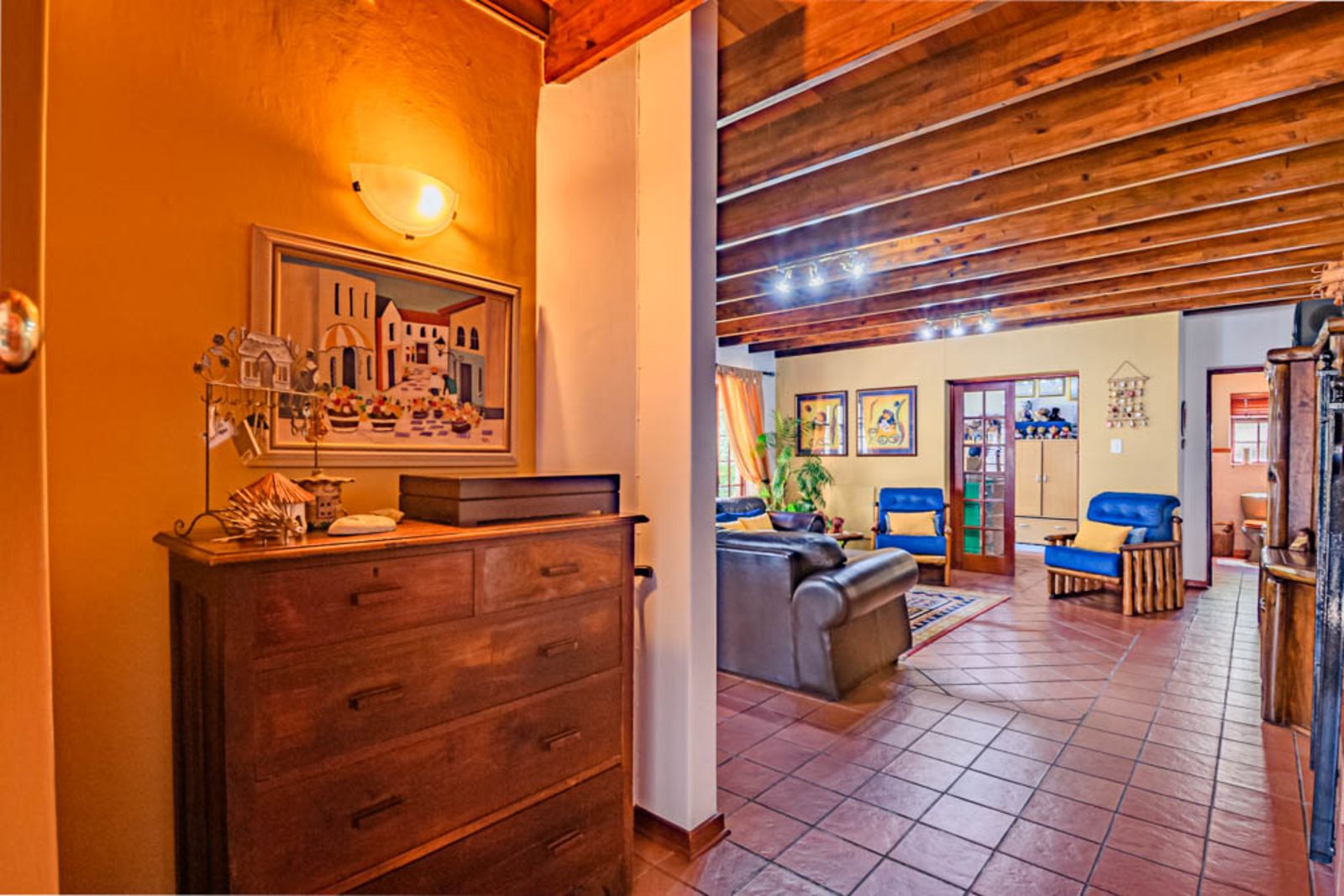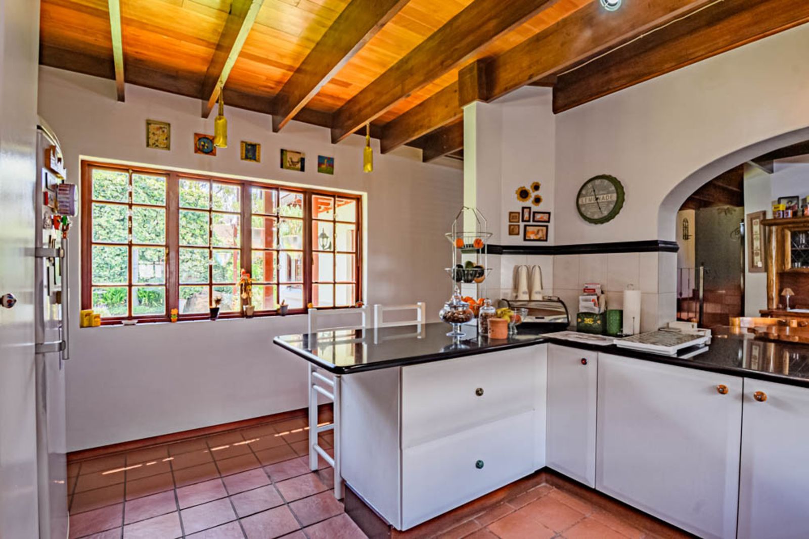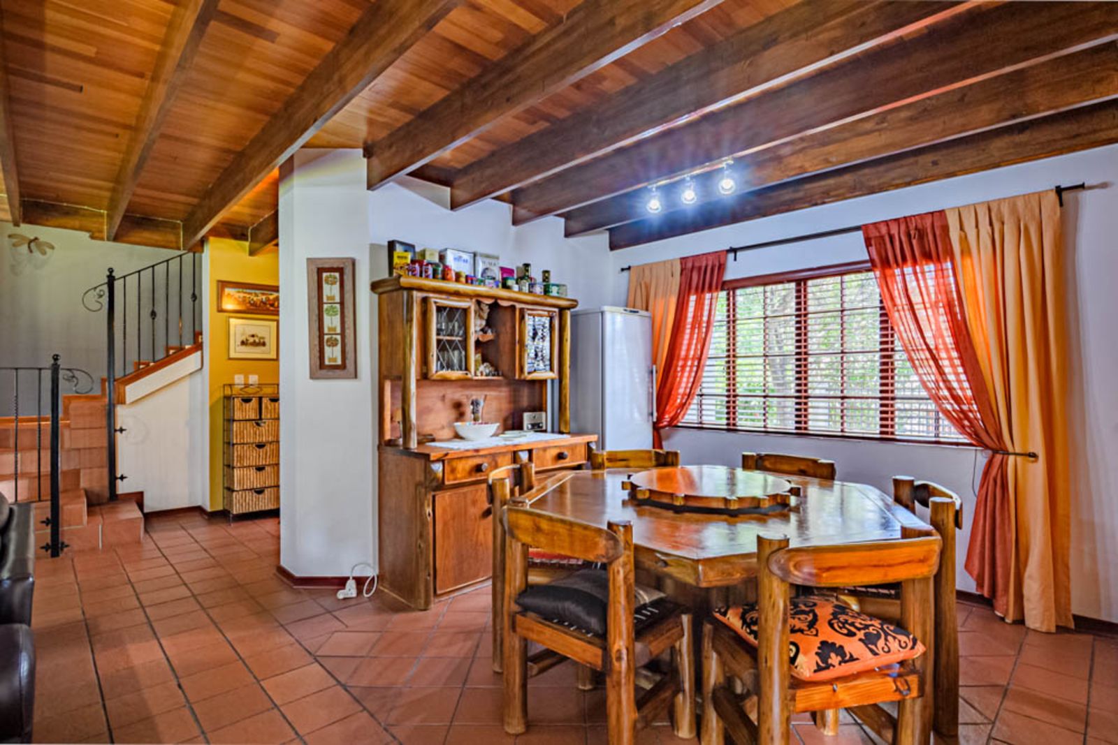 Charming architectural details including wooden ceilings and warm finishes throughout.