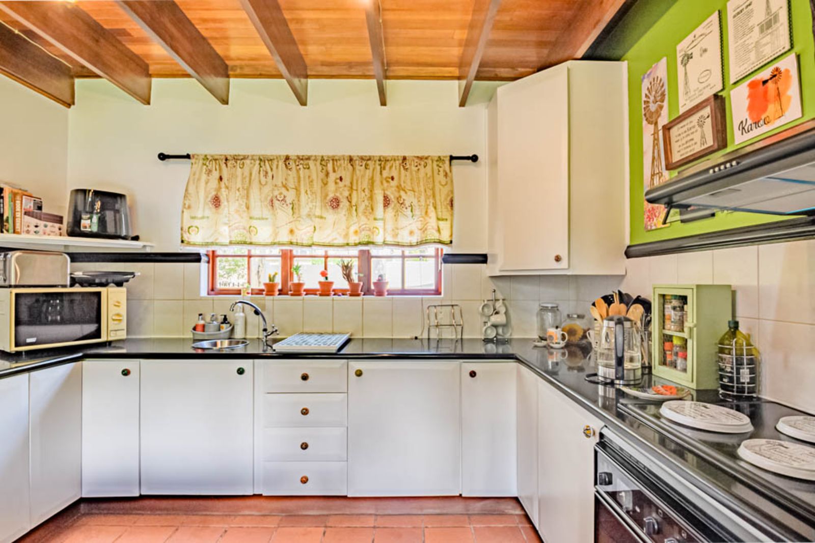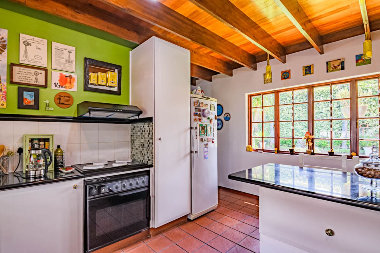 The kitchen has ample cupboard space an electrical stove with extractor fan and a prep sink, it has a separate scullery with enough space for 3 appliances and a double sink.