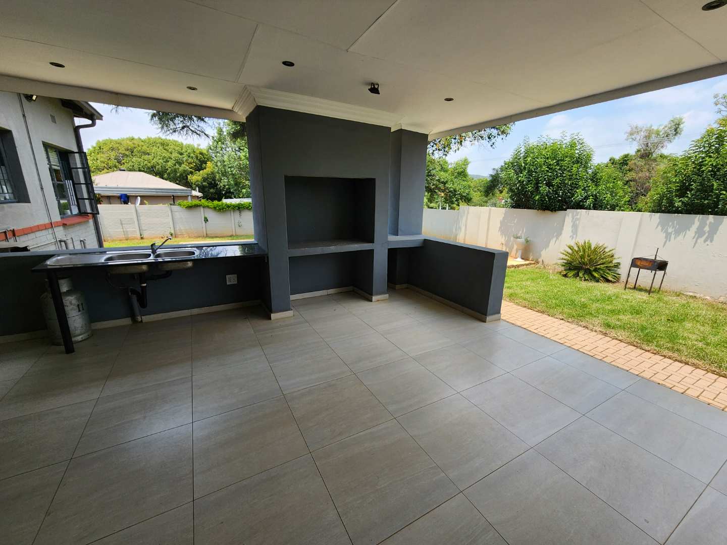 Ideal for entertaining, the property boasts a large covered patio with built-in braai, overlooking a swimming pool and a beautifully established garden with borehole, perfect for relaxed outdoor living.