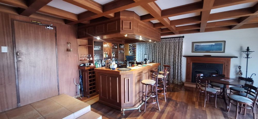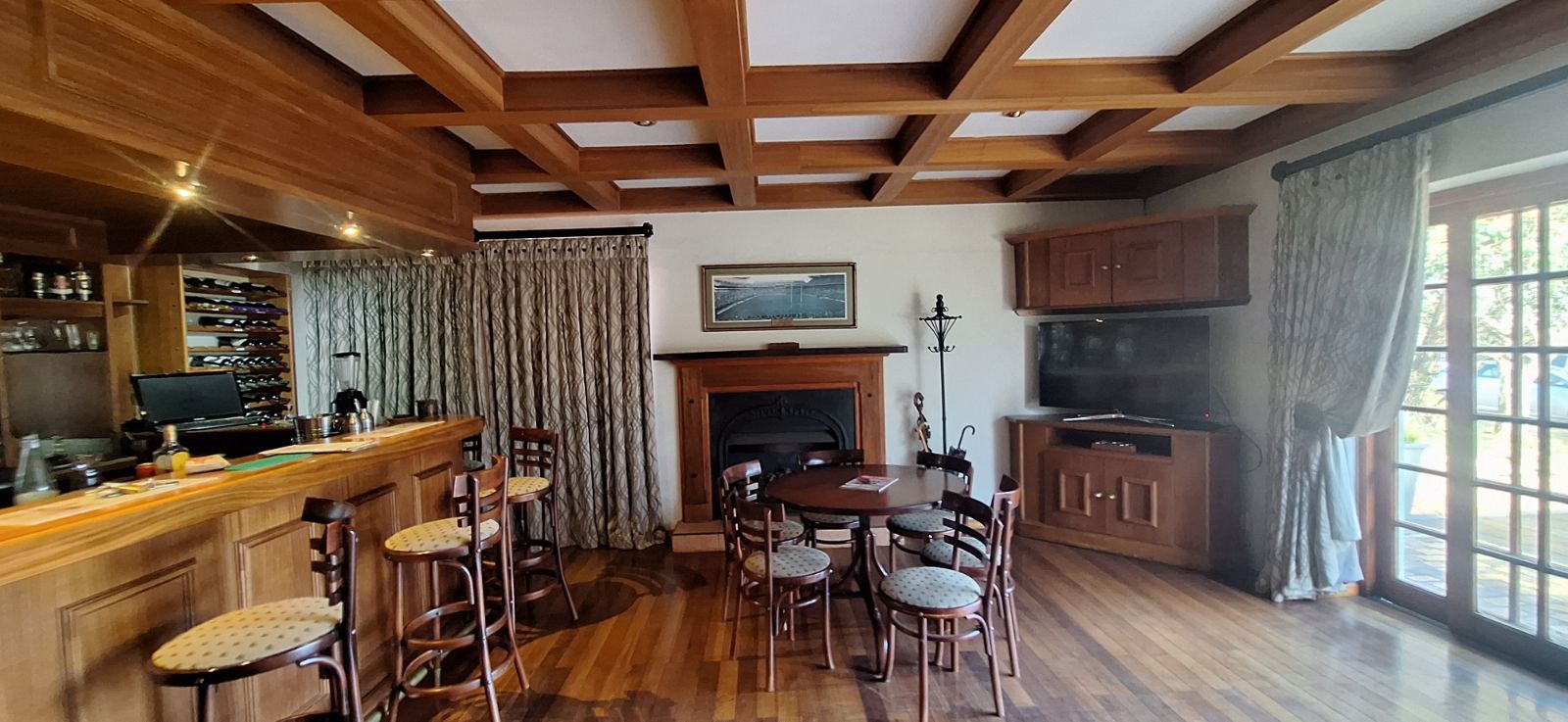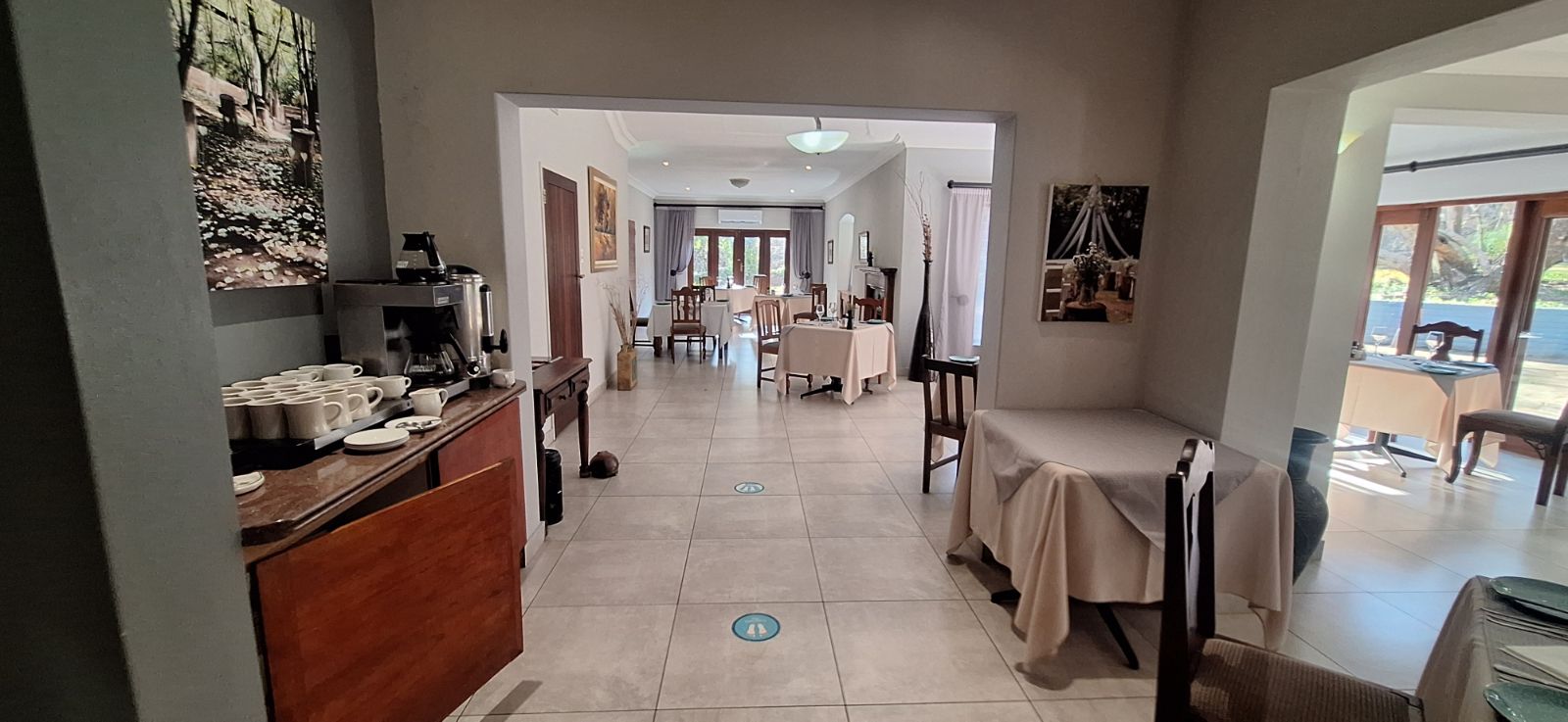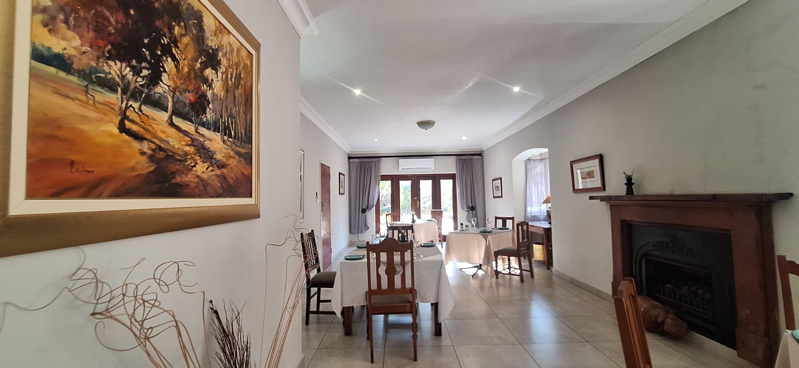 The main house features a spacious dining room, a cozy lounge, and a quiet library nook—complete with large windows and wooden doors that open onto a hill blanketed in towering trees. At the front, a lovely stoep (veranda) welcomes guests with tables and chairs where they can enjoy meals ordered from the kitchen while soaking up the view and peaceful atmosphere.