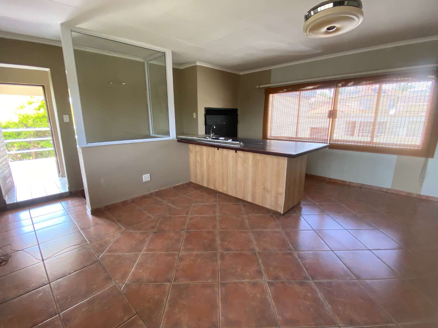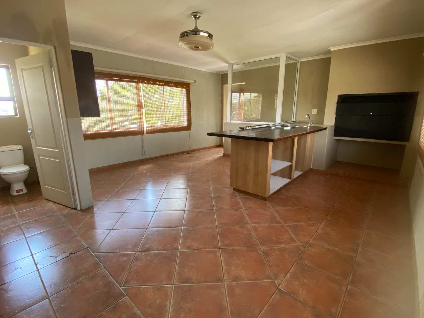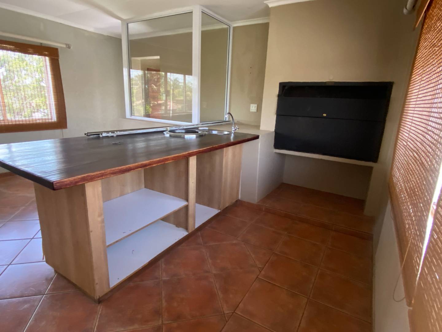 Upstairs features a large entertainment area with a built-in braai, sliding windows, prep counter with basin, and a guest toilet, making it ideal for hosting.
