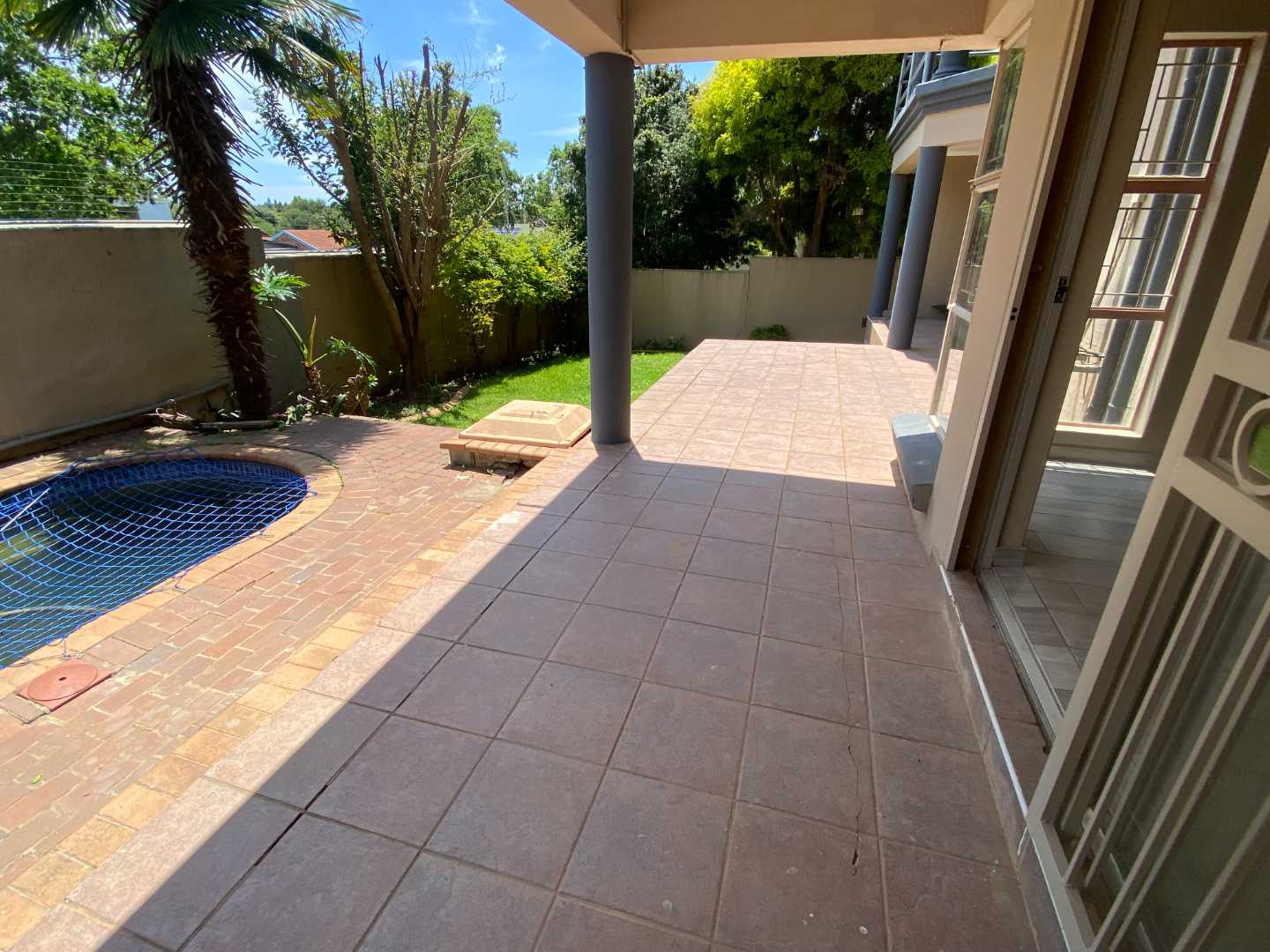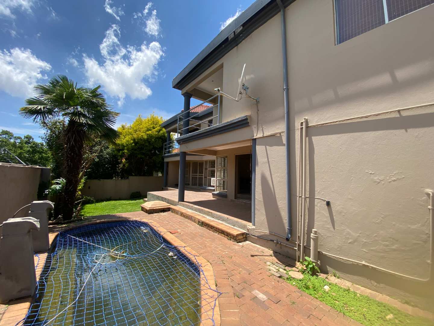 The outdoor area includes a small swimming pool surrounded by a private garden, perfect for relaxed family living.