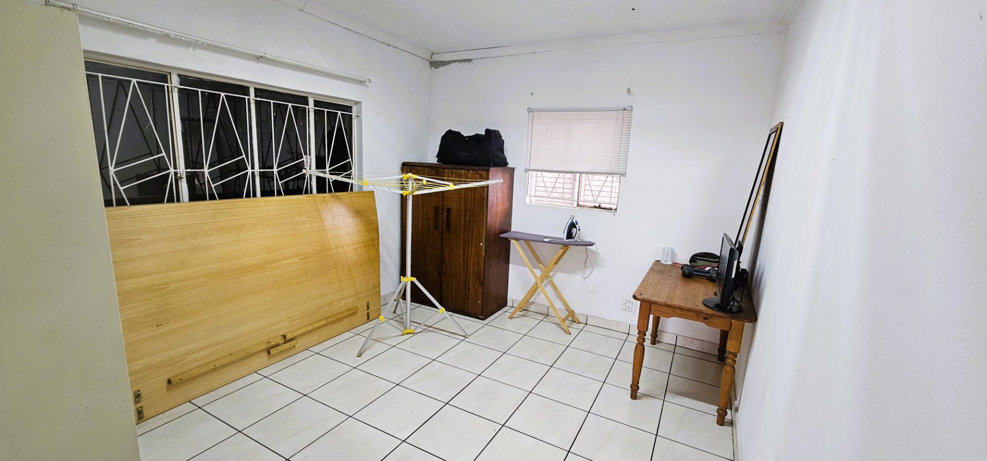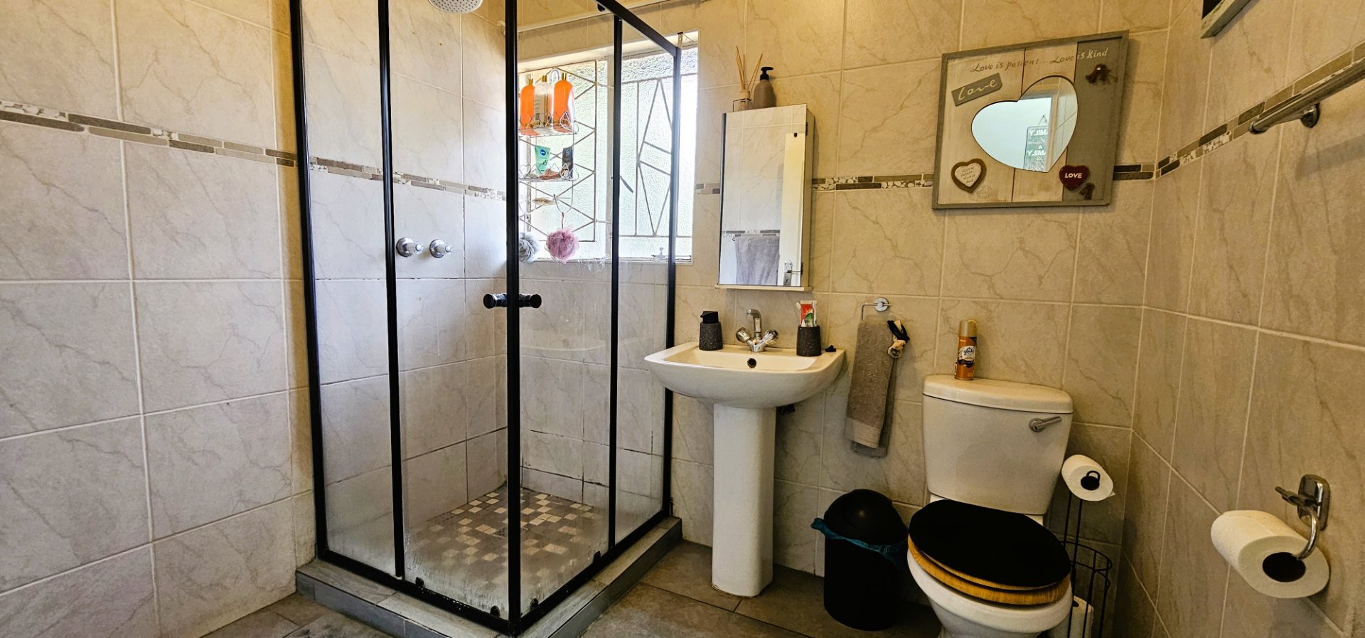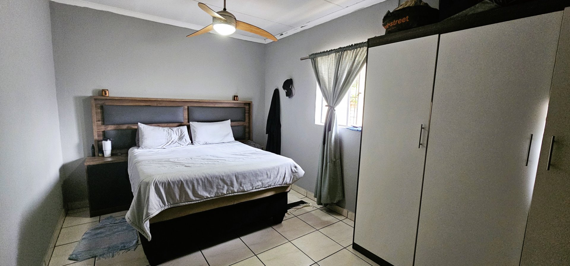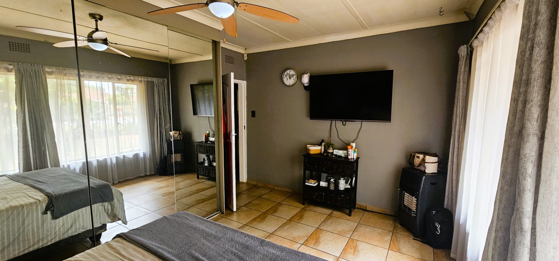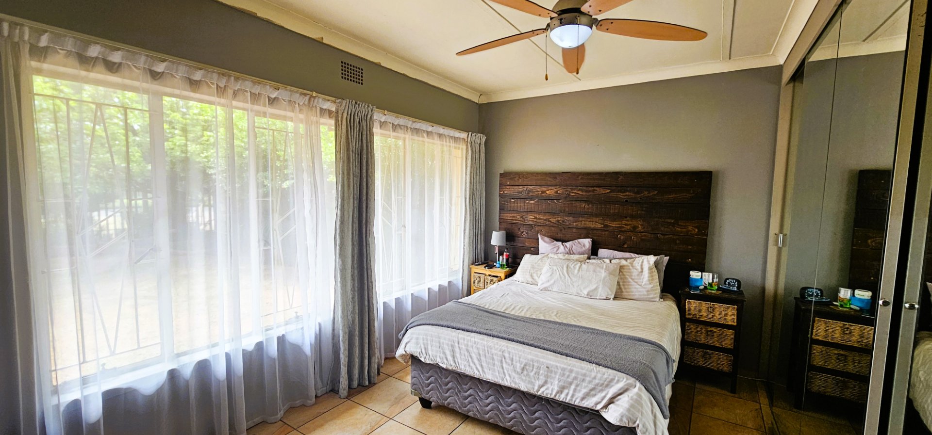 3 well-sized bedrooms, all tiled with built-in cupboards – the main bedroom is especially generous.