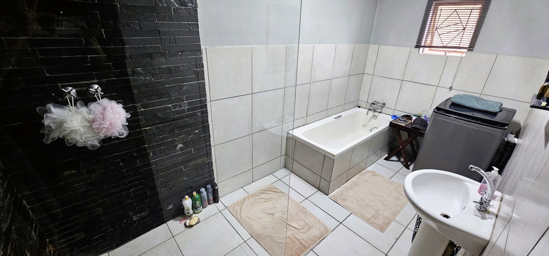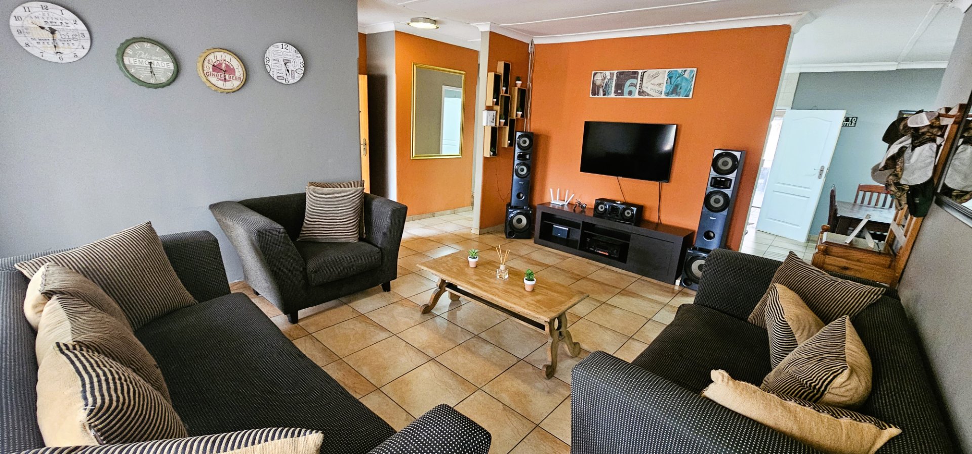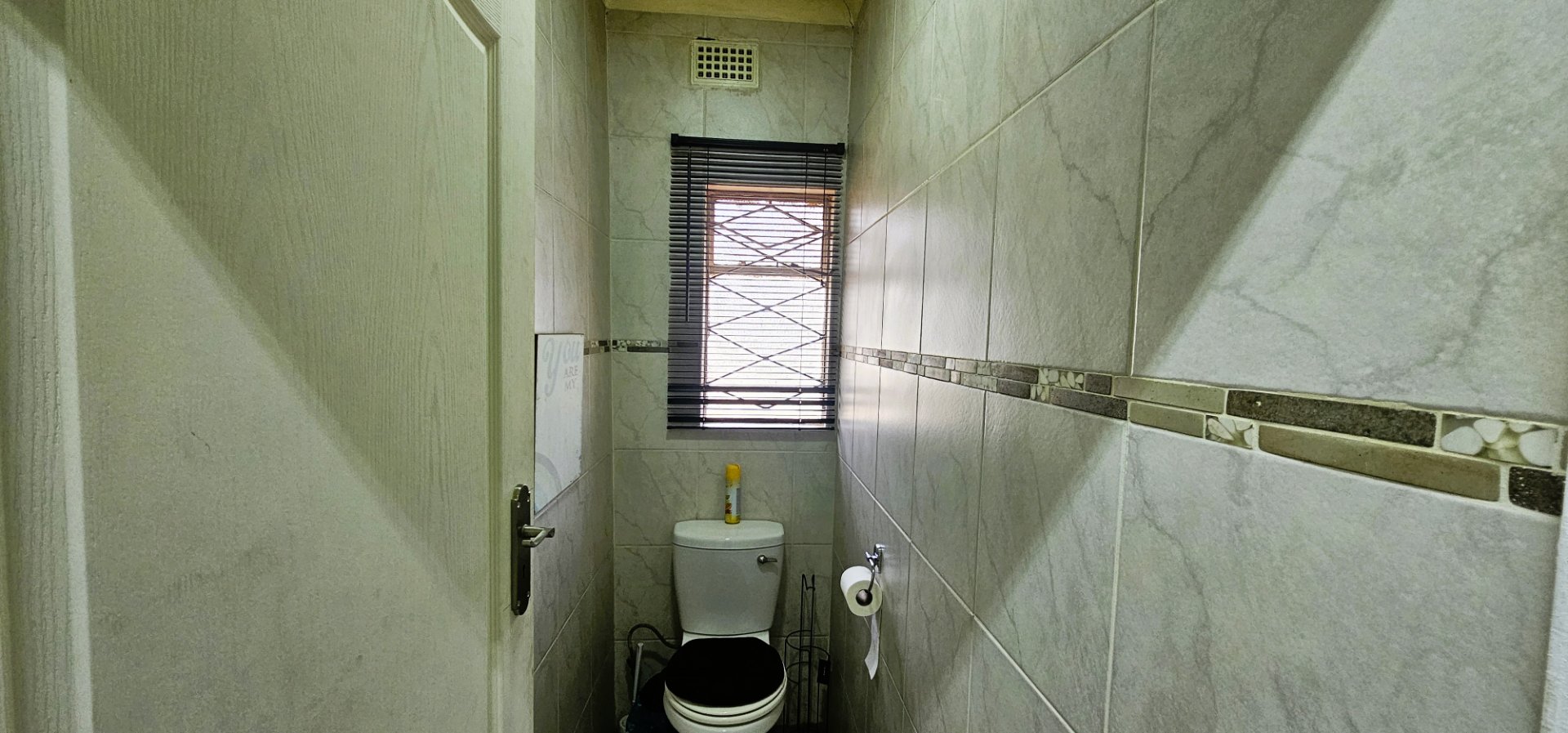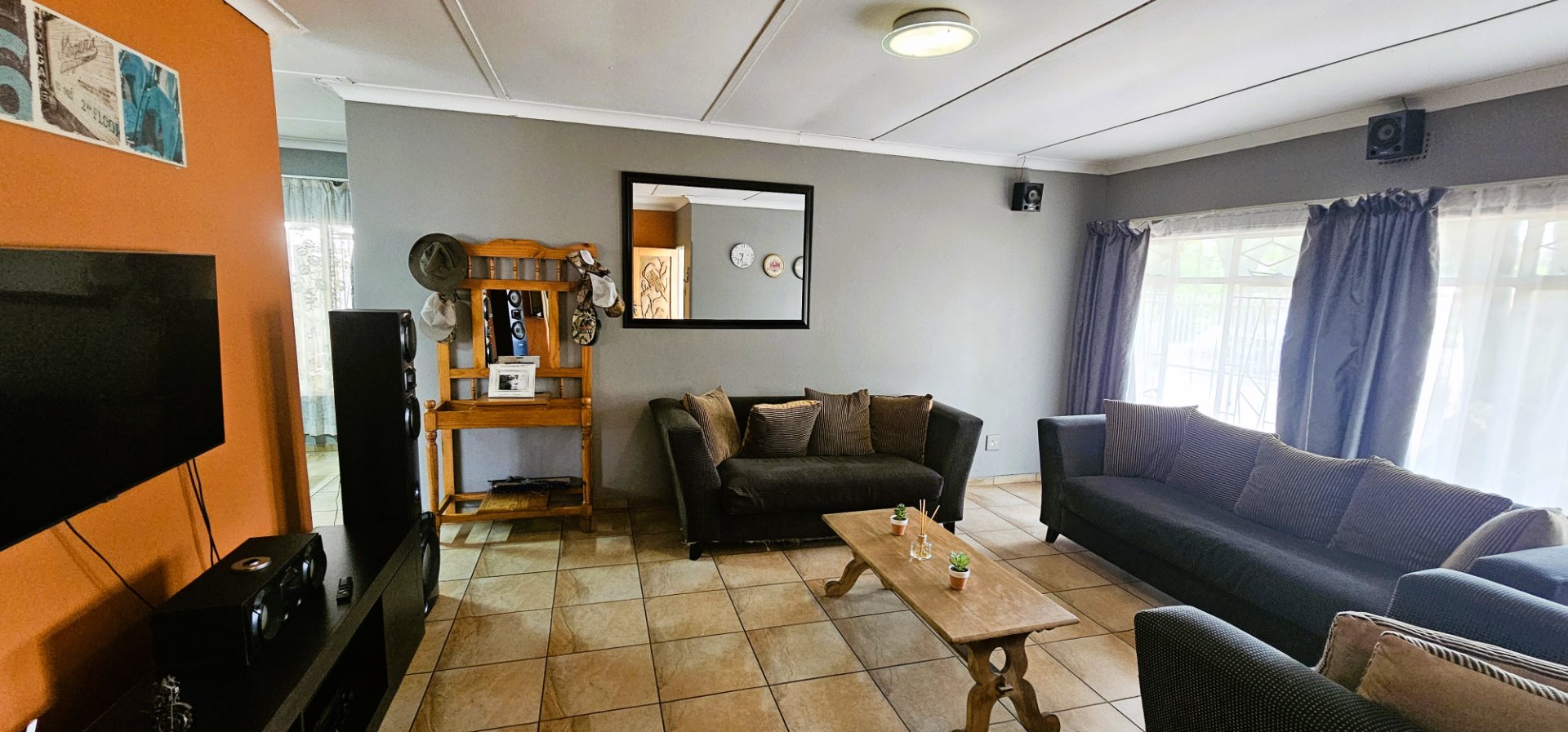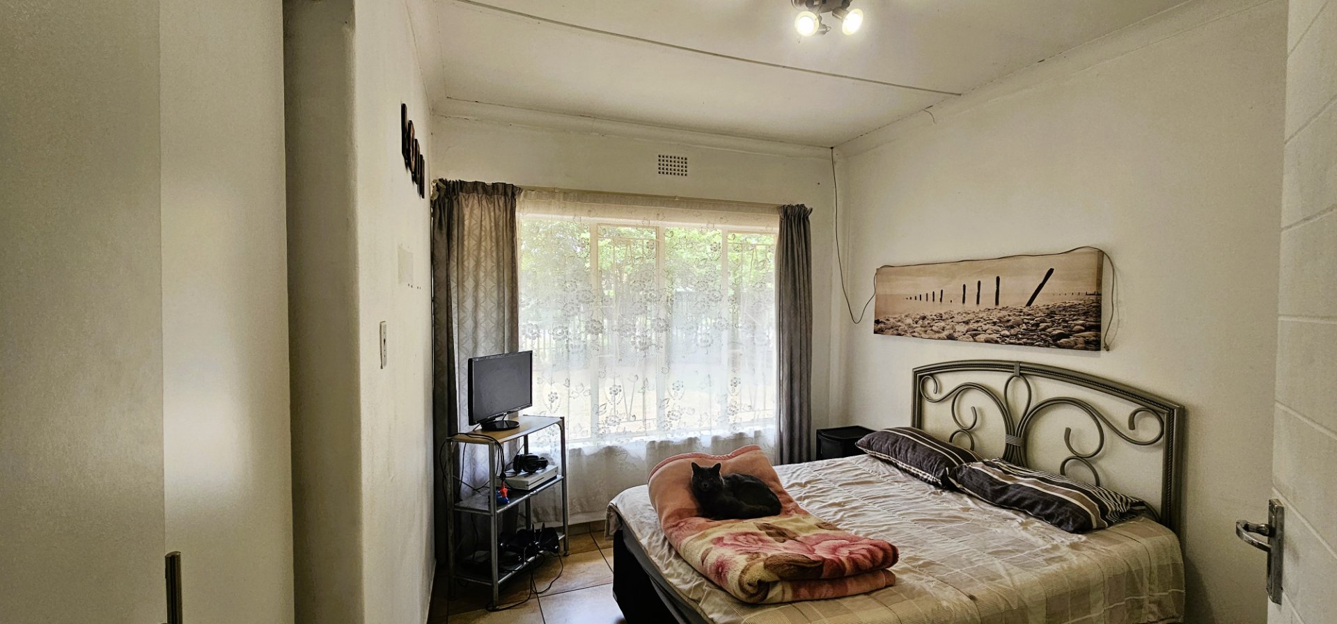 3 well-sized bedrooms, all tiled with built-in cupboards – the main bedroom is especially generous.