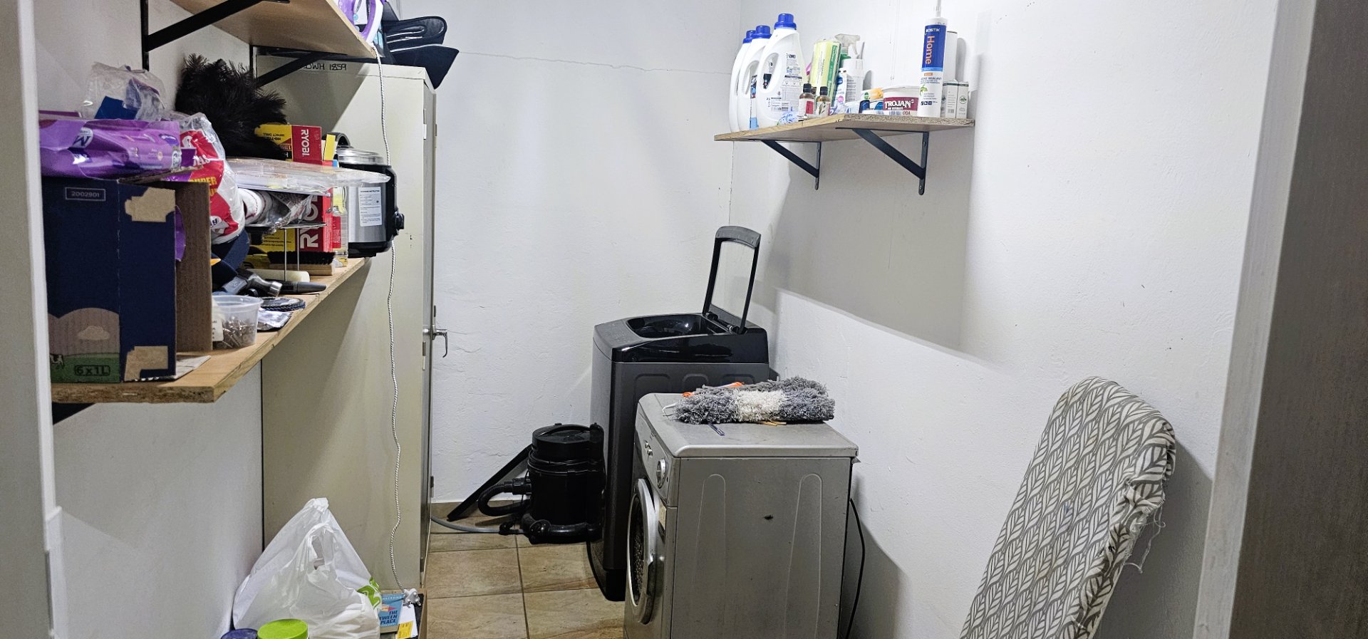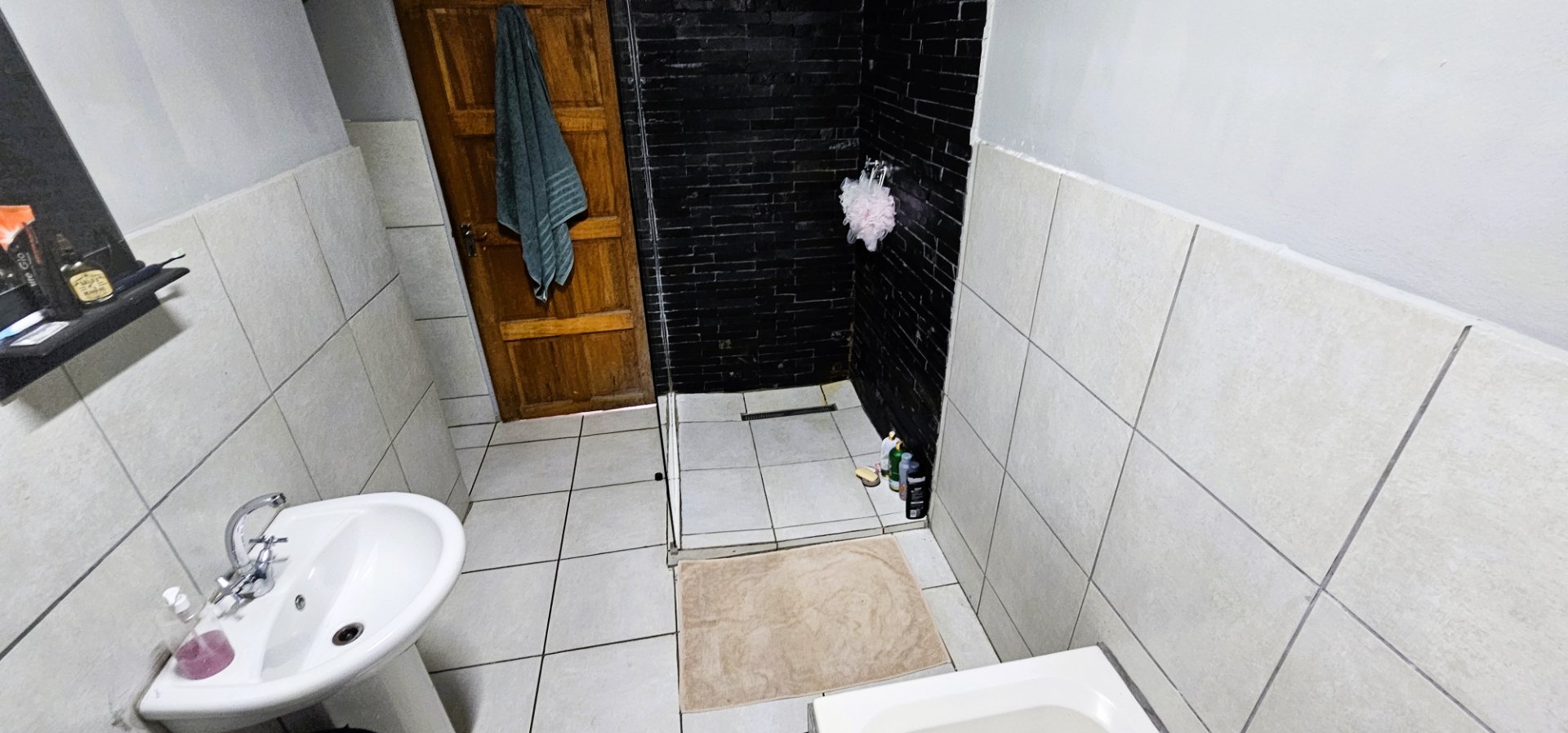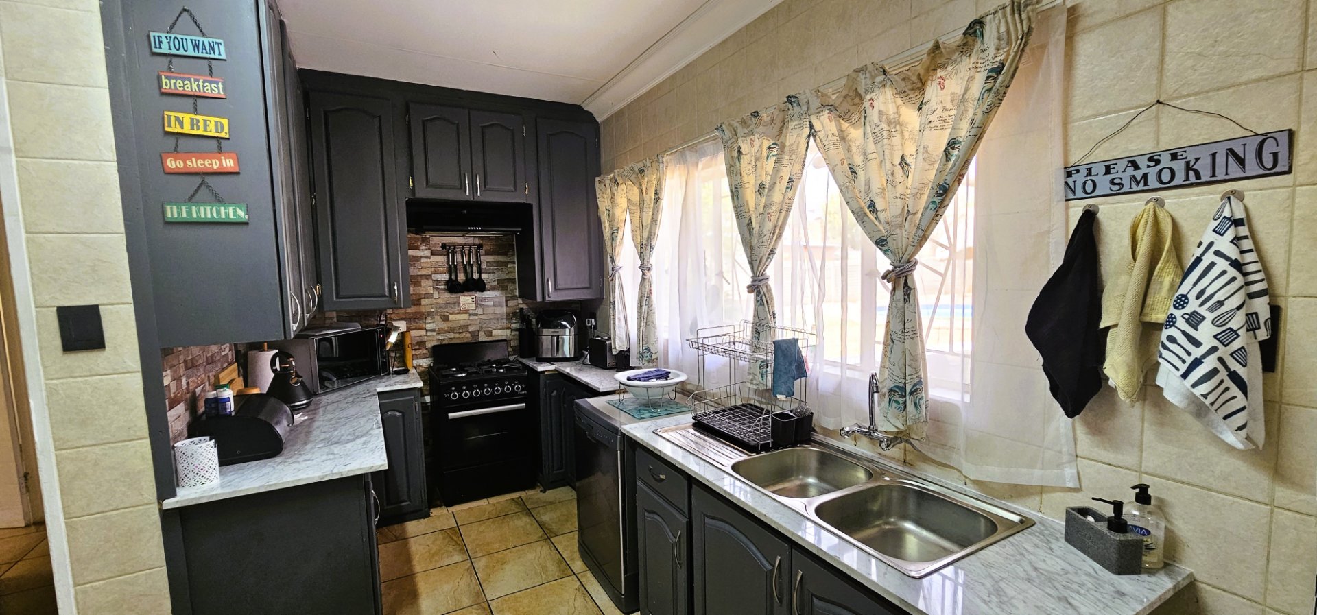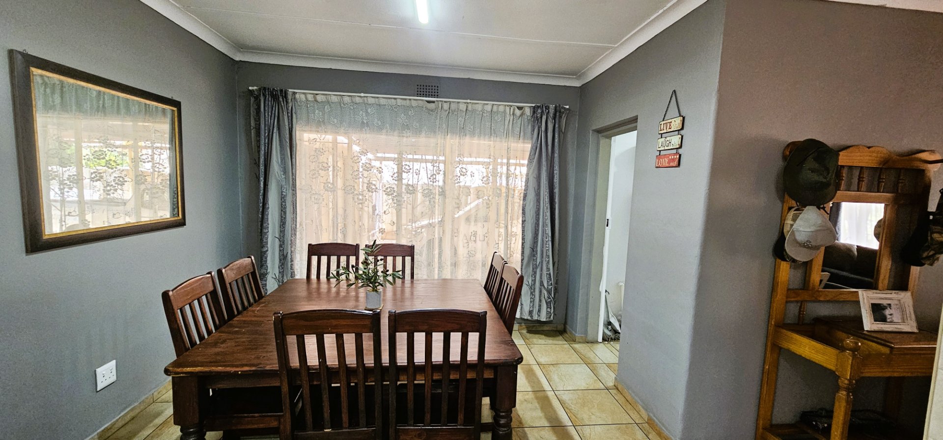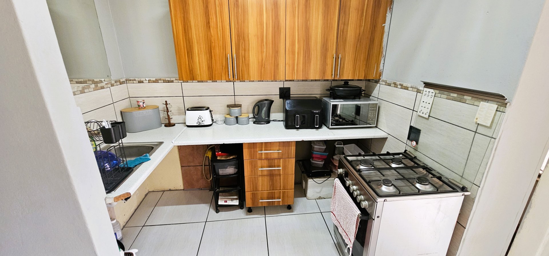 3 well-sized bedrooms, all tiled with built-in cupboards – the main bedroom is especially generous.