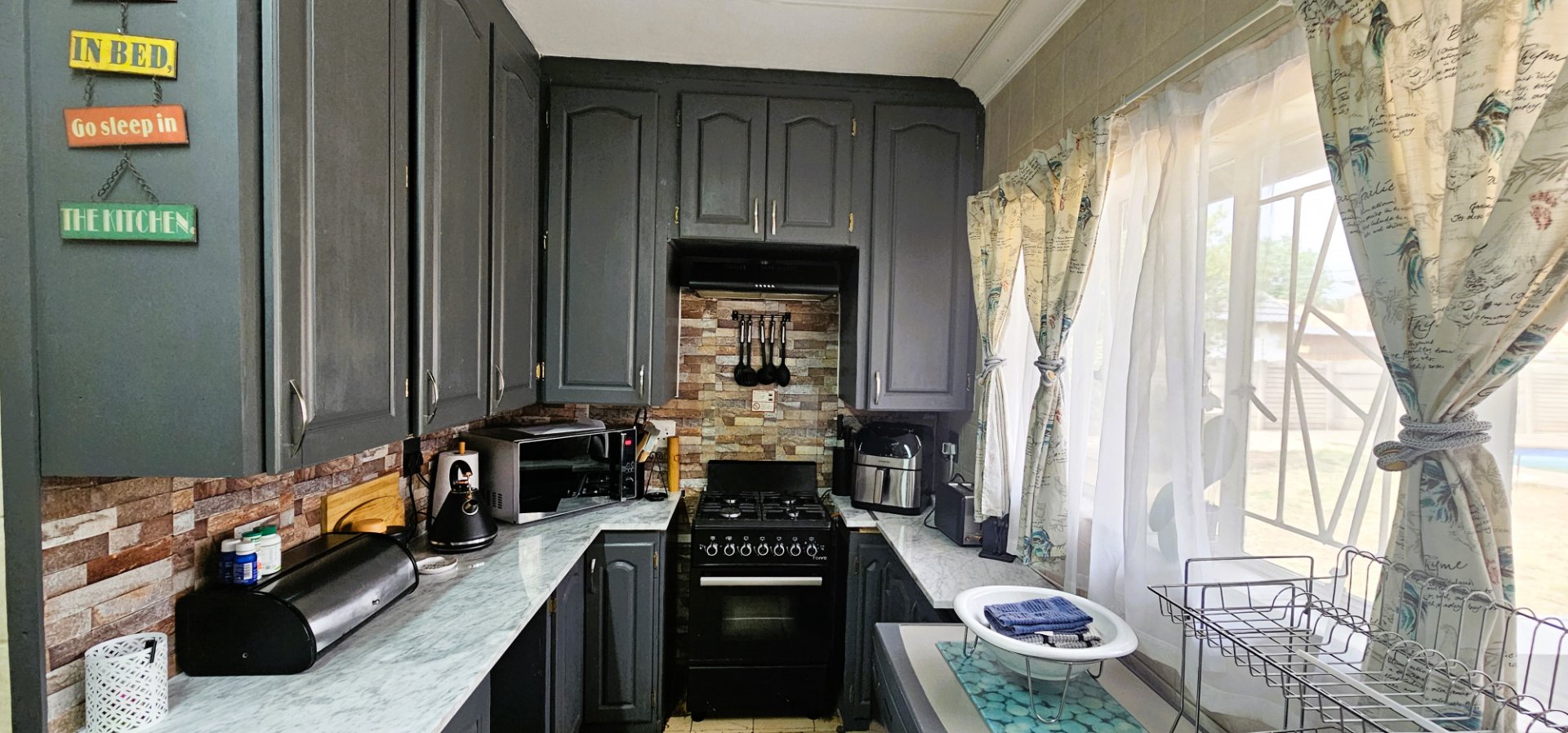An open-plan kitchen and dining room with a recently upgraded kitchen, featuring stylish grey granite tops, a gas stove & oven, plus a large separate scullery/laundry.