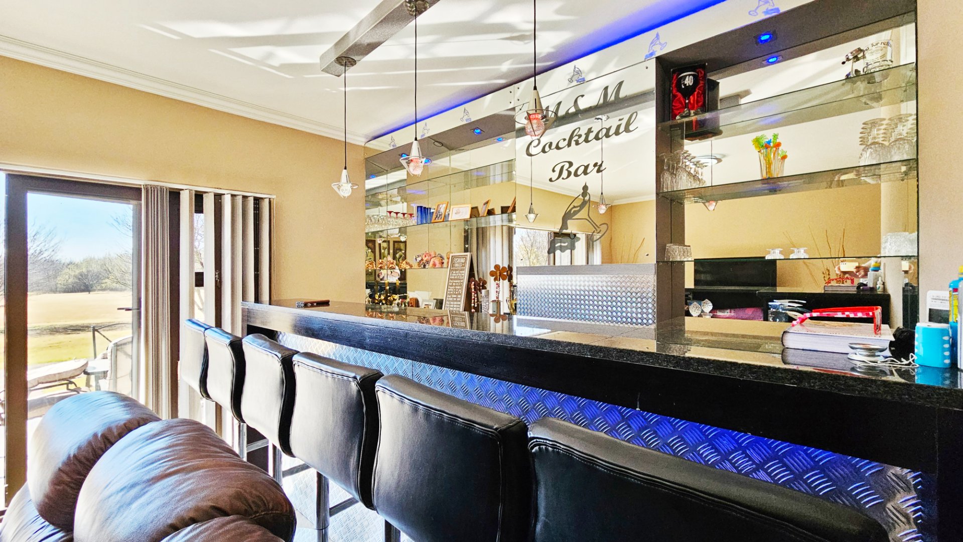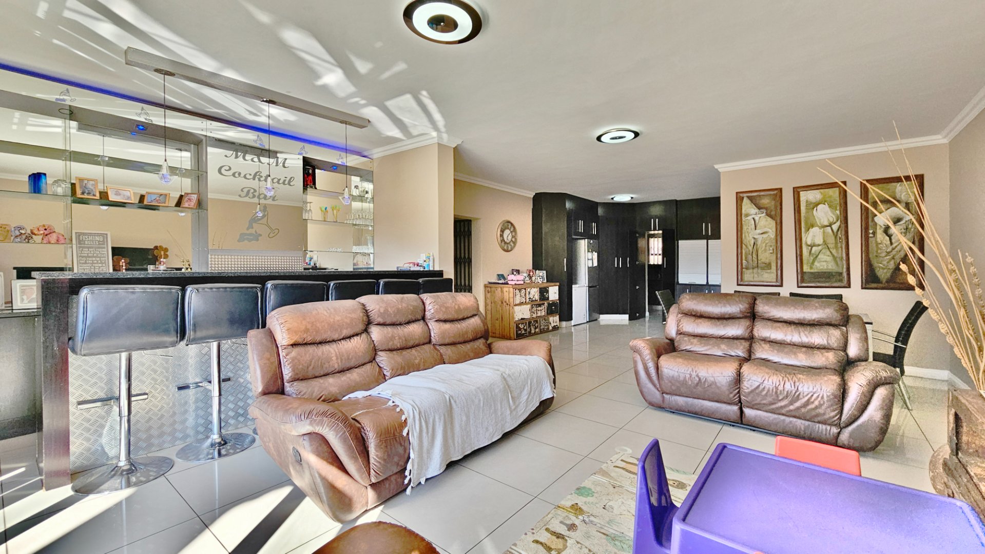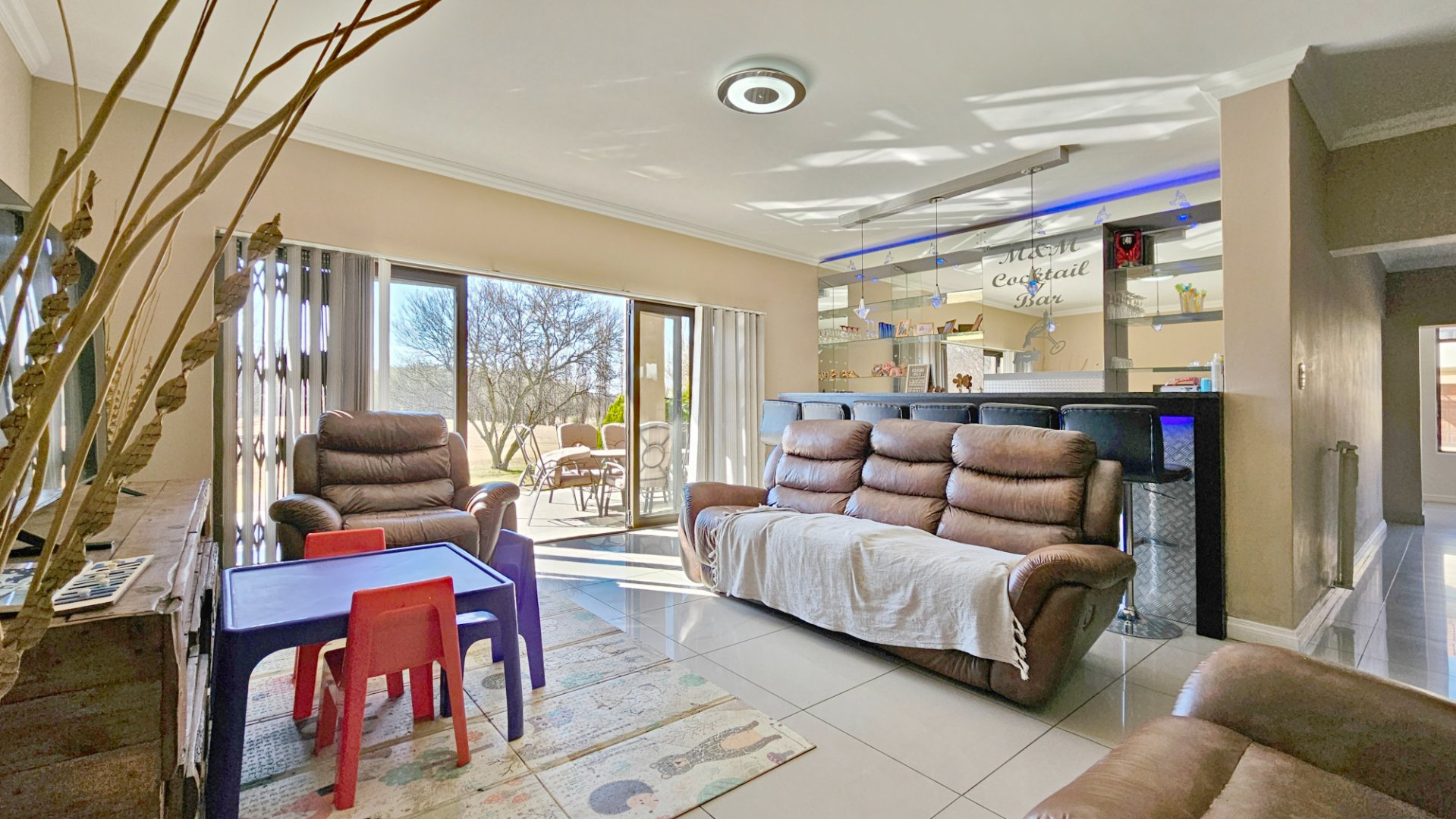 It features a double automated garage with a double carport, and a large patio off the living areas. Accommodation is arranged over two floors, downstairs offering a beautifully fitted contemporary kitchen with a separate scullery that is open plan to vast living space with a fitted bar that leads off to the patio via stack-away alluminium doors, and a separate kid’s playroom (or additional fourth bedroom) with a full bathroom.