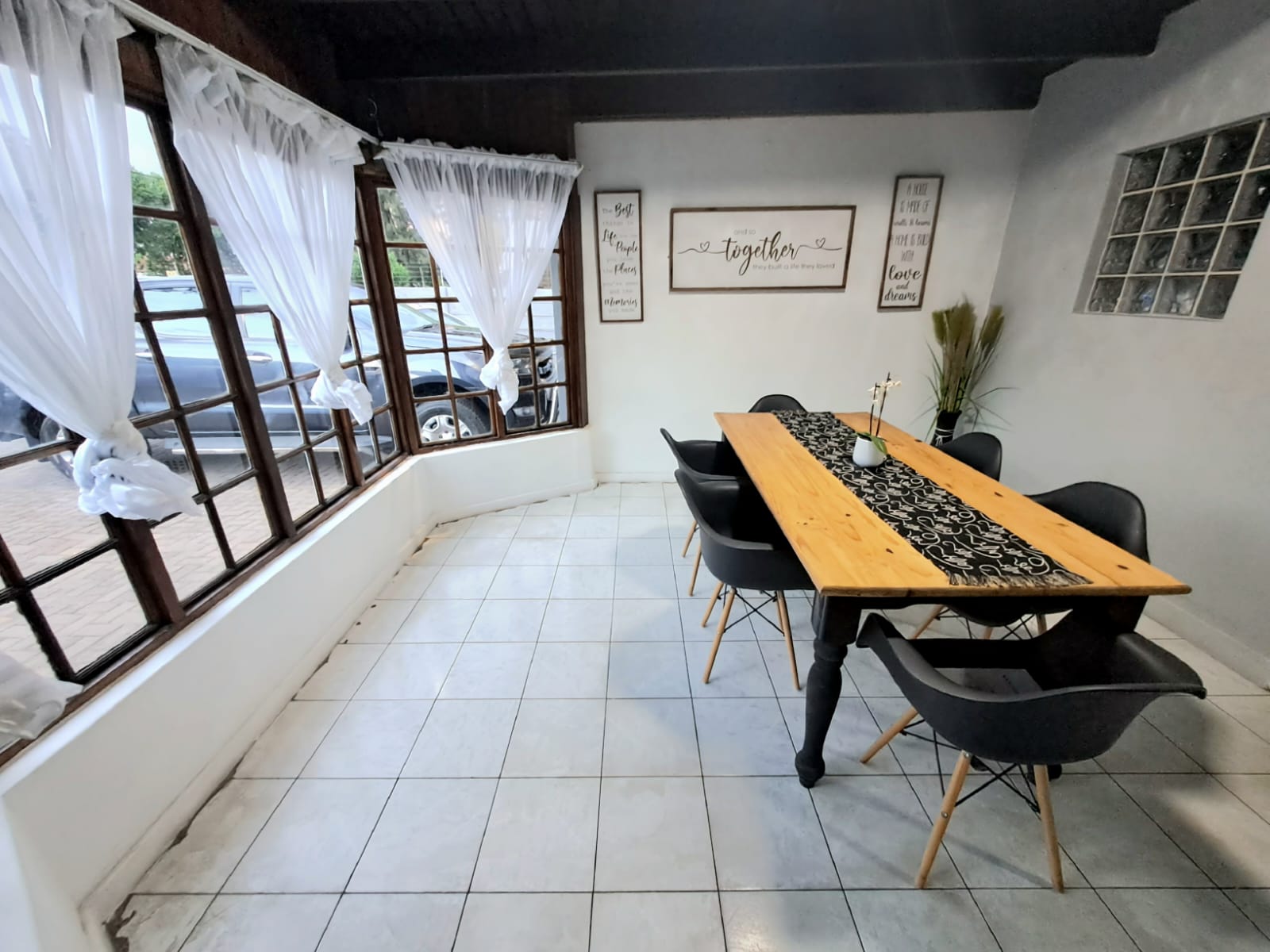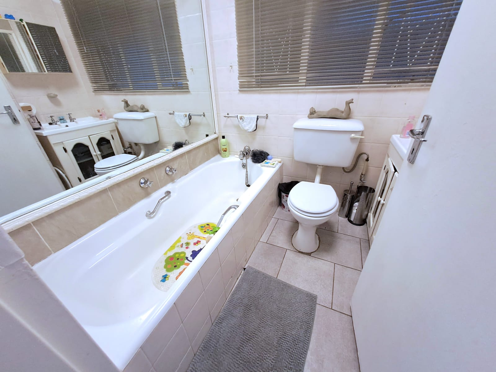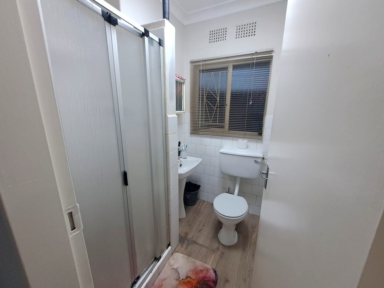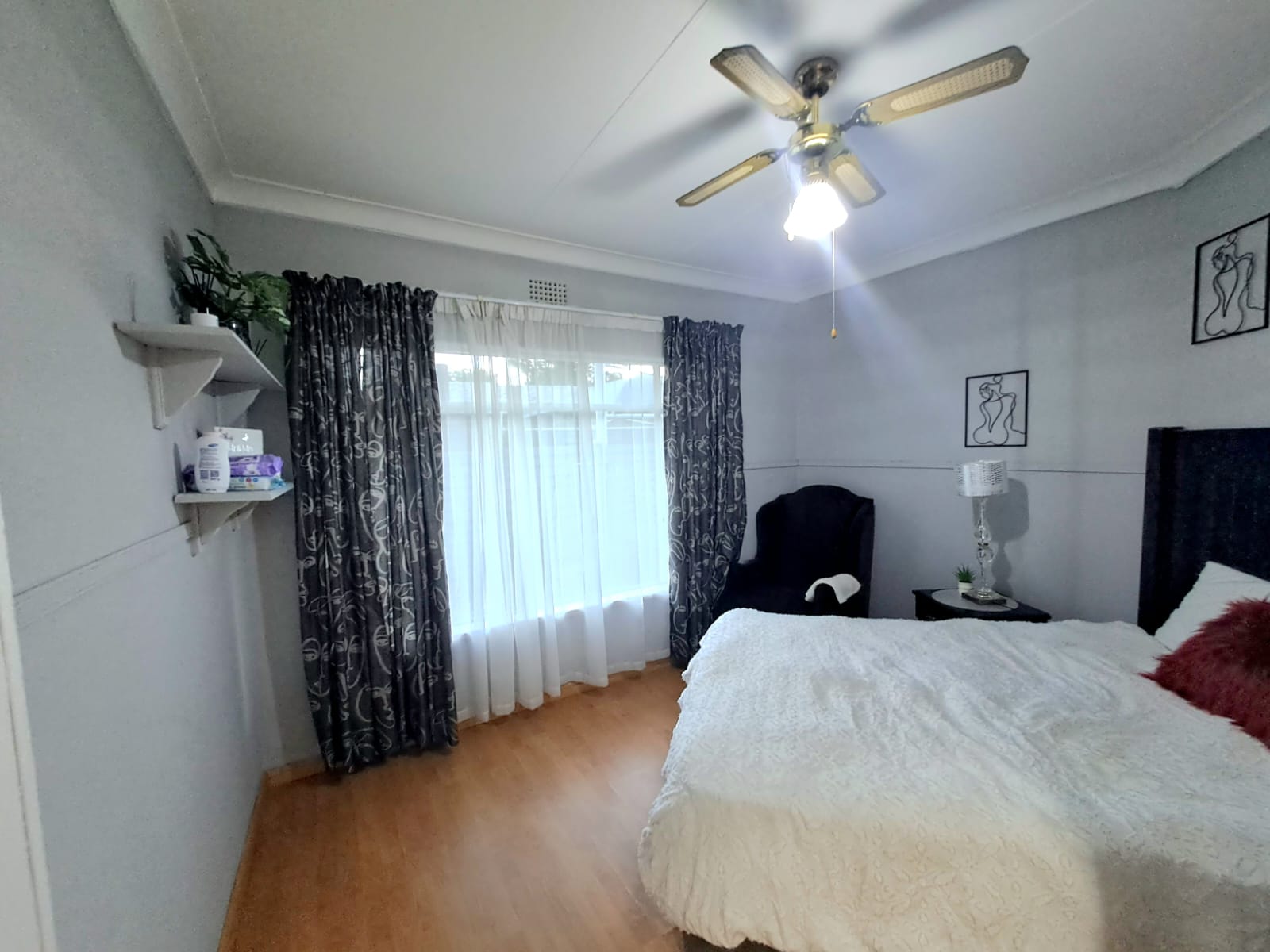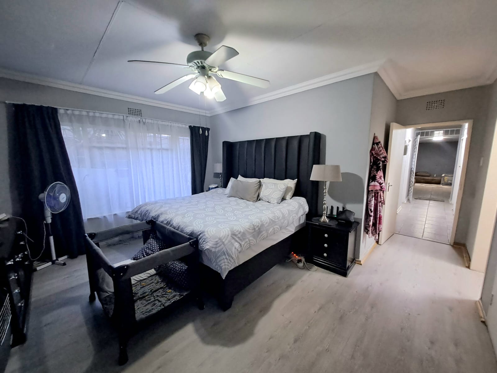 There are 3 bedrooms with laminated floors and built-in cupboards, plus 2 bathrooms.
