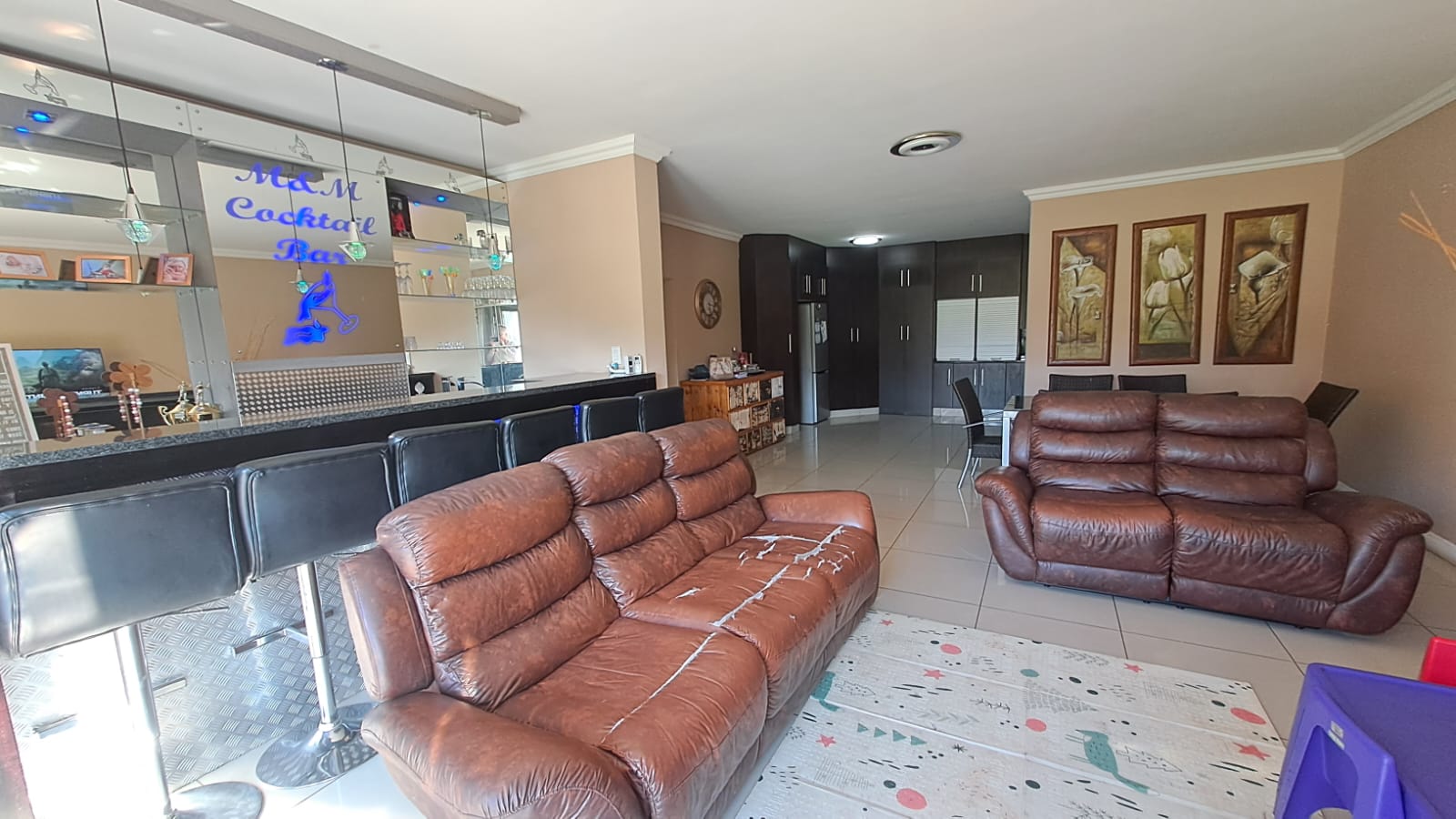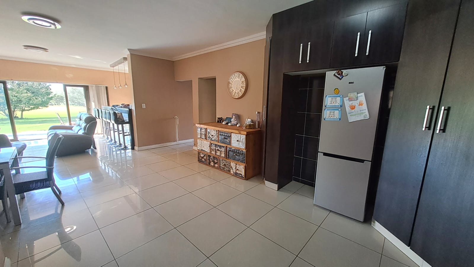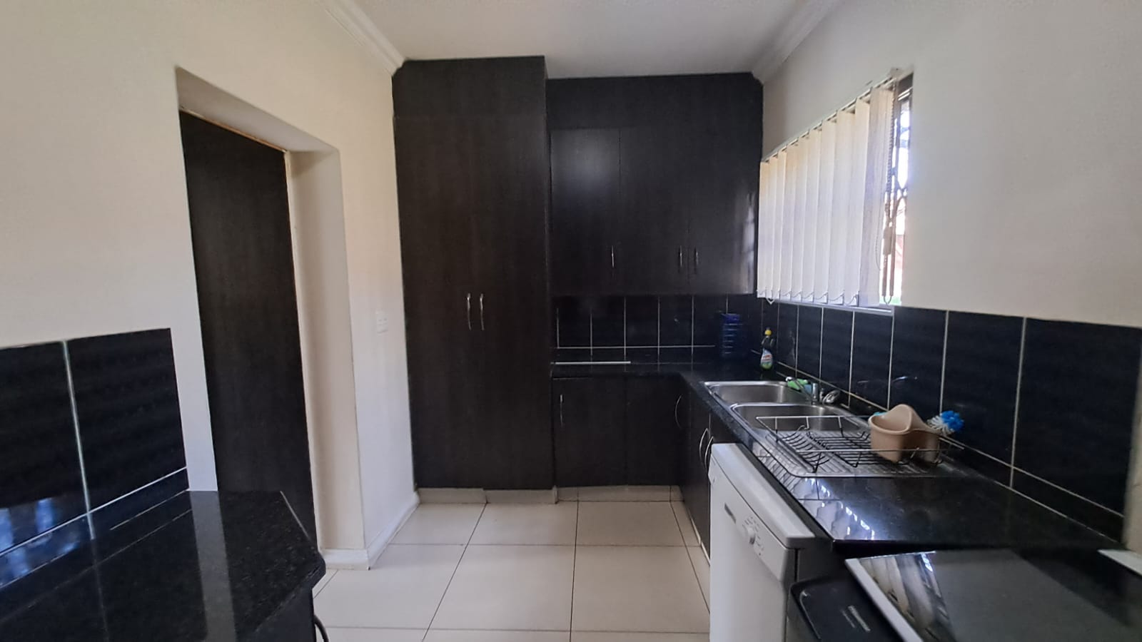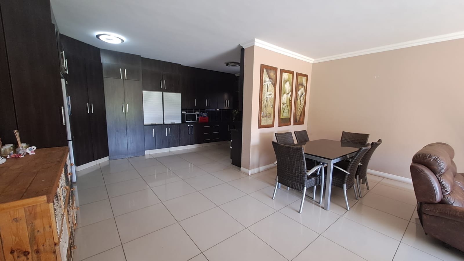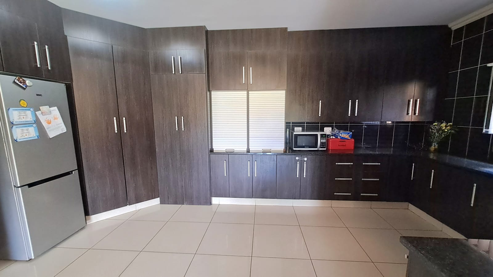 The open-plan kitchen, living room, and dining room area is spacious and modern, with ample cupboard space and granite tops in the kitchen. It also has a convenient scullery and laundry area.