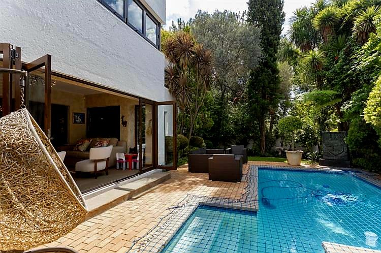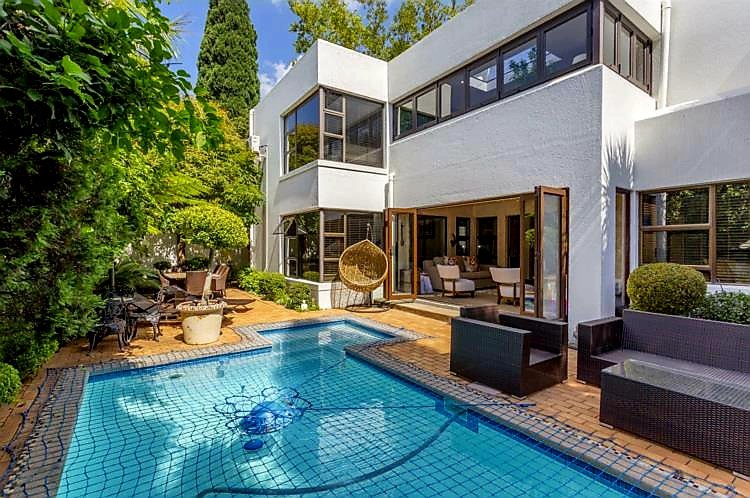 this one-of-a-kind cluster affords unsurpassed quality and a superior lifestyle. Upstairs offers 2 en-suite bedrooms, a private lounge and enclosed balcony, complete with fireplaces and stack back windows. The elegant master suite has a walk-in closet, sky light and bathroom with his and hers vanities, marble tiles, a spa bath and much more. The property has an exceptional standard of interior finish, from the Carol Boyes towel rails and taps .Crystal lights to engineered wood floors throughout. Downstairs is the entrance, lounge and dining room leading to the patio, pool and a wraparound garden. There are 2 more bedrooms with a full bathroom and a fully fitted study. The well-fitted kitchen has ample countertop space for catering and entertaining. Exceptional security over and above that of the Estate.