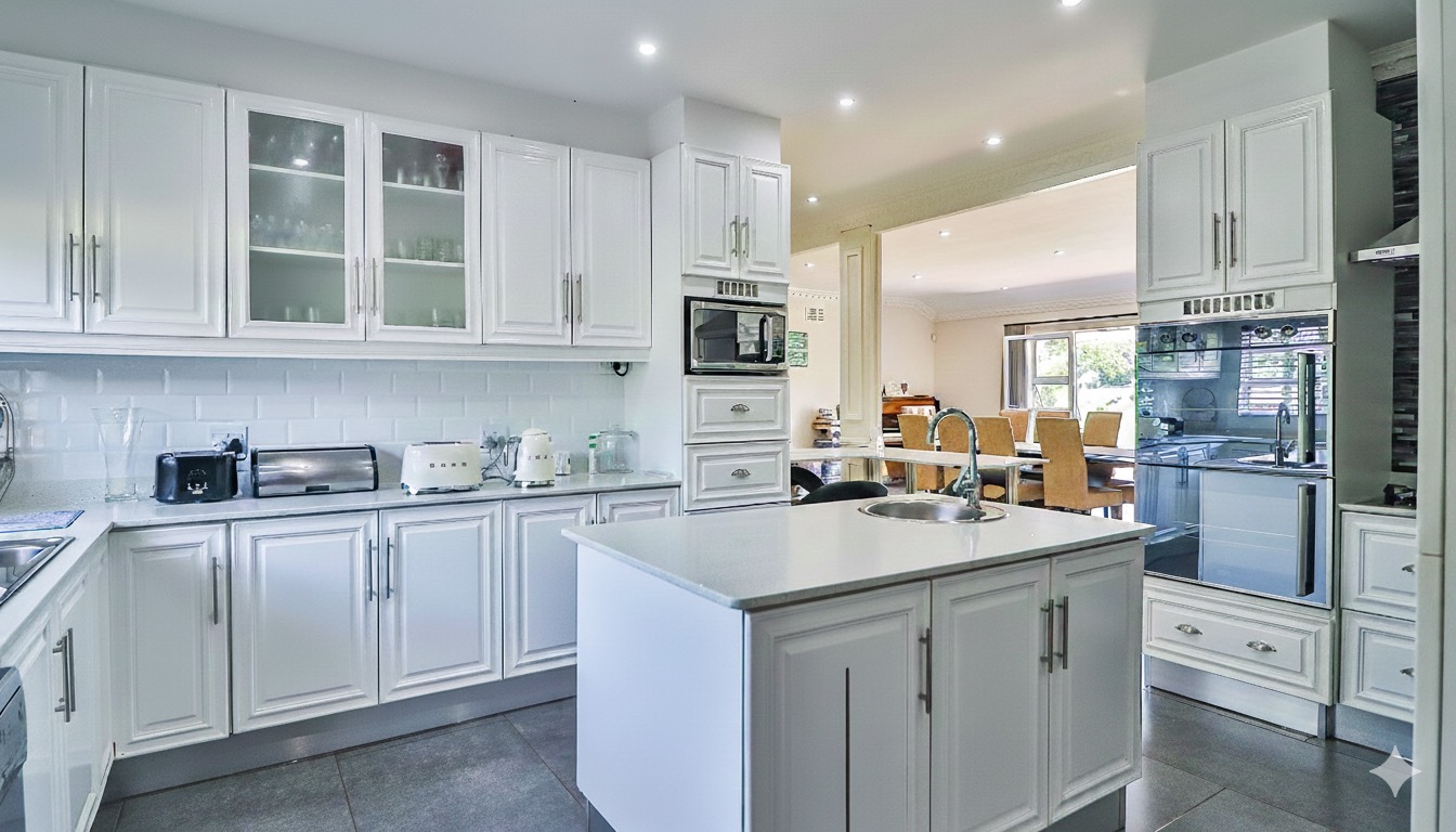 The modern kitchen with white granite counter tops, centre island with prep bowl for extra convenience is separated into functional zones and includes a new eye level double oven. There is a separate laundry room or external storeroom, offering practical utility space.
