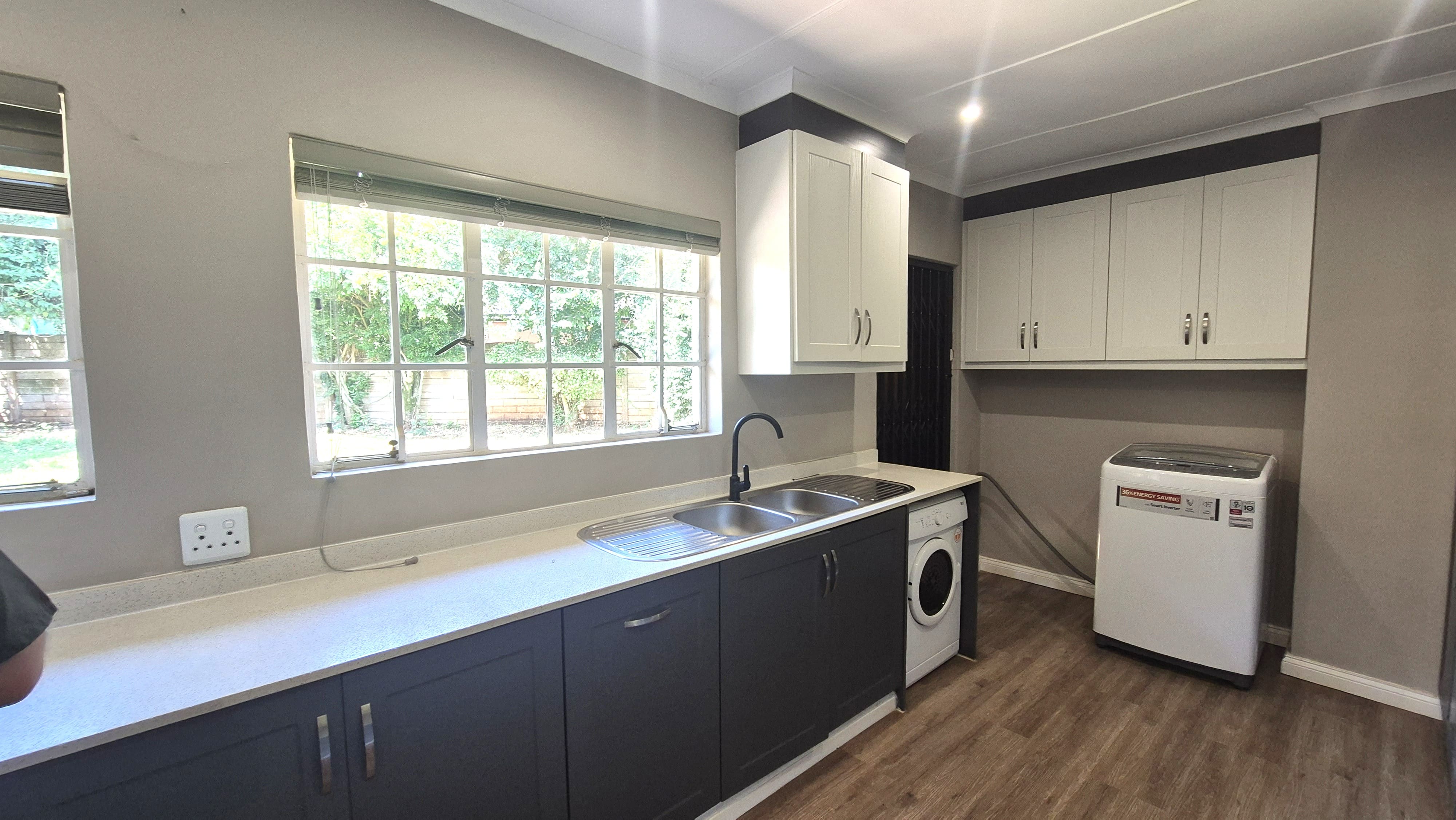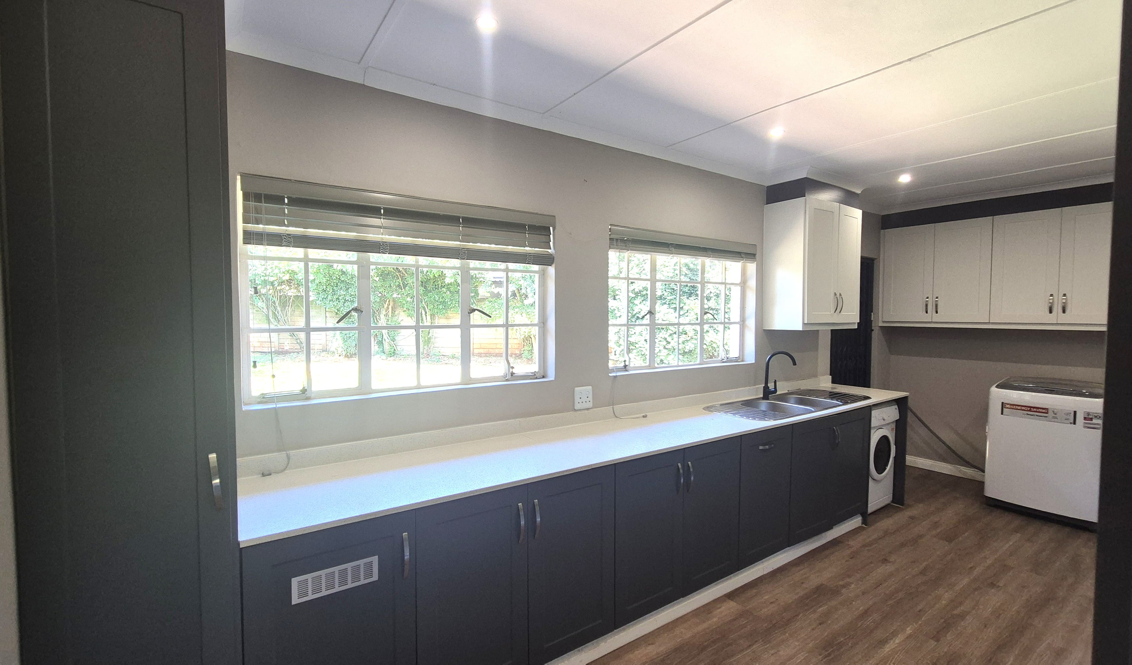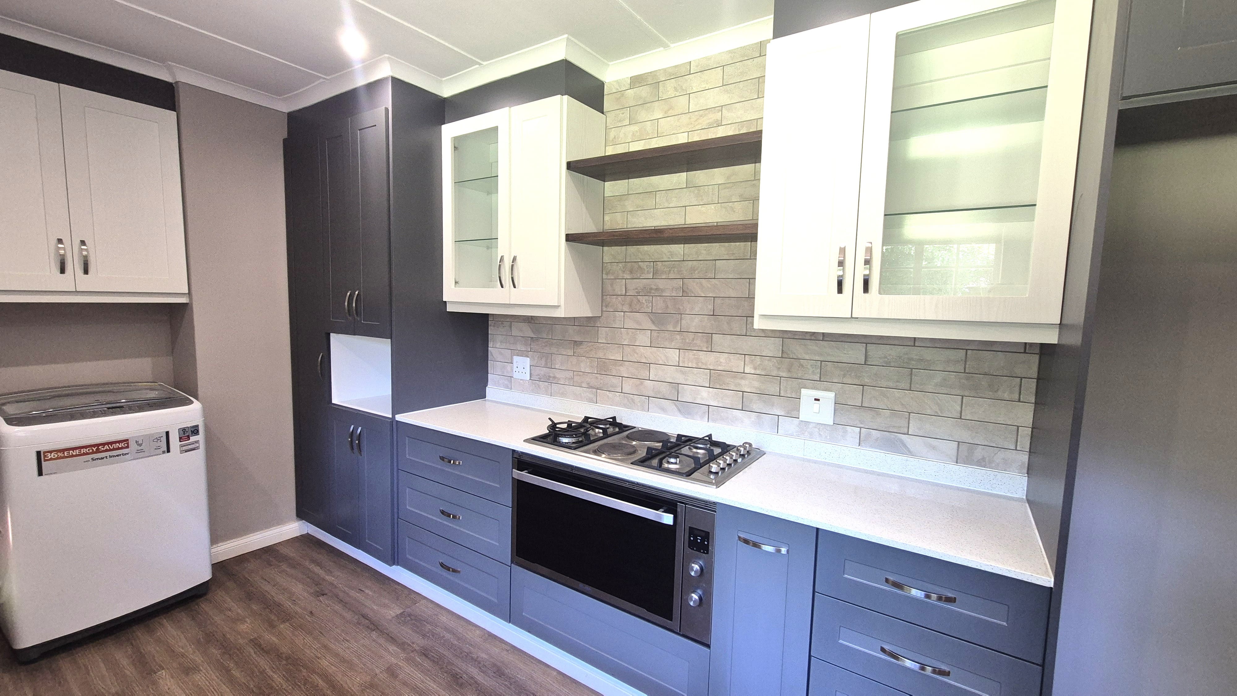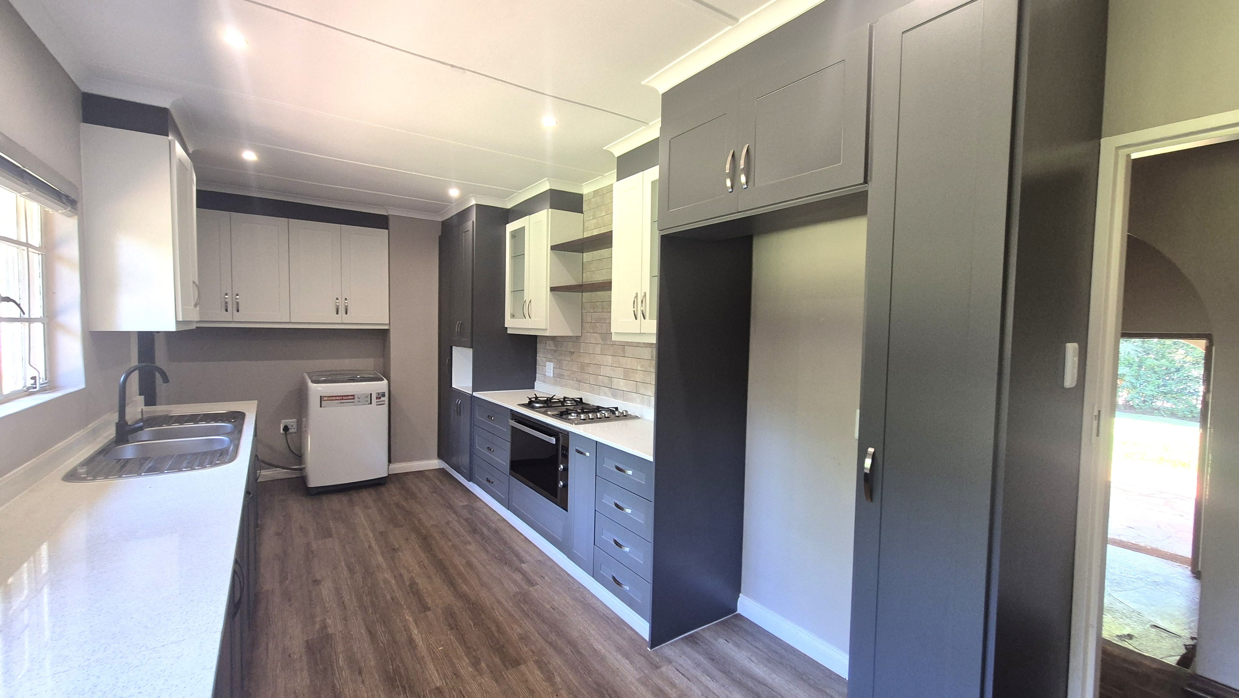A few steps up from the entrance hall leads to a modern, brand-new kitchen. It has Caesarstone countertops, generous cupboard space, a gas hob, fitted oven and a double sink. The layout is practical and works well for everyday use.