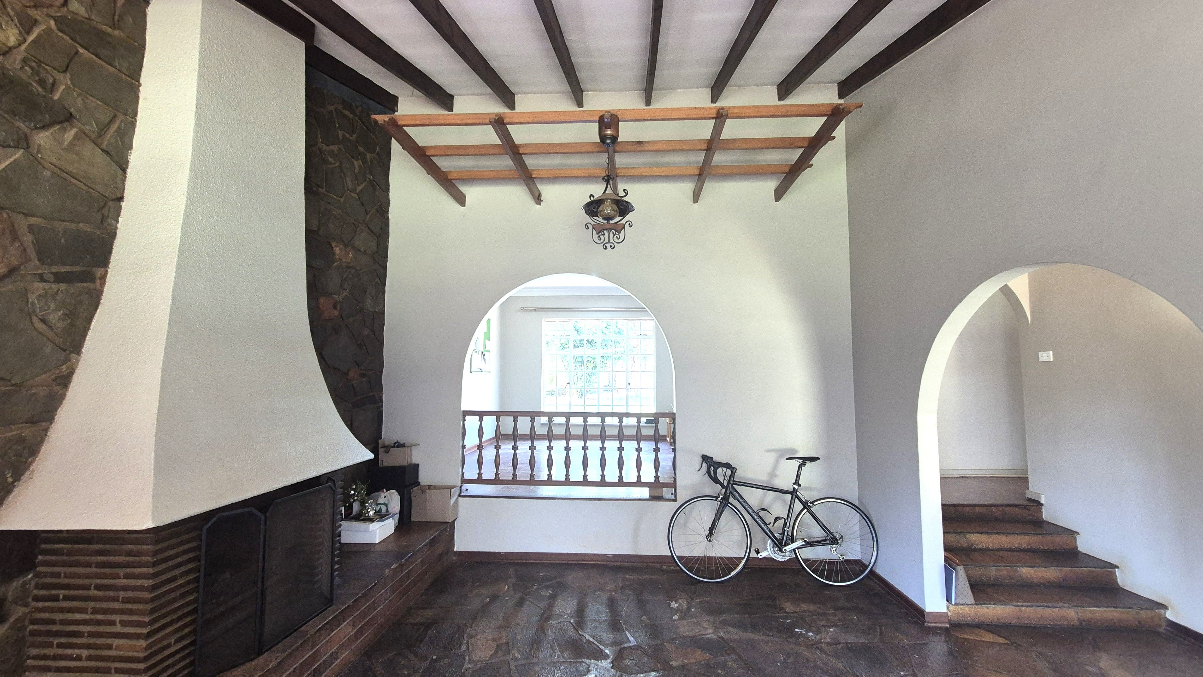 To the left of the entrance is the lounge. It feels warm and inviting, with exposed beams, parquet flooring and a facebrick fireplace as a central feature.