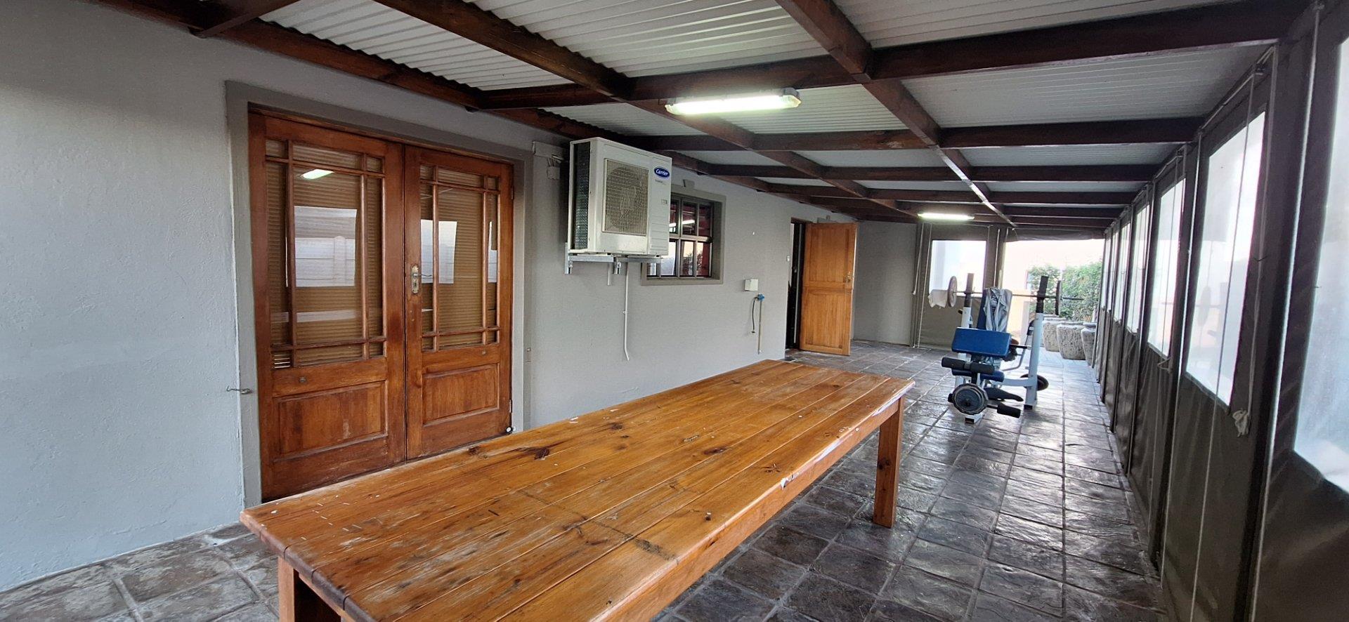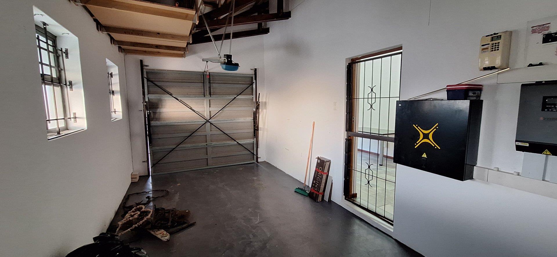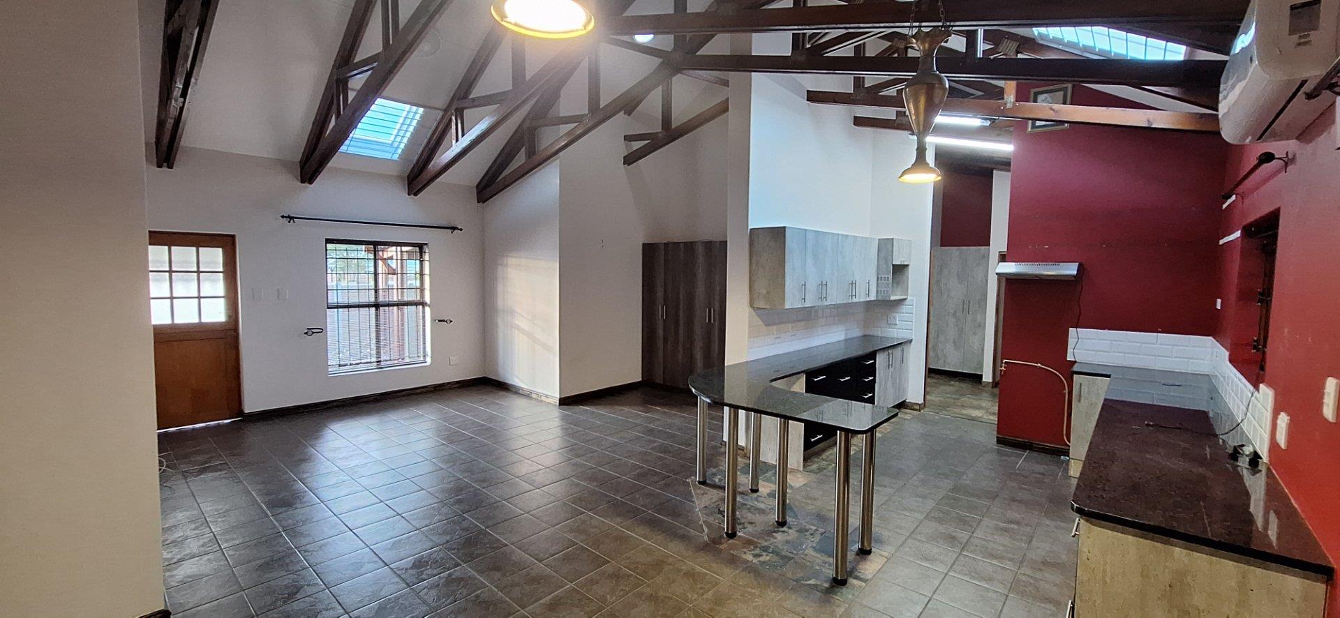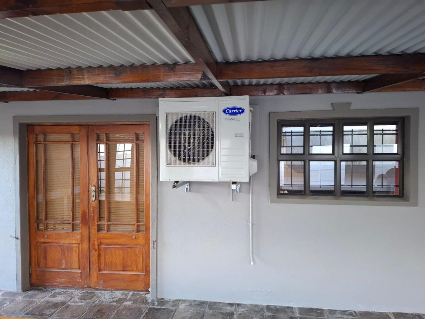 The home boasts an open-plan living and kitchen area with striking exposed beams, creating a spacious and airy atmosphere. A separate scullery and an extractor fan in the kitchen add to the functionality, while air conditioning in both the living area and main bedroom ensures year-round comfort.