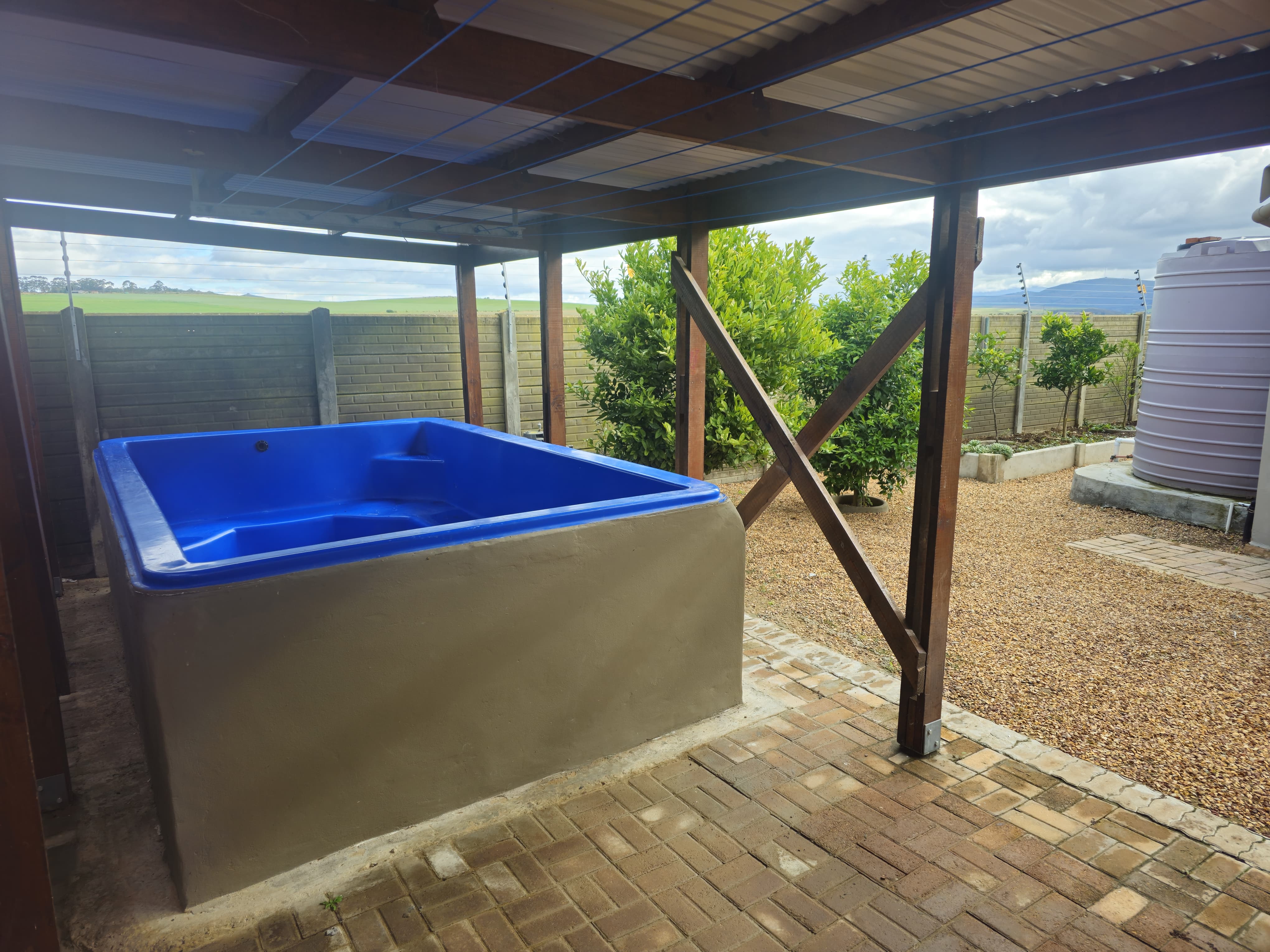 Designed for both practicality and enjoyment, the property features a covered entertainment area with a built-in braai and canvas sides that can be opened or closed depending on the weather. Adjacent to this is a heated splash pool and deck, providing a tranquil spot to unwind while overlooking the picturesque mountains and farmlands.