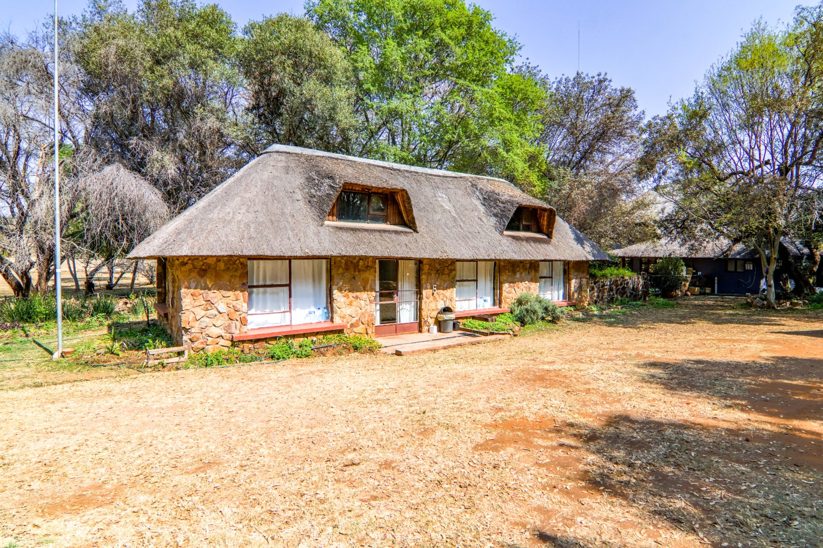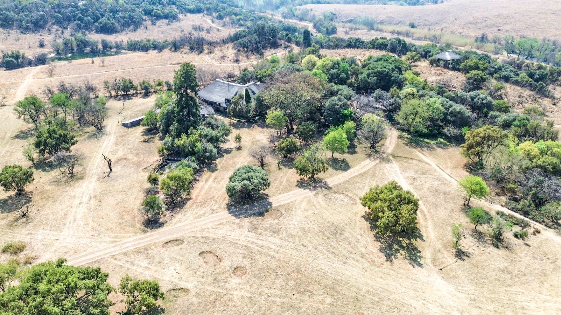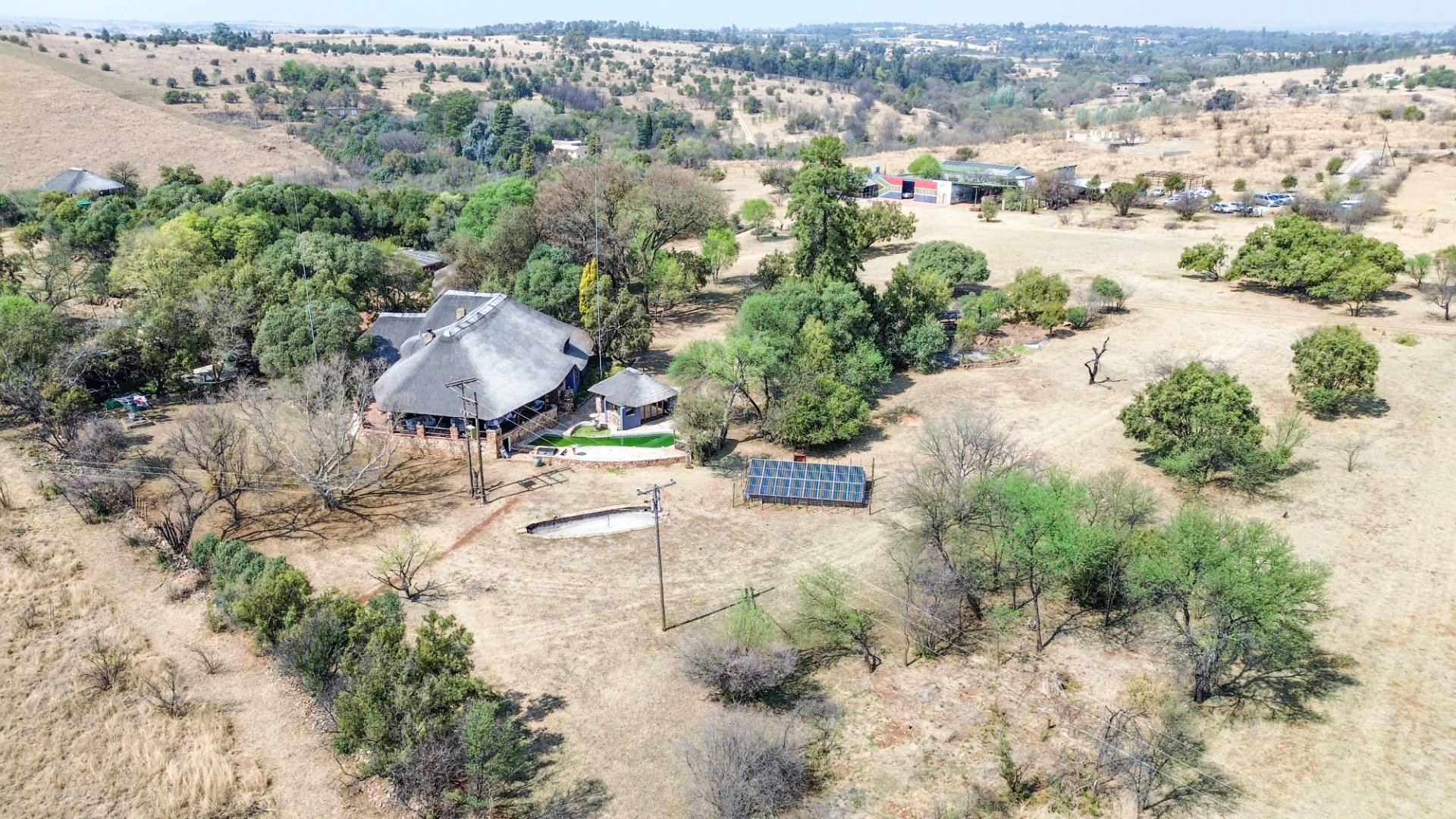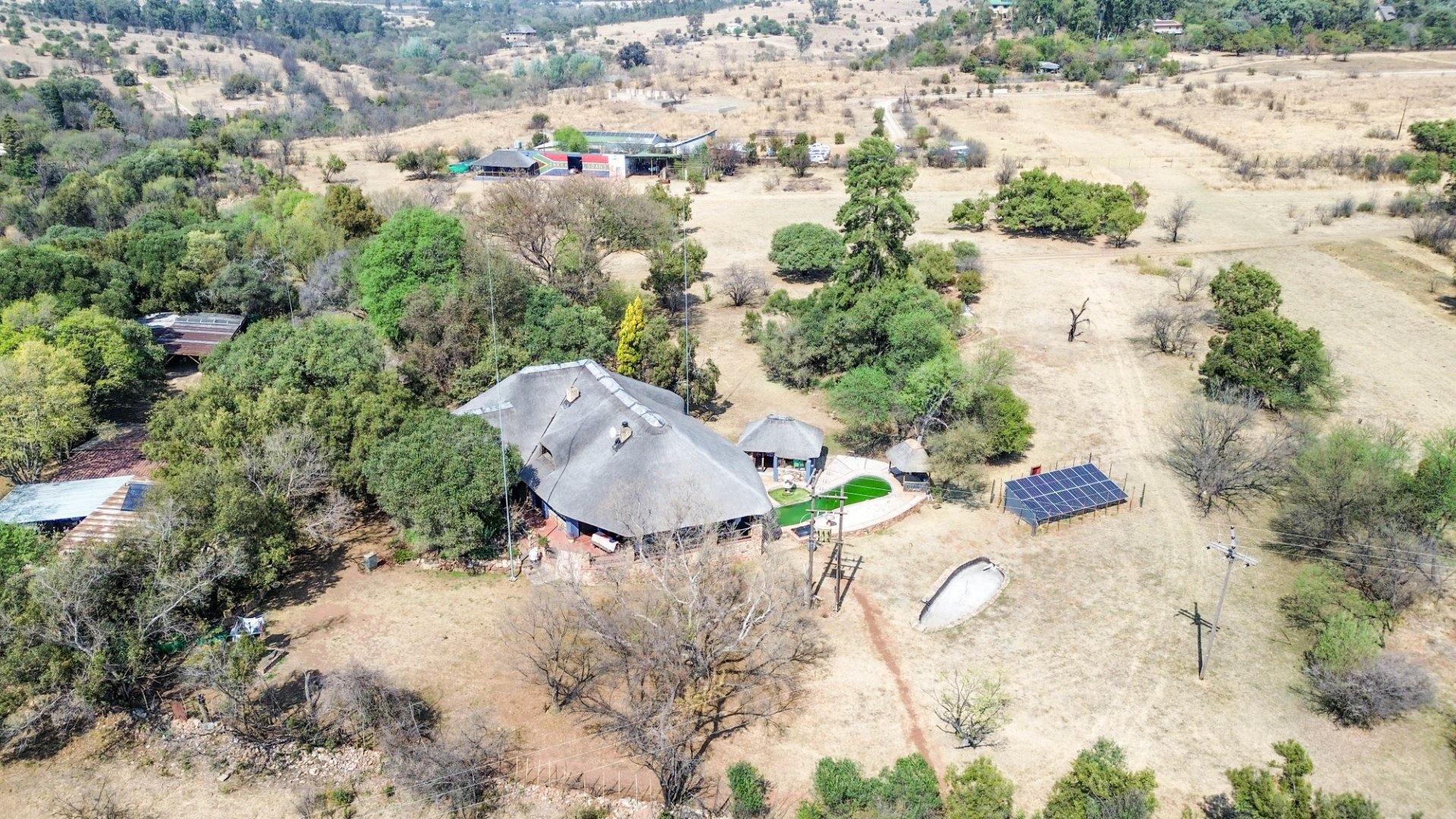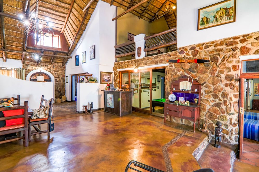 This lovely farm is 22 hectares of beautifully maintained land. There is a 500m2 thatched main house, plus a thatched cottage, workshop, garage and sheds, a total of 1 000m2. There is also a large 'hangar' big enough for a small plane or hang glider, pus a clubroom.