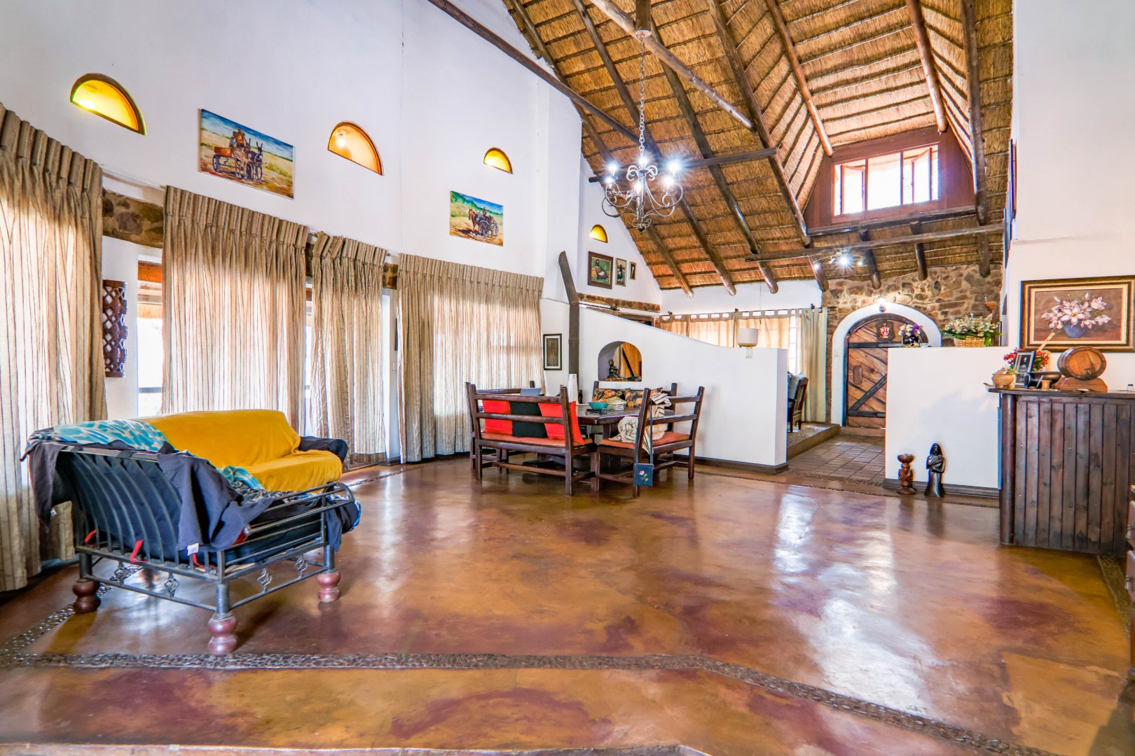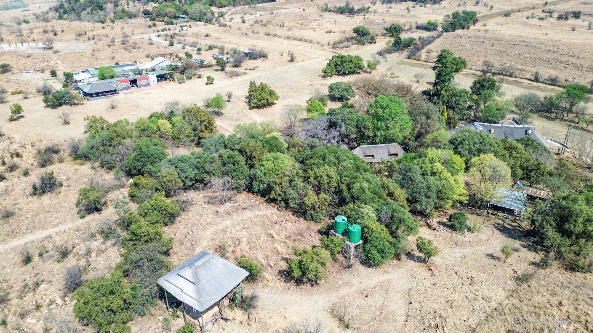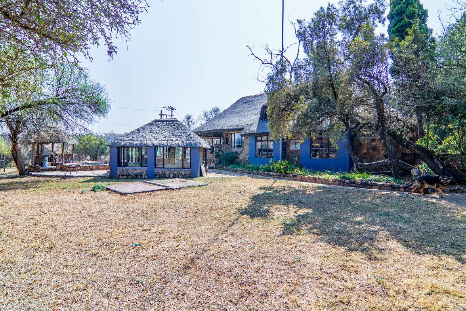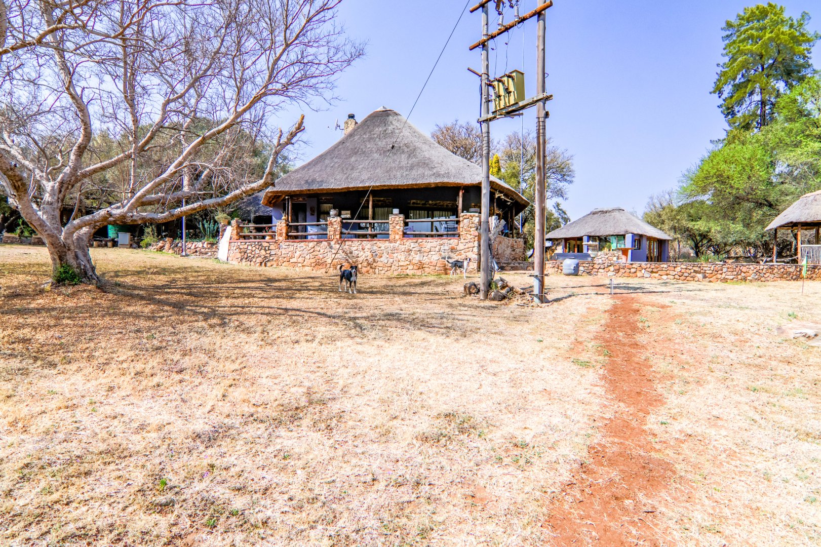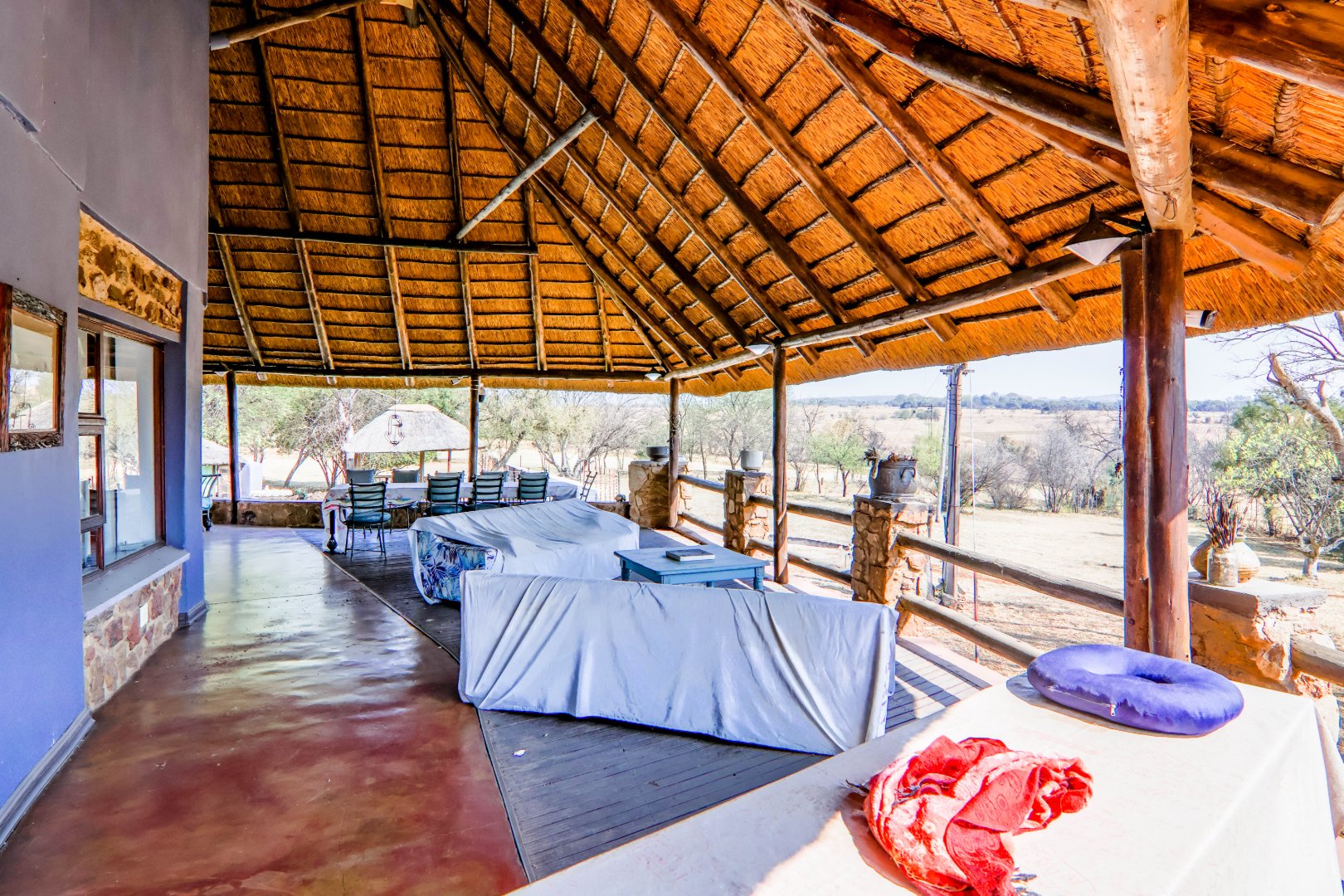This lovely farm is 22 hectares of beautifully maintained land. There is a 500m2 thatched main house, plus a thatched cottage, workshop, garage and sheds, a total of 1 000m2. There is also a large 'hangar' big enough for a small plane or hang glider, pus a clubroom.