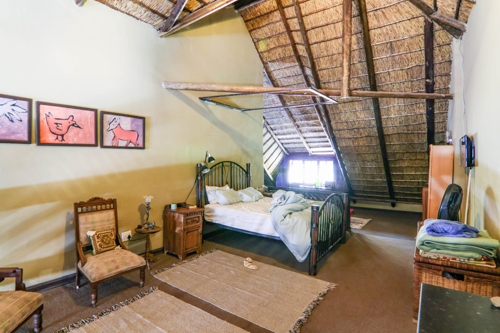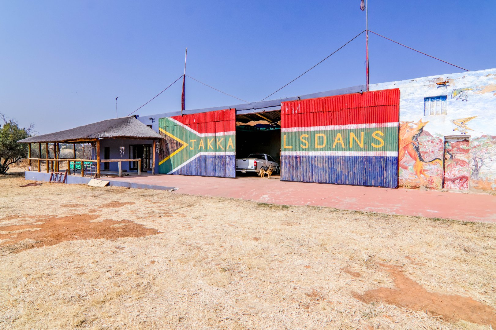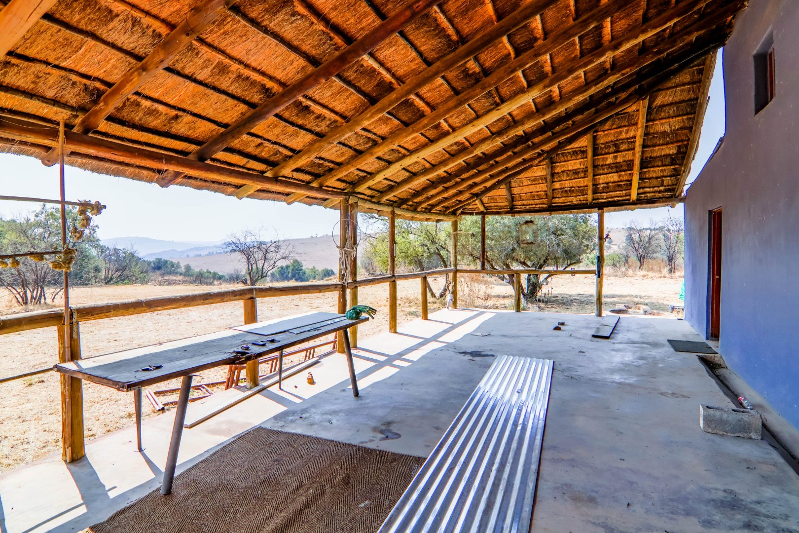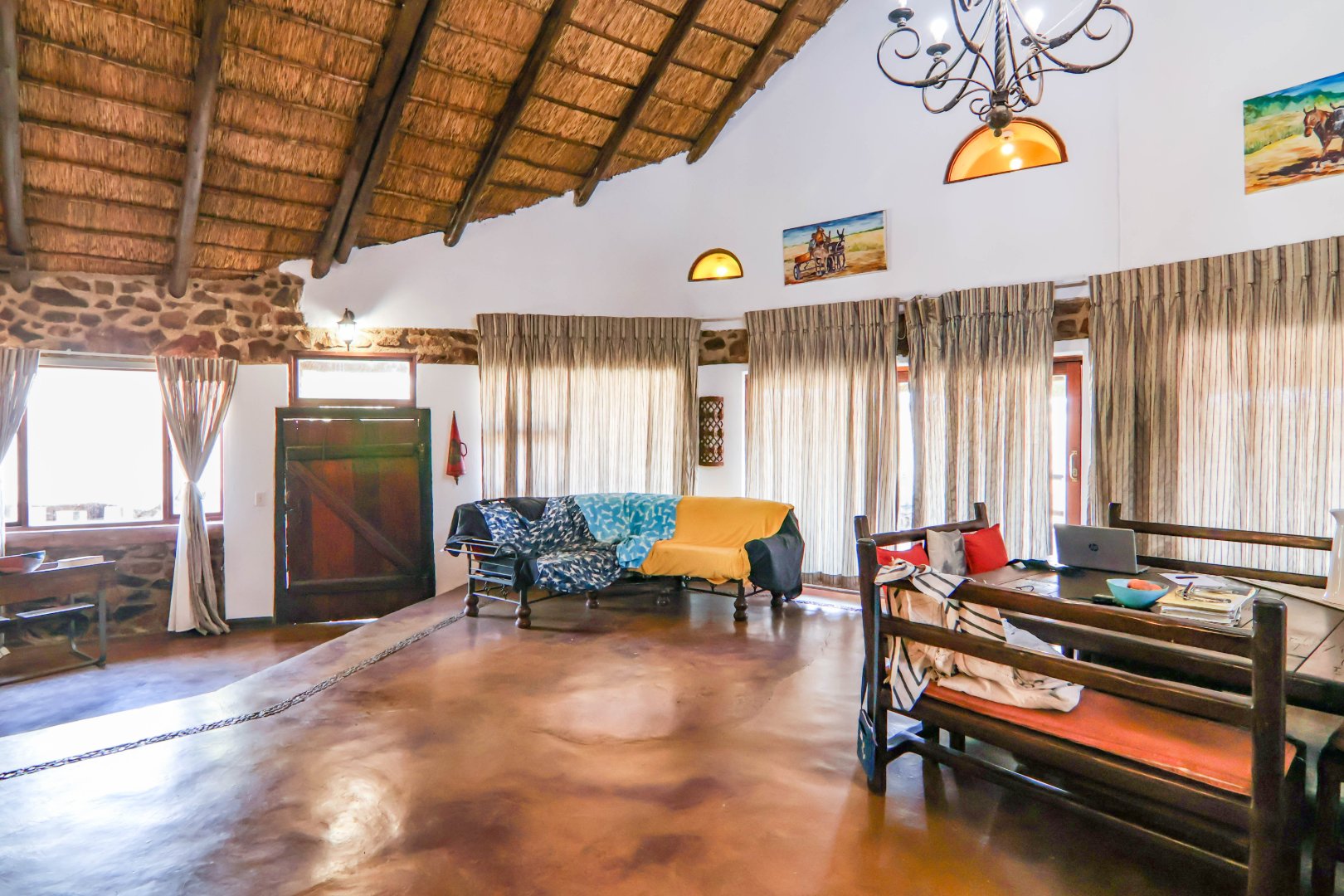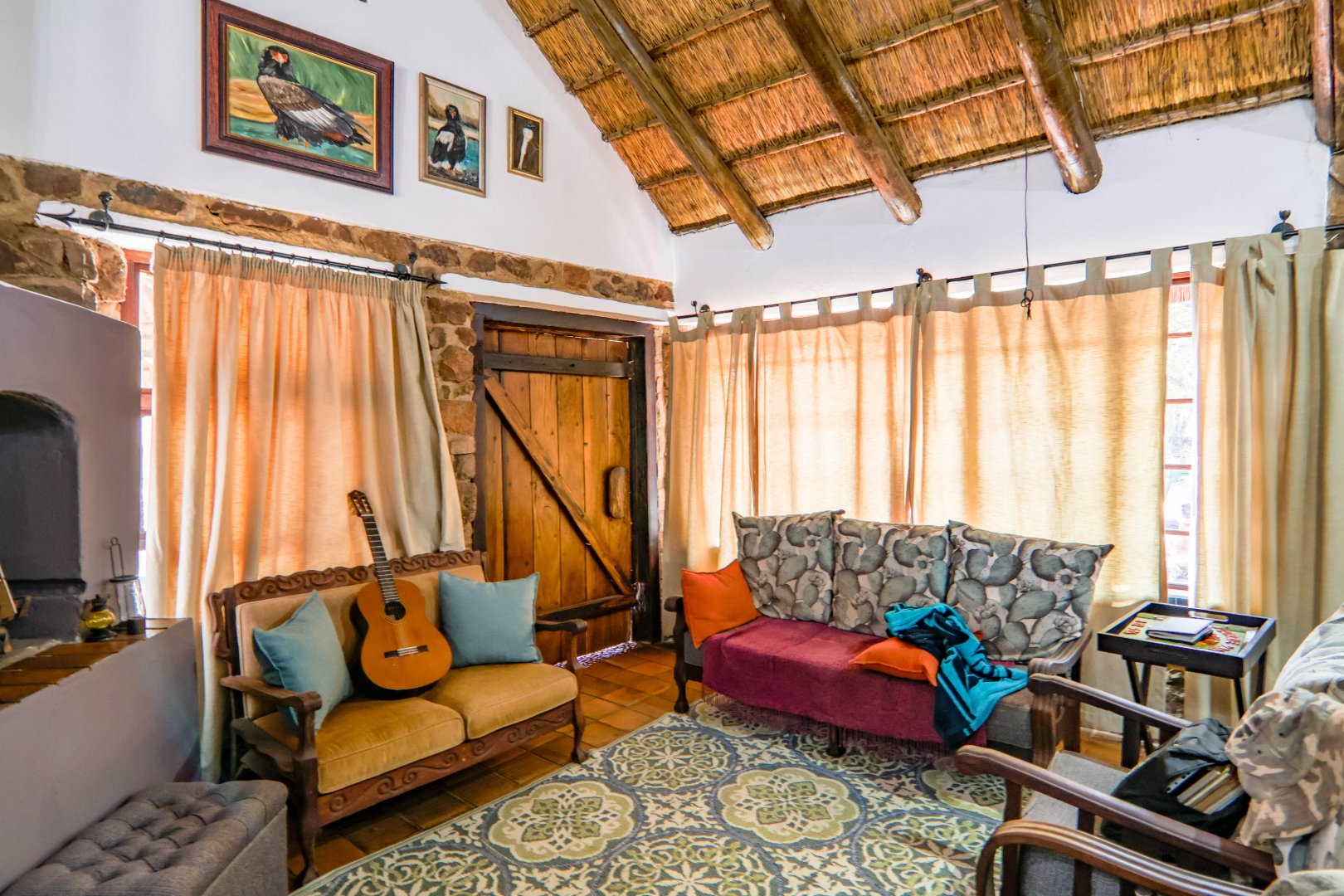 This lovely farm is 22 hectares of beautifully maintained land. There is a 500m2 thatched main house, plus a thatched cottage, workshop, garage and sheds, a total of 1 000m2. There is also a large 'hangar' big enough for a small plane or hang glider, pus a clubroom.