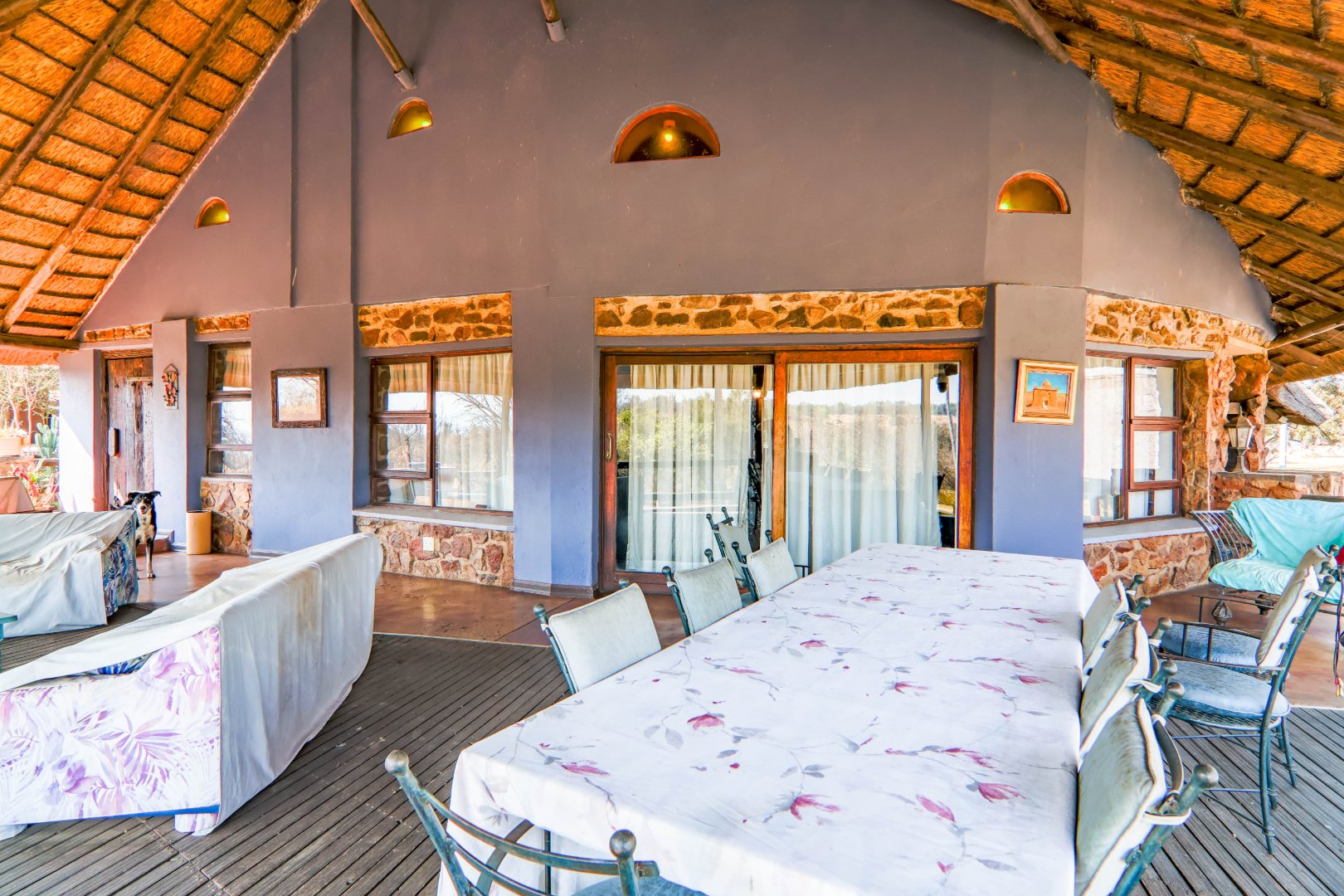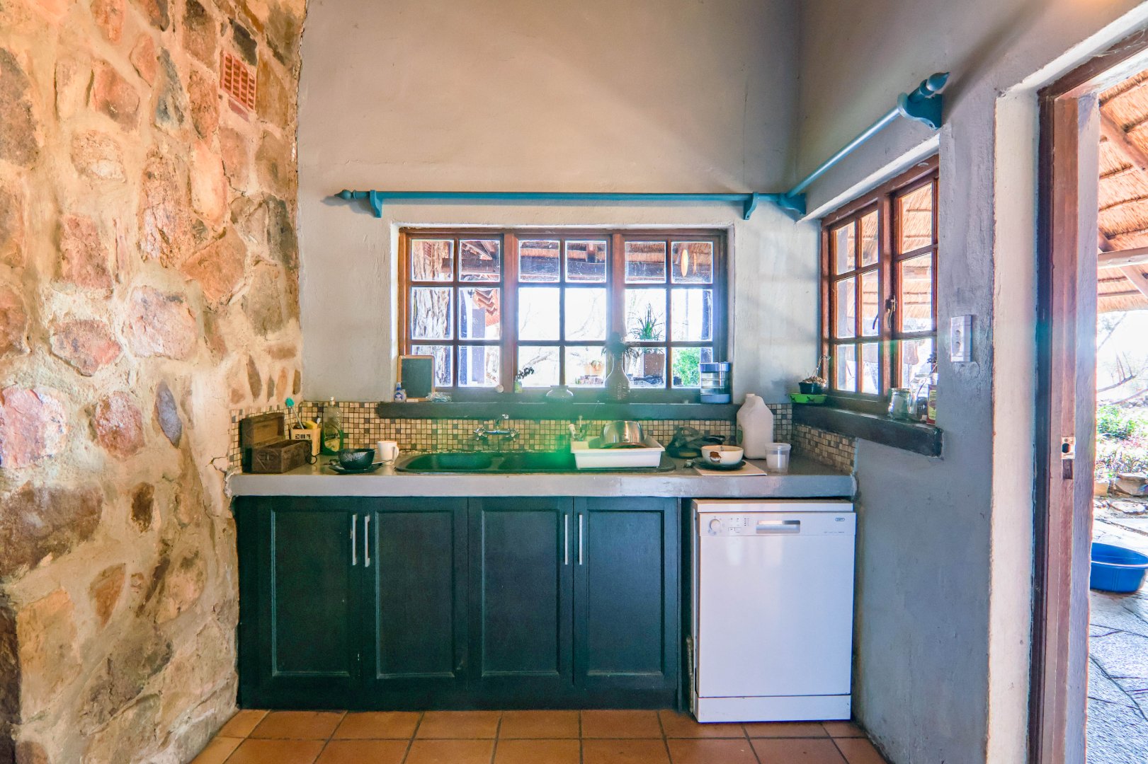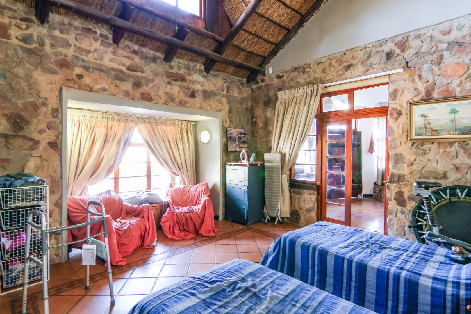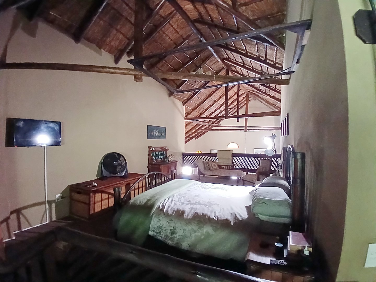 The property has a borehole, which is never used! The family harvest rainwater, which is sufficient for their needs, backed up by a number of storage tanks. For irrigation, there is a pump from the river. The property is fenced and has Roboguards and cctv for security. Solar panels provide 40-60% of power requirements, backed up by a single-phase Eskom supply. a Smart Power 15kva inverter manages power usage.