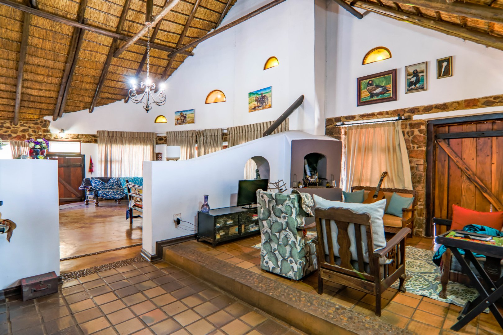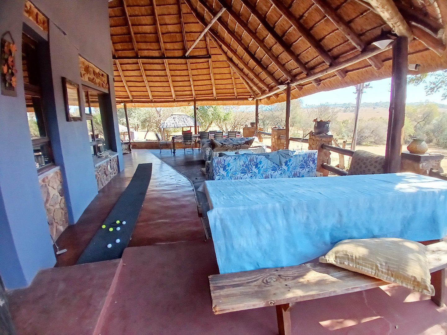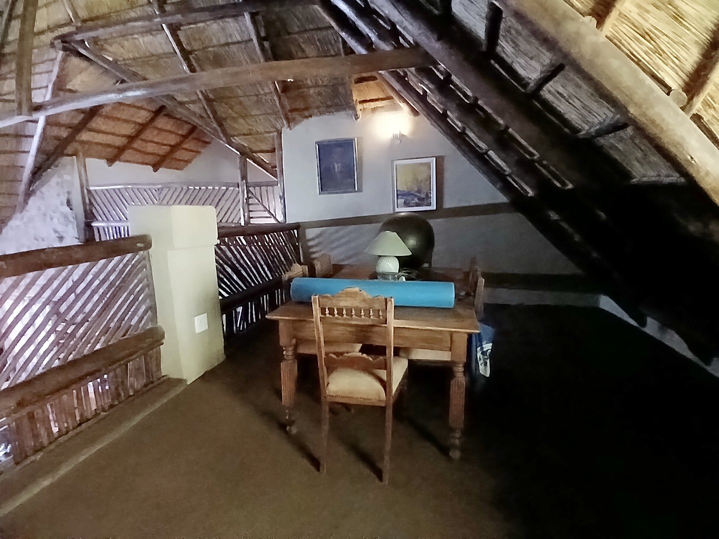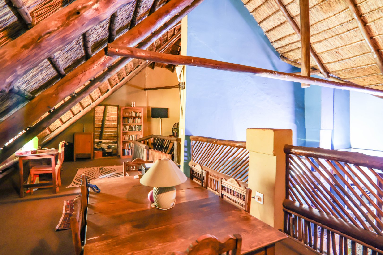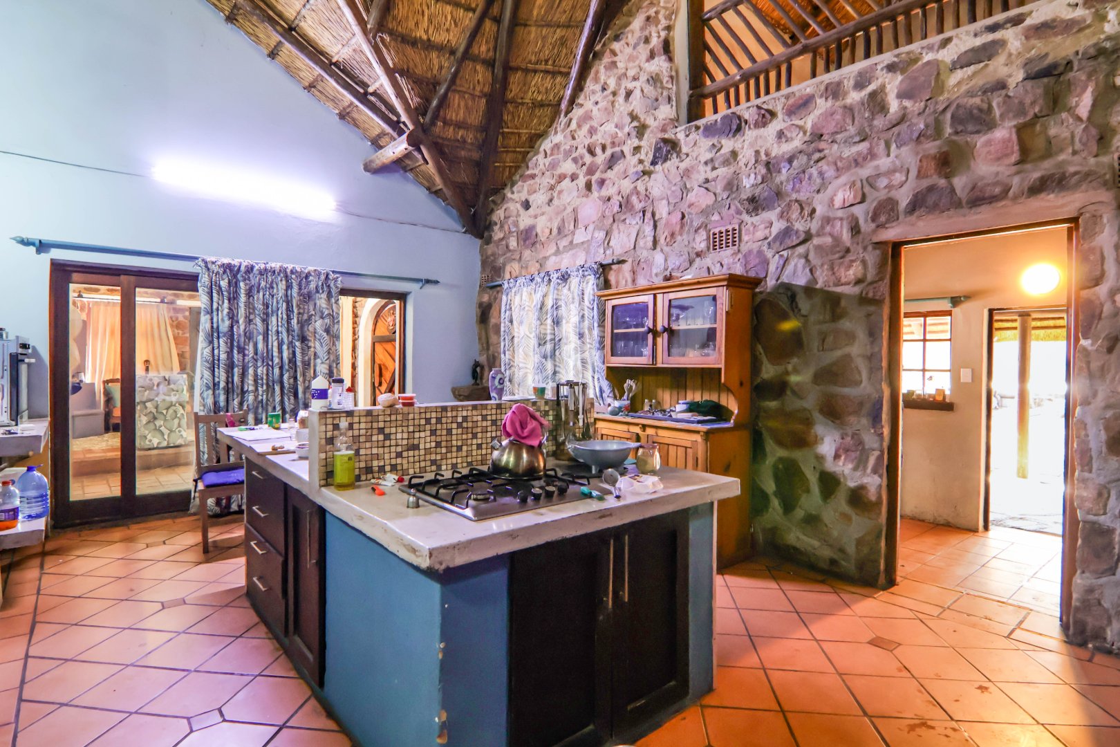 The main house is 3 bedrooms, 2 bathrooms (main en suite) downstairs, plus a large bedroom and study area upstairs, overlooking the kitchen and lounge area. Plus a snooker room, housing a full-size snooker table. The kitchen is charming, with a centre island and fireplace. The lounge and dining area are open plan, with high thatched roof.. And a small gym for the more energetic.