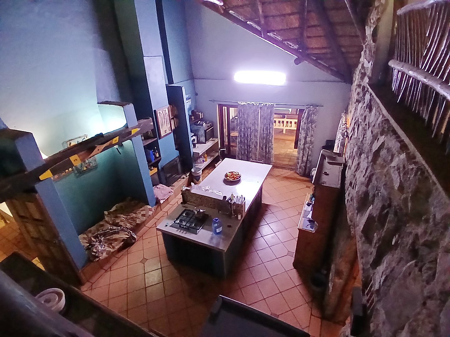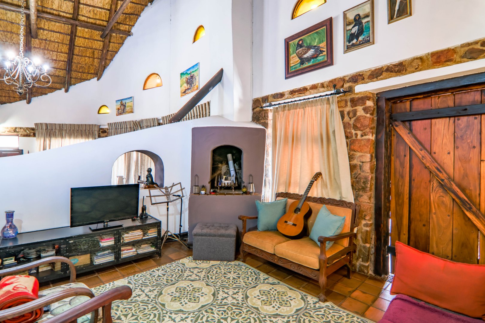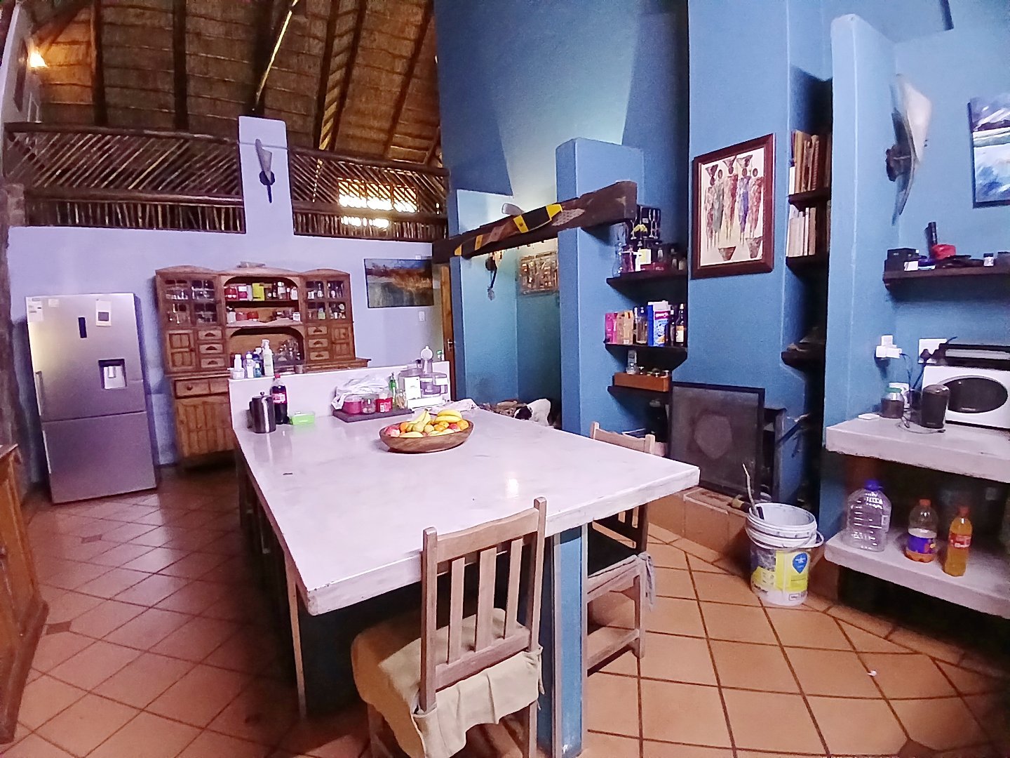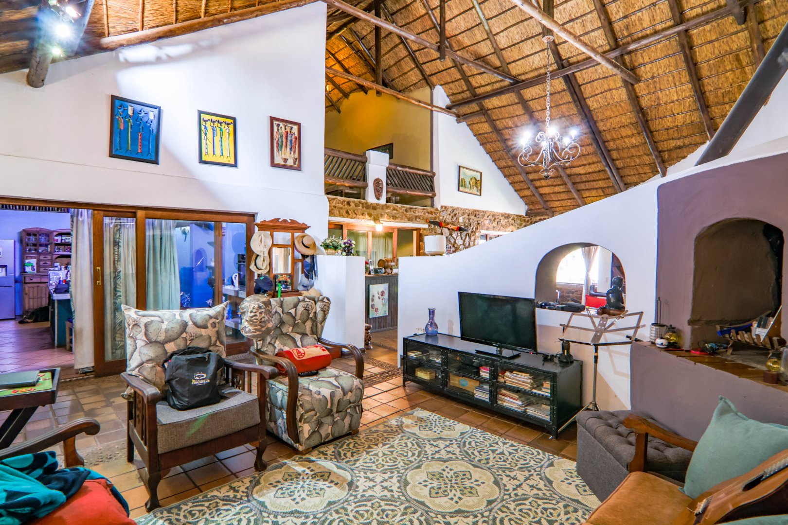 The main house is 3 bedrooms, 2 bathrooms (main en suite) downstairs, plus a large bedroom and study area upstairs, overlooking the kitchen and lounge area. Plus a snooker room, housing a full-size snooker table. The kitchen is charming, with a centre island and fireplace. The lounge and dining area are open plan, with high thatched roof.. And a small gym for the more energetic.