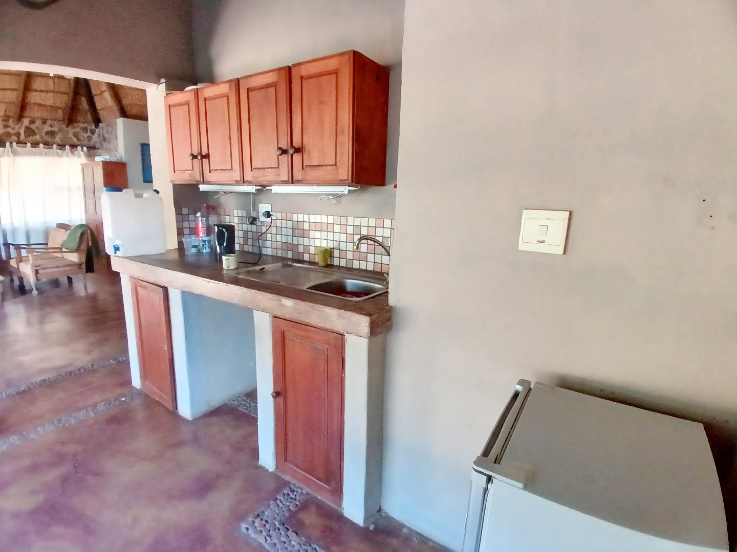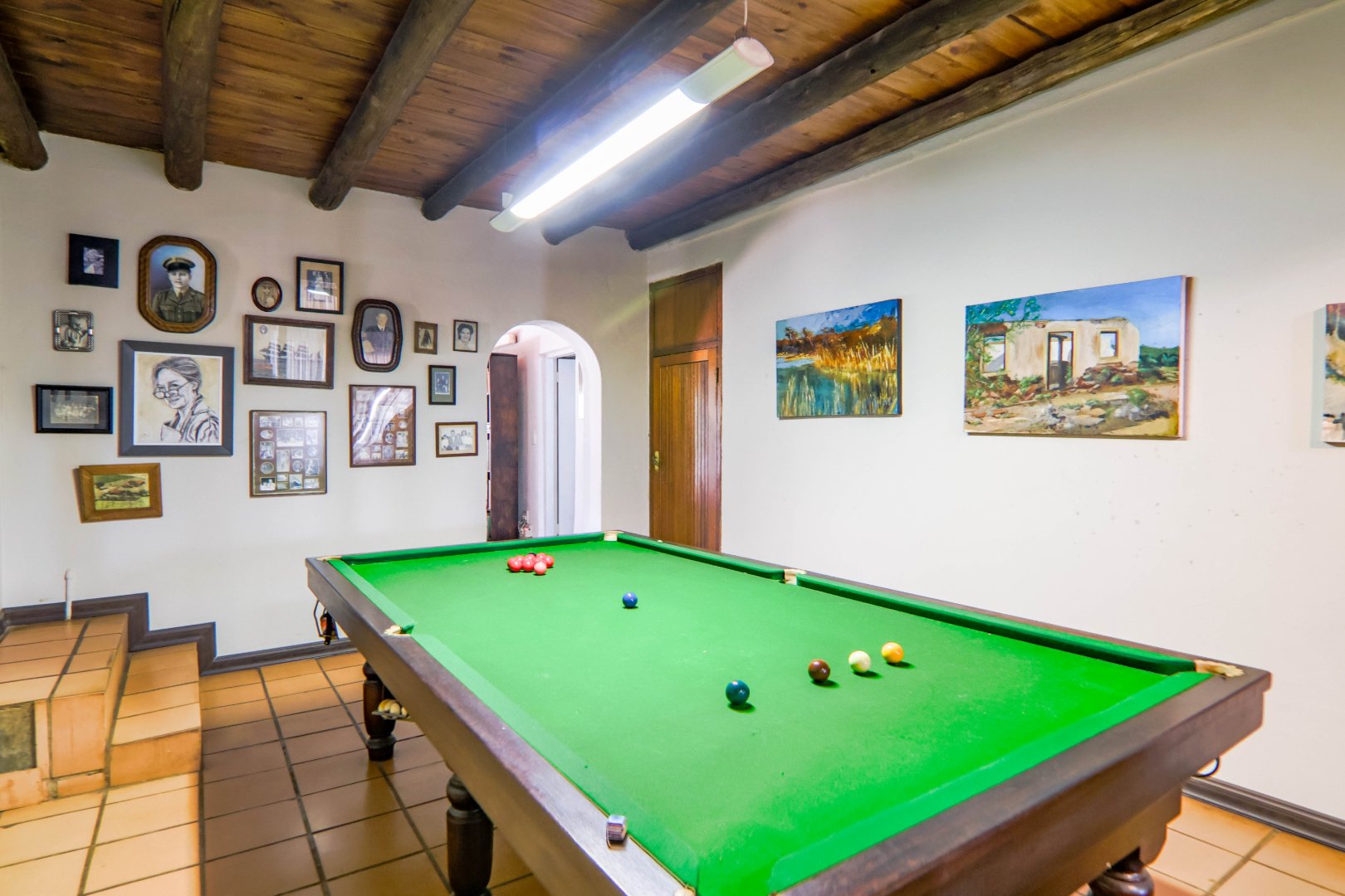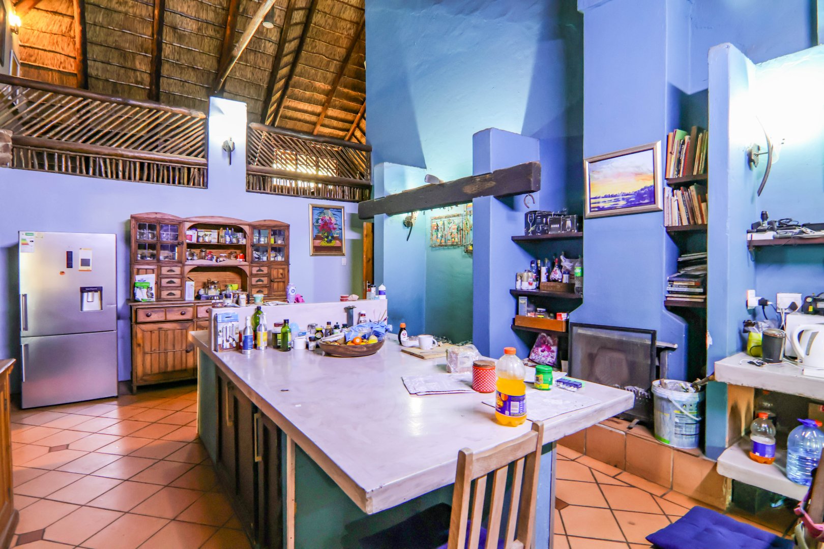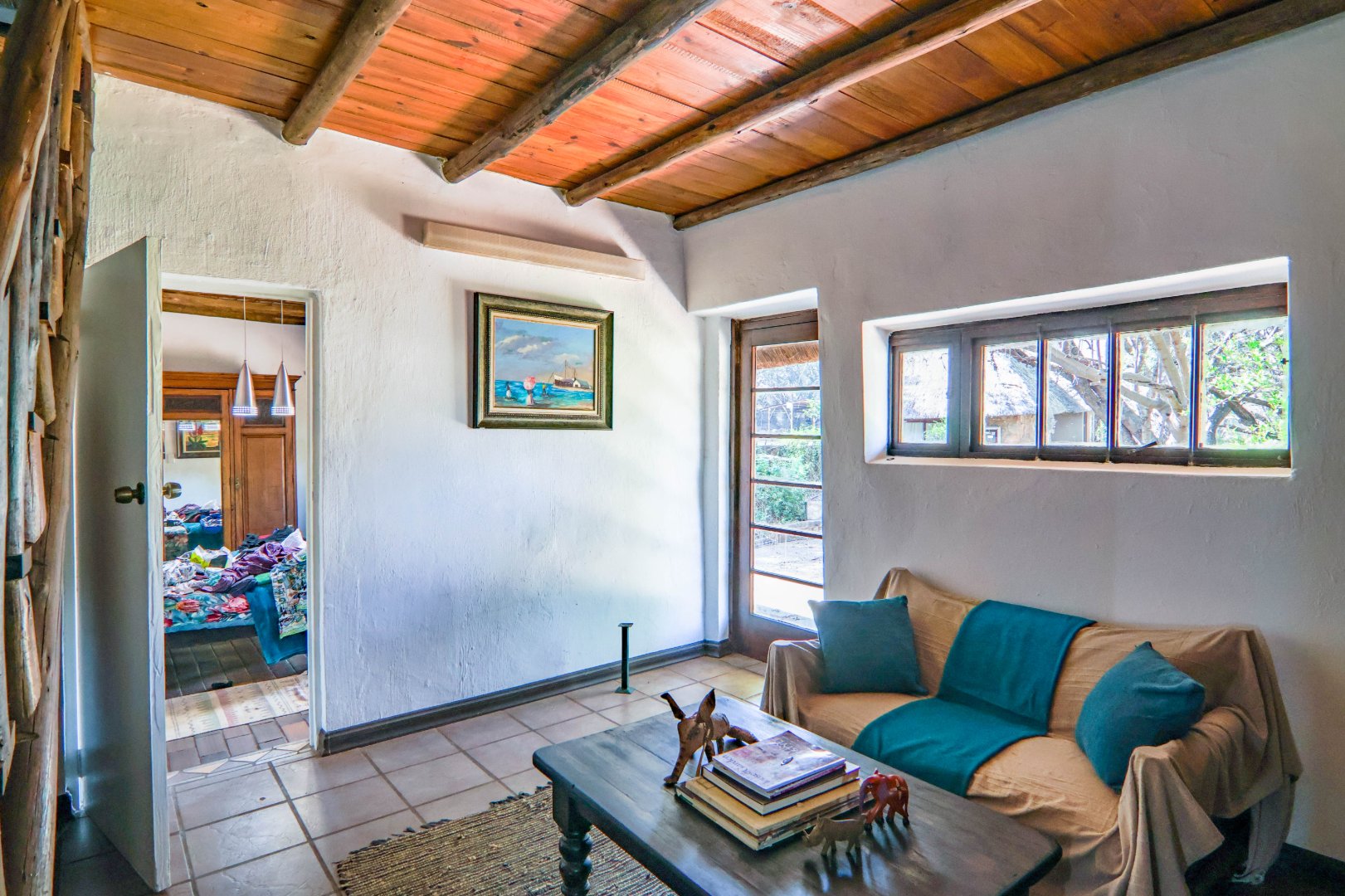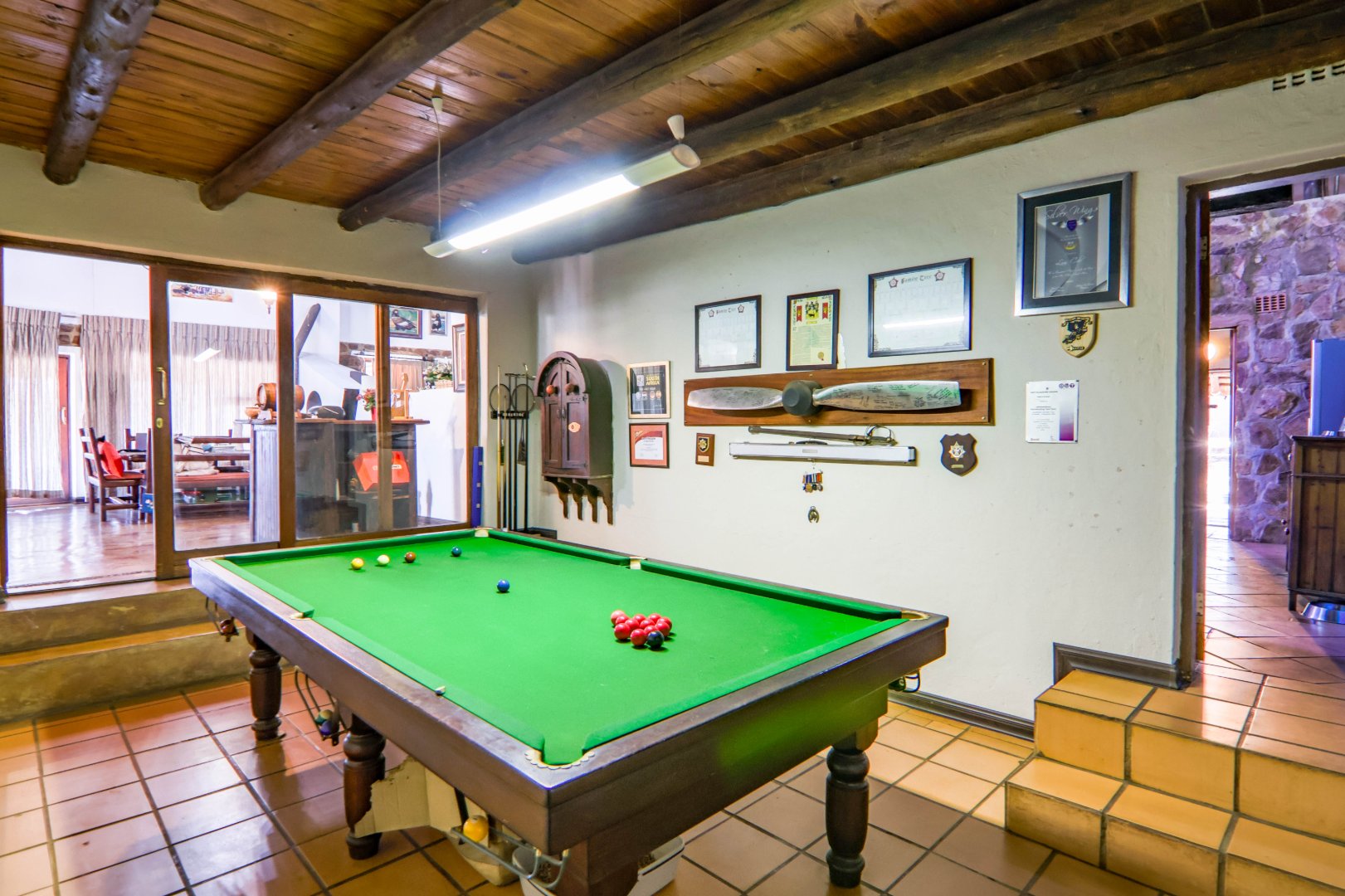 The main house is 3 bedrooms, 2 bathrooms (main en suite) downstairs, plus a large bedroom and study area upstairs, overlooking the kitchen and lounge area. Plus a snooker room, housing a full-size snooker table. The kitchen is charming, with a centre island and fireplace. The lounge and dining area are open plan, with high thatched roof.. And a small gym for the more energetic.