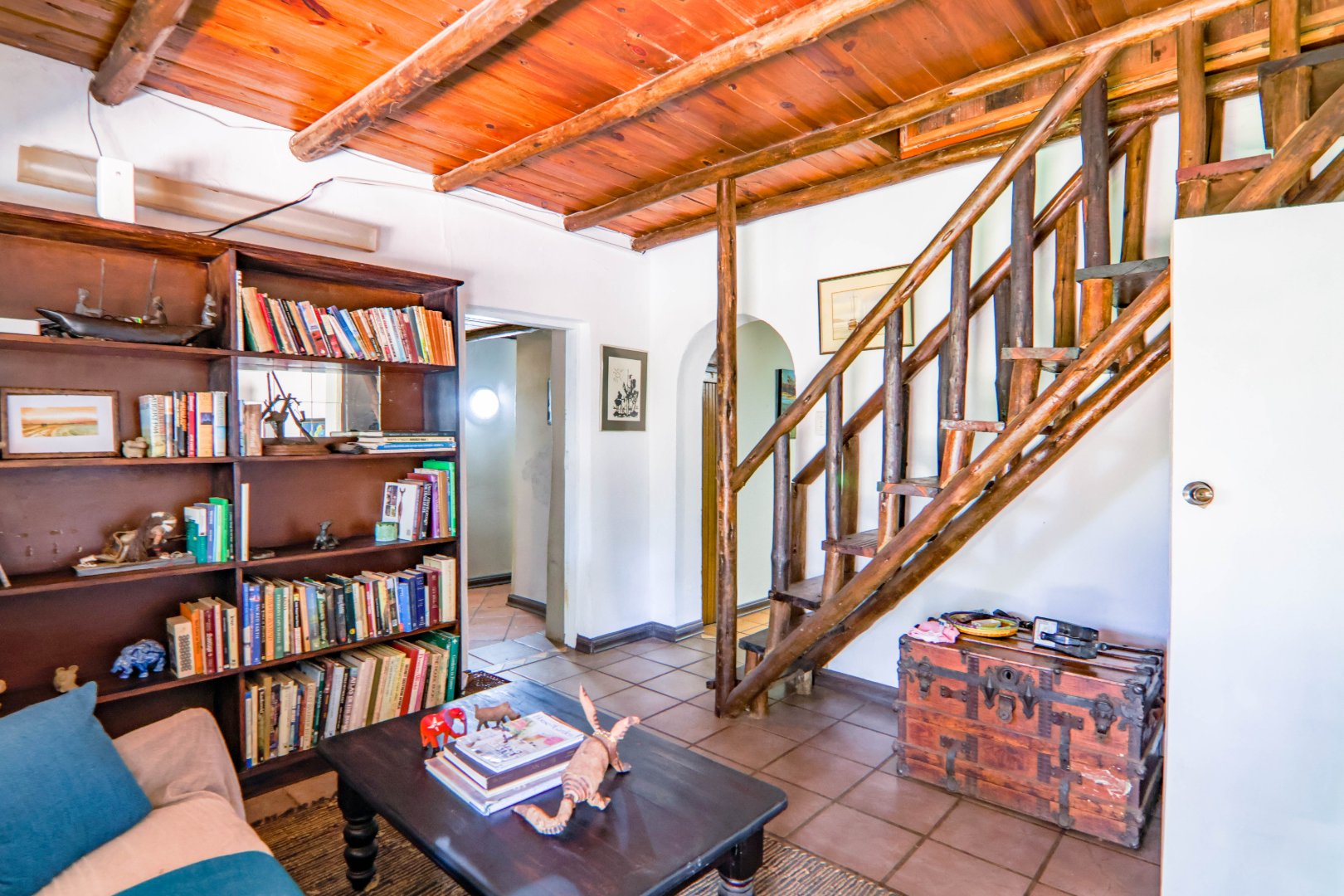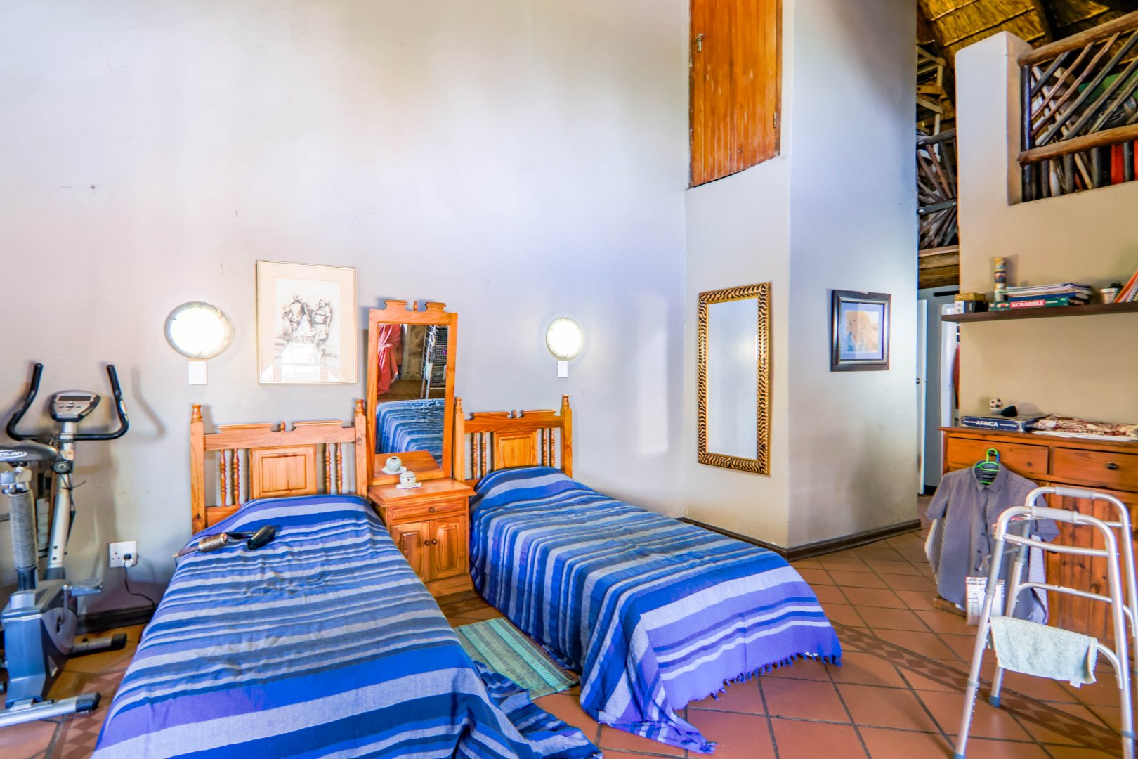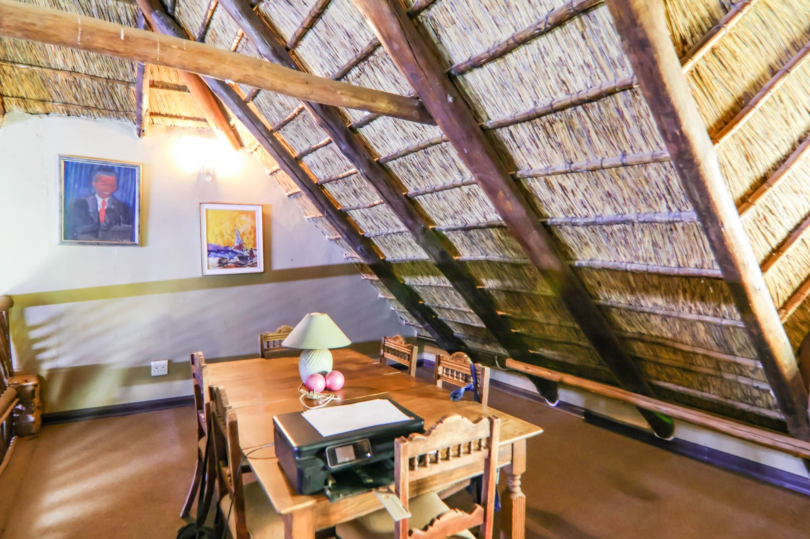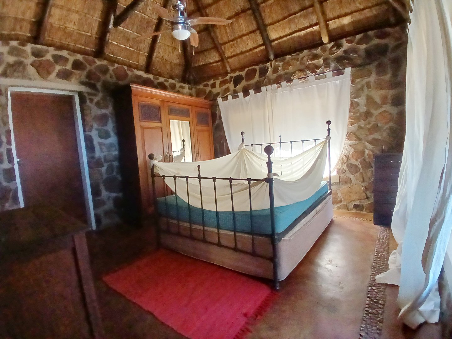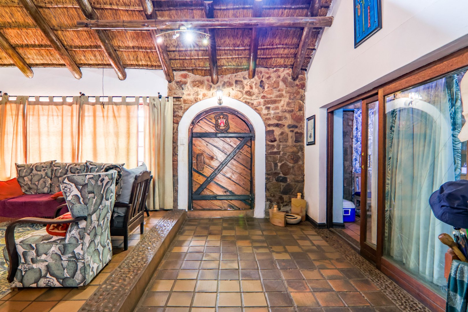 The main house is 3 bedrooms, 2 bathrooms (main en suite) downstairs, plus a large bedroom and study area upstairs, overlooking the kitchen and lounge area. Plus a snooker room, housing a full-size snooker table. The kitchen is charming, with a centre island and fireplace. The lounge and dining area are open plan, with high thatched roof.. And a small gym for the more energetic.