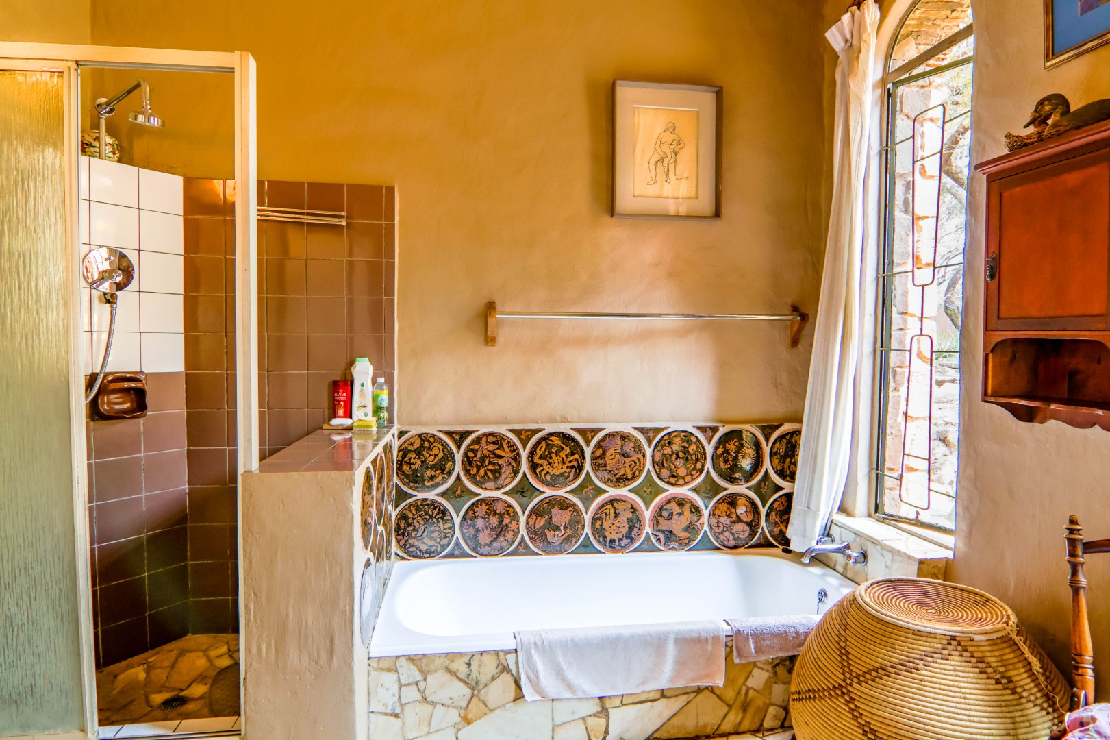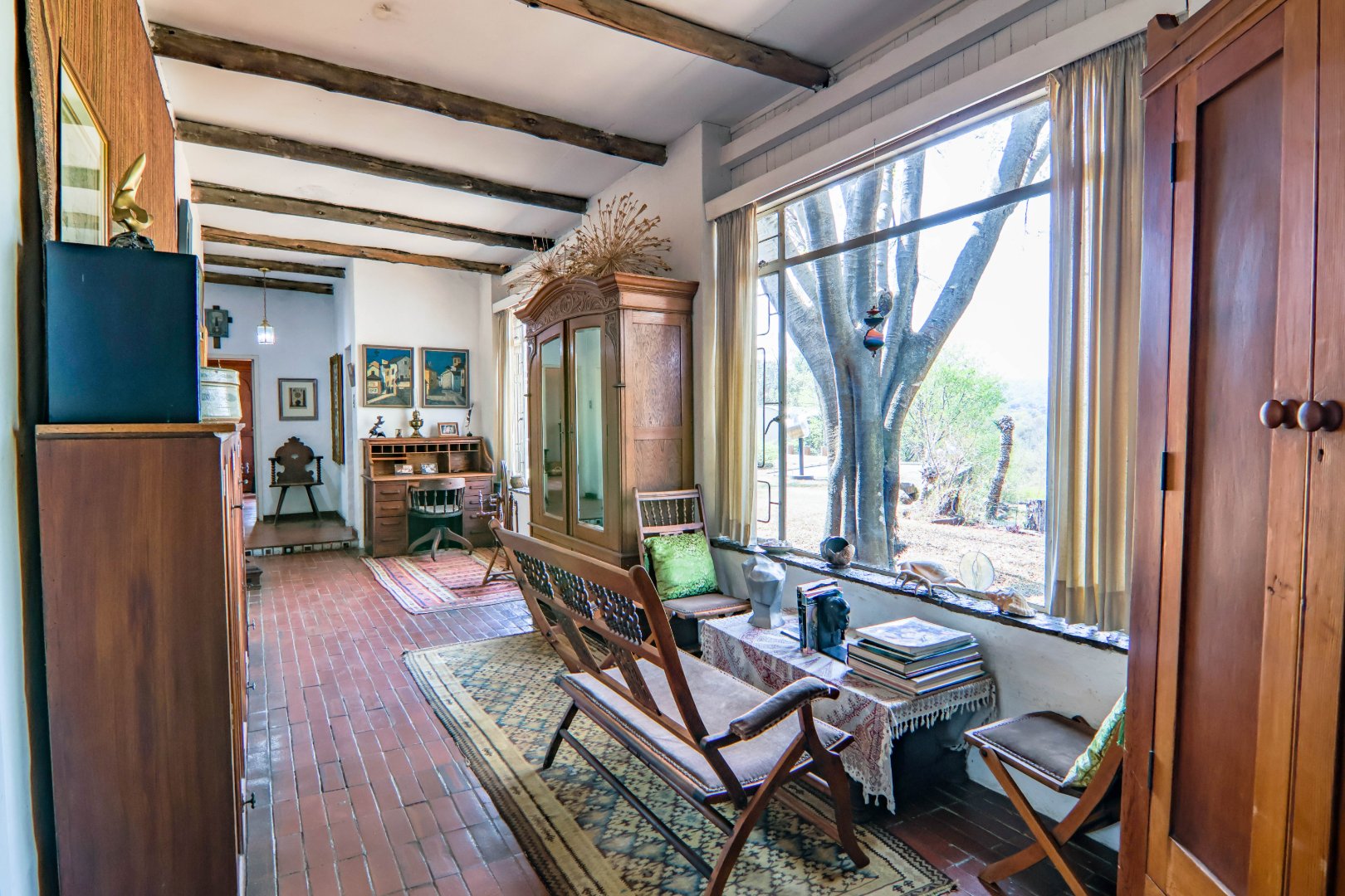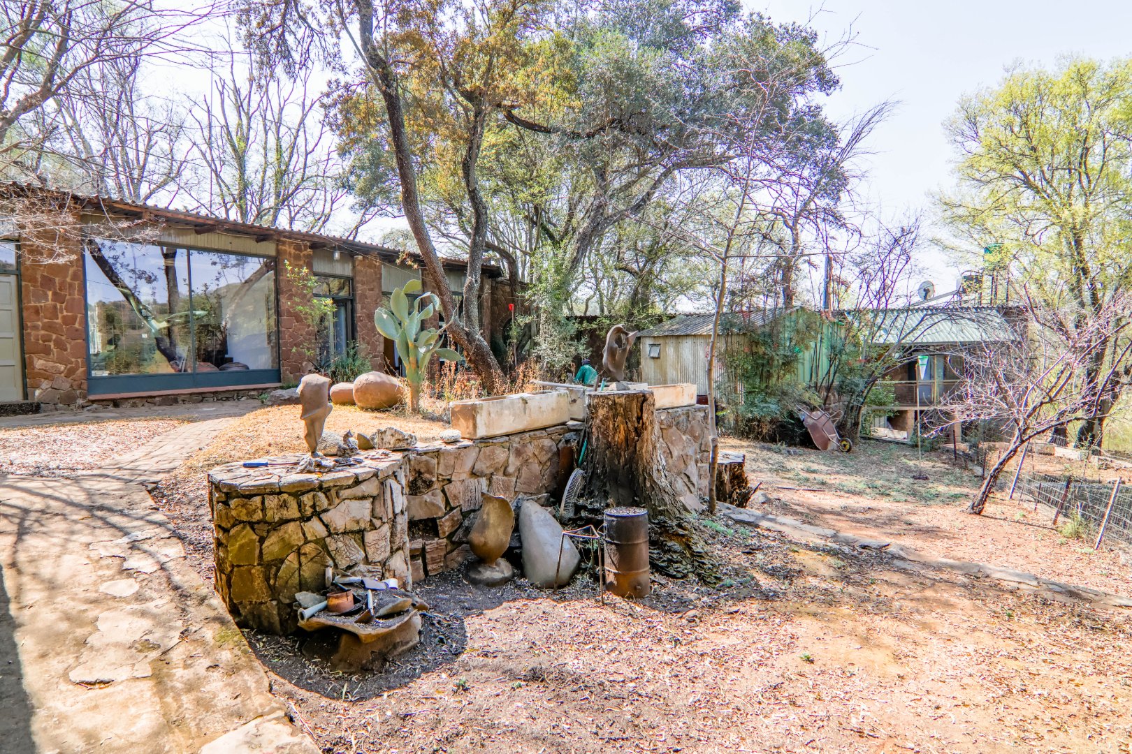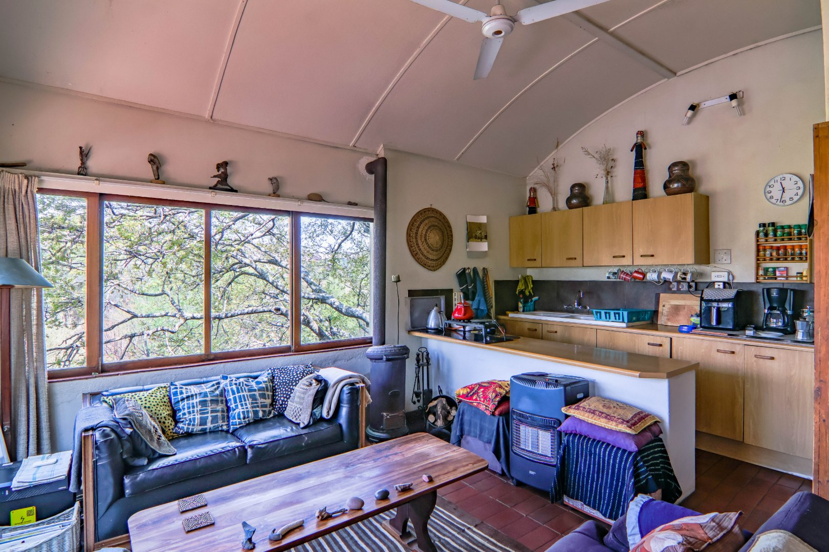 This amazing property was designed and hand built by the renowned artist Johan van Heerden. Built from local stone, the large main house has amazing flow. The house has 3 bedrooms, 2 bathrooms, a large studio, workshop and numerous outbuildings. A 3-bedroom cottage, staff quarters, garage and more, all enclosed within a secure area surrounded by an electric fence.