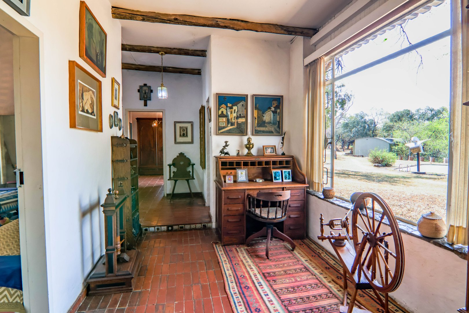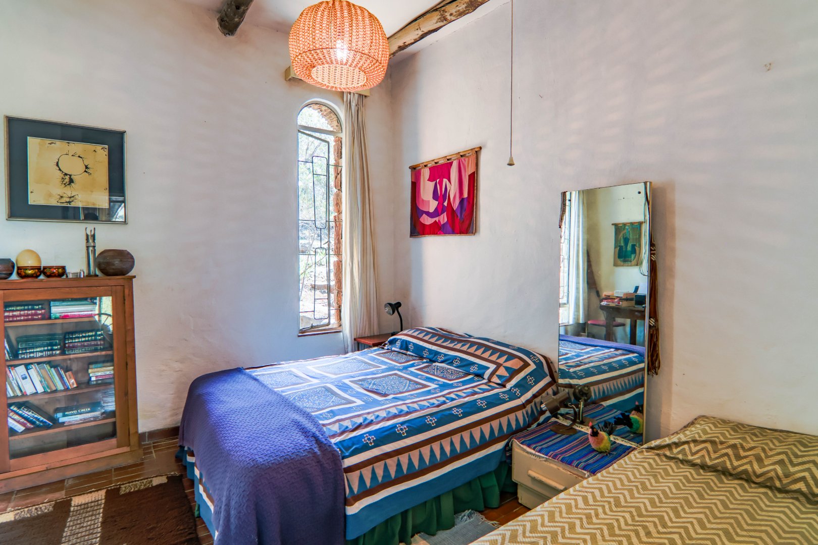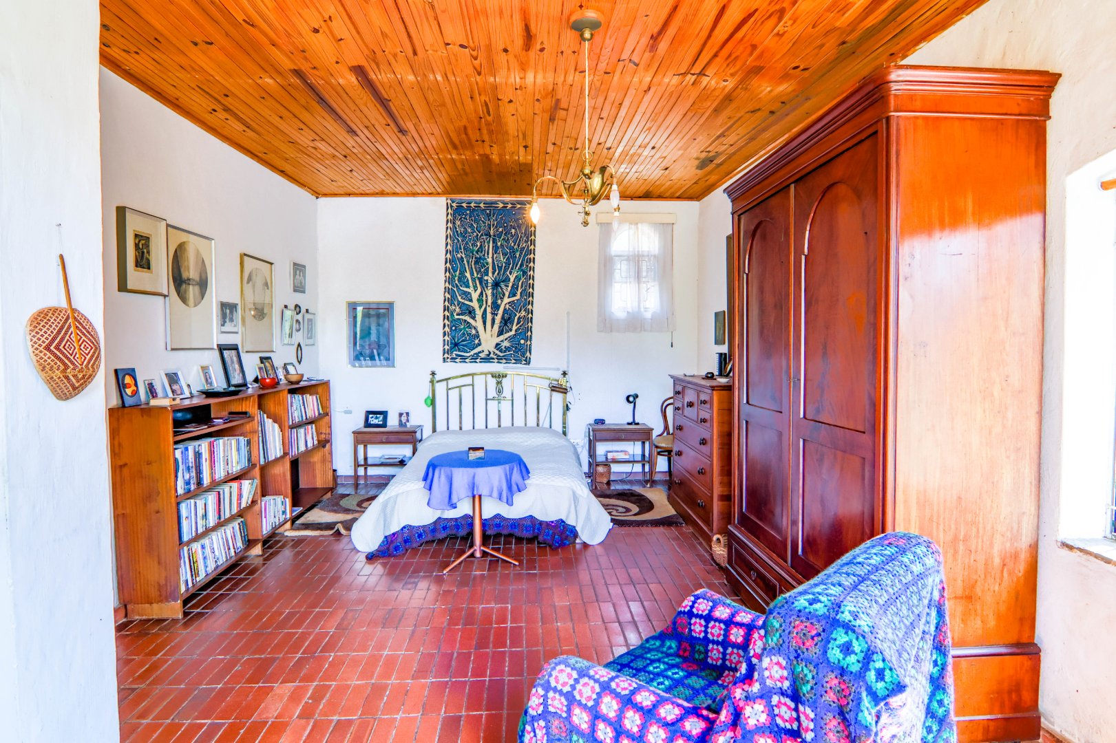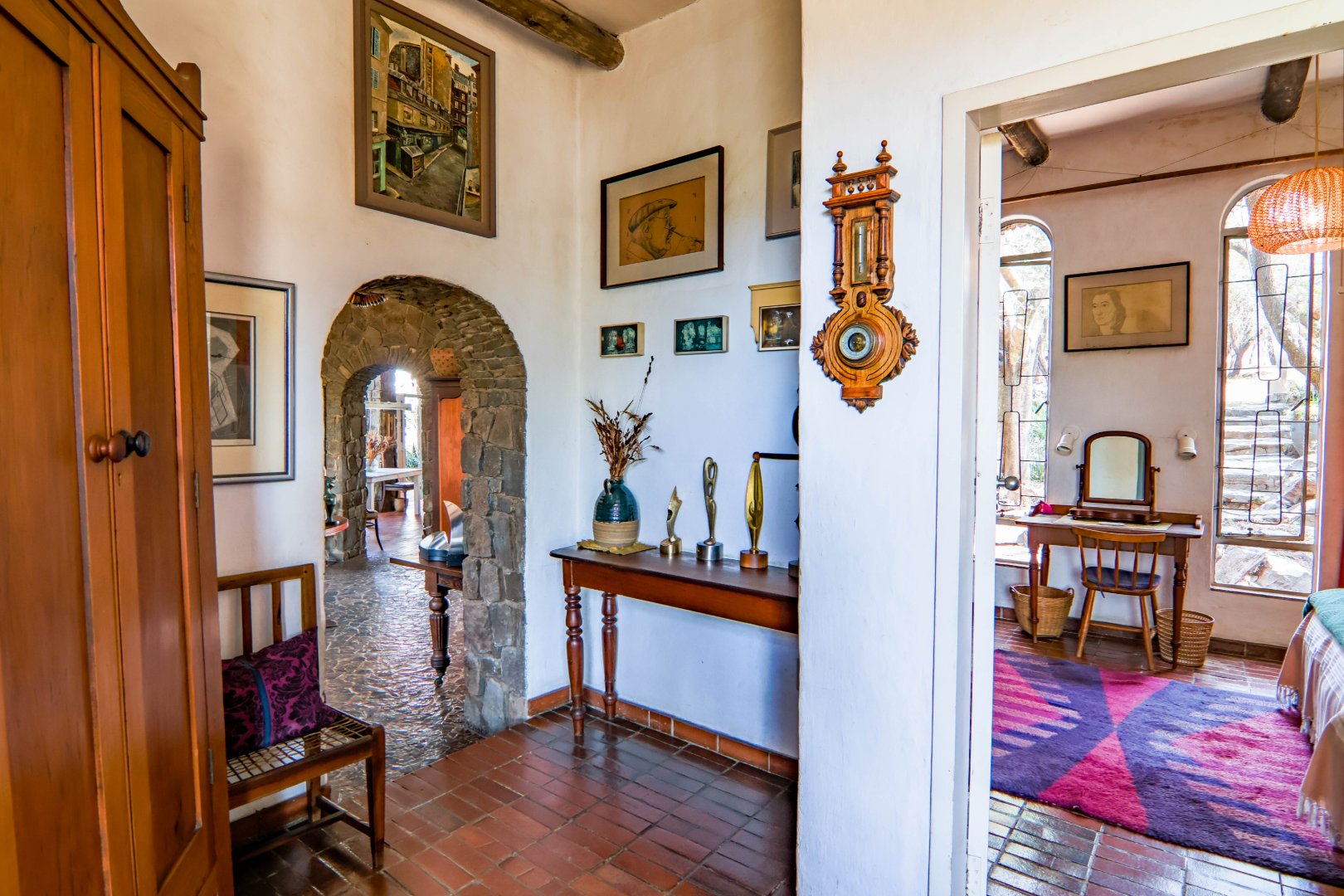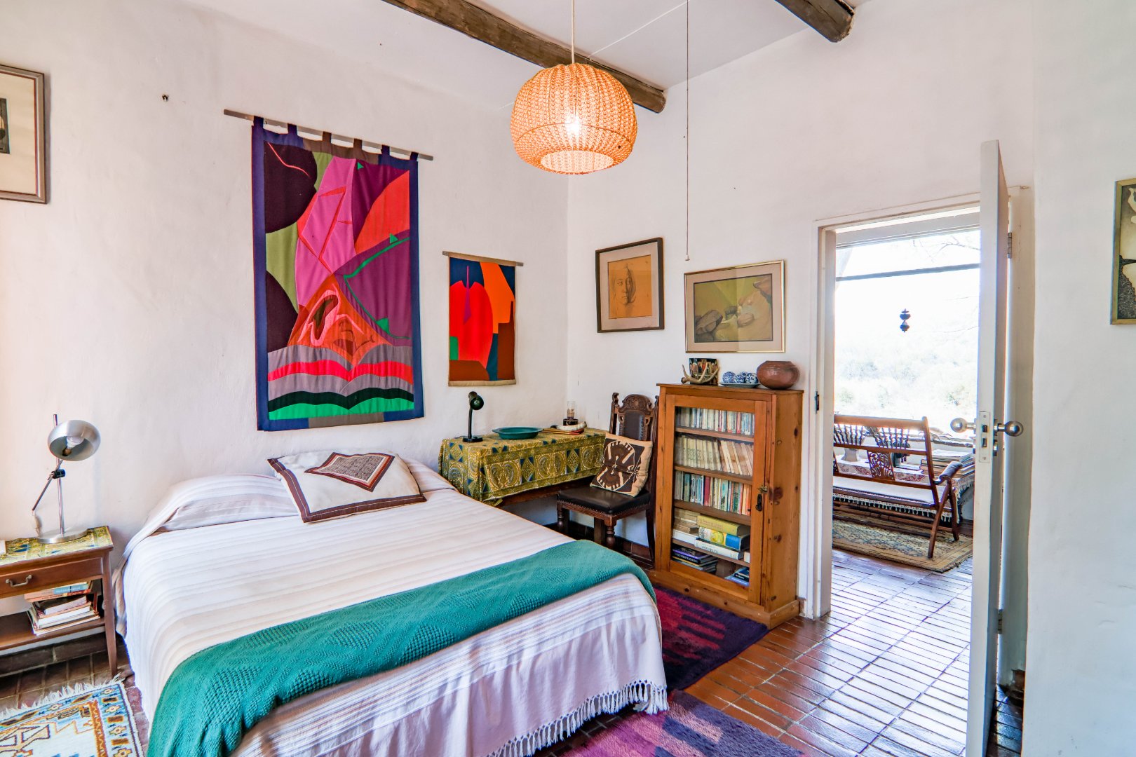 This amazing property was designed and hand built by the renowned artist Johan van Heerden. Built from local stone, the large main house has amazing flow. The house has 3 bedrooms, 2 bathrooms, a large studio, workshop and numerous outbuildings. A 3-bedroom cottage, staff quarters, garage and more, all enclosed within a secure area surrounded by an electric fence.