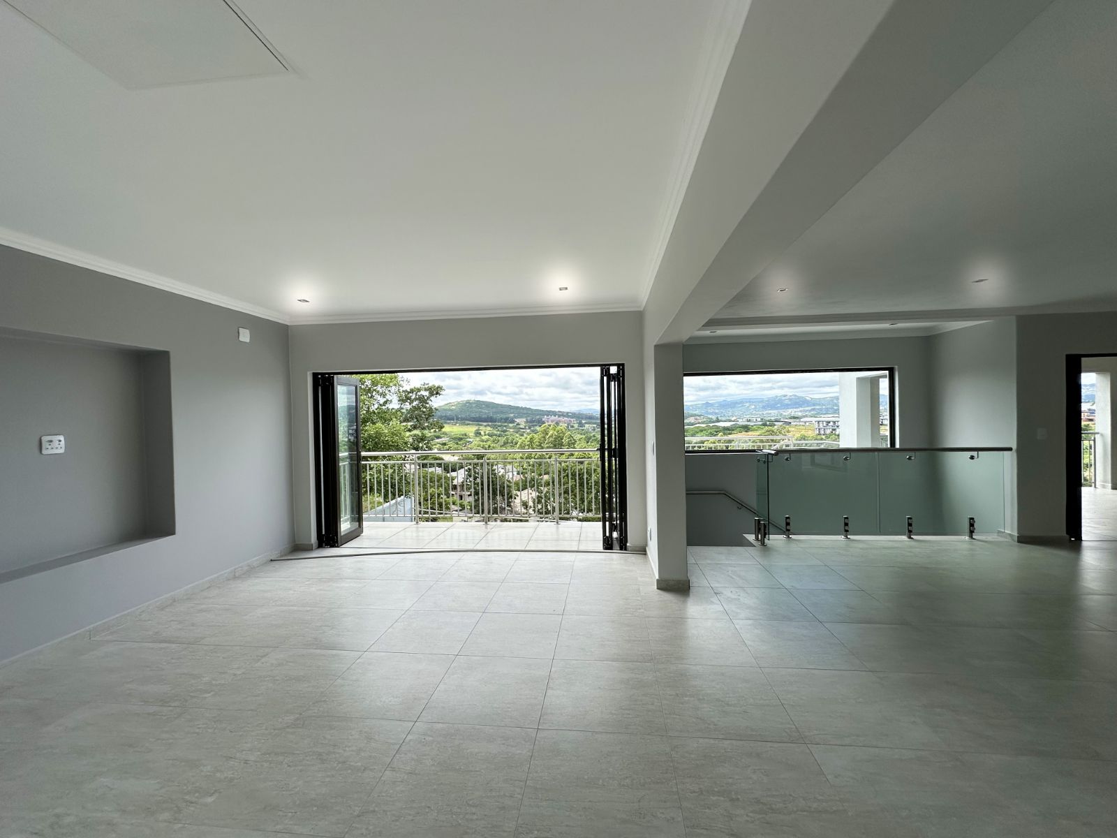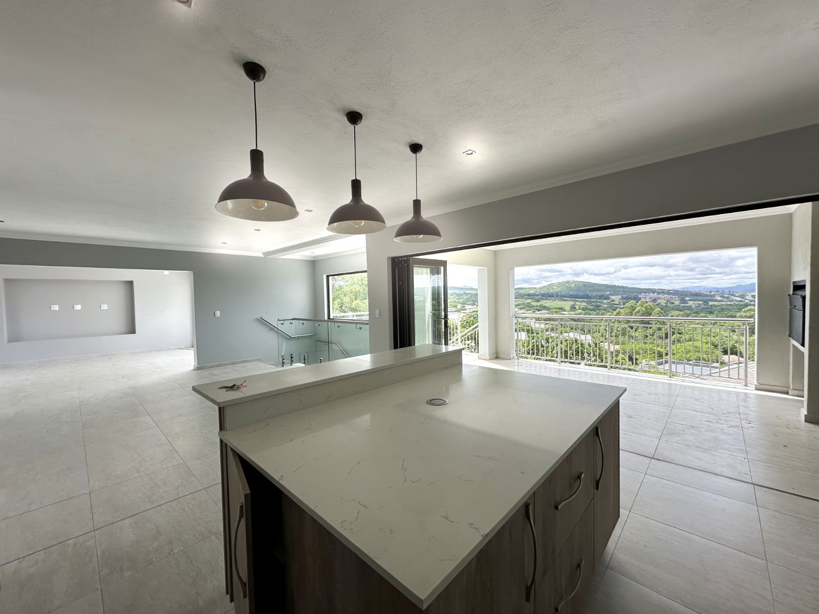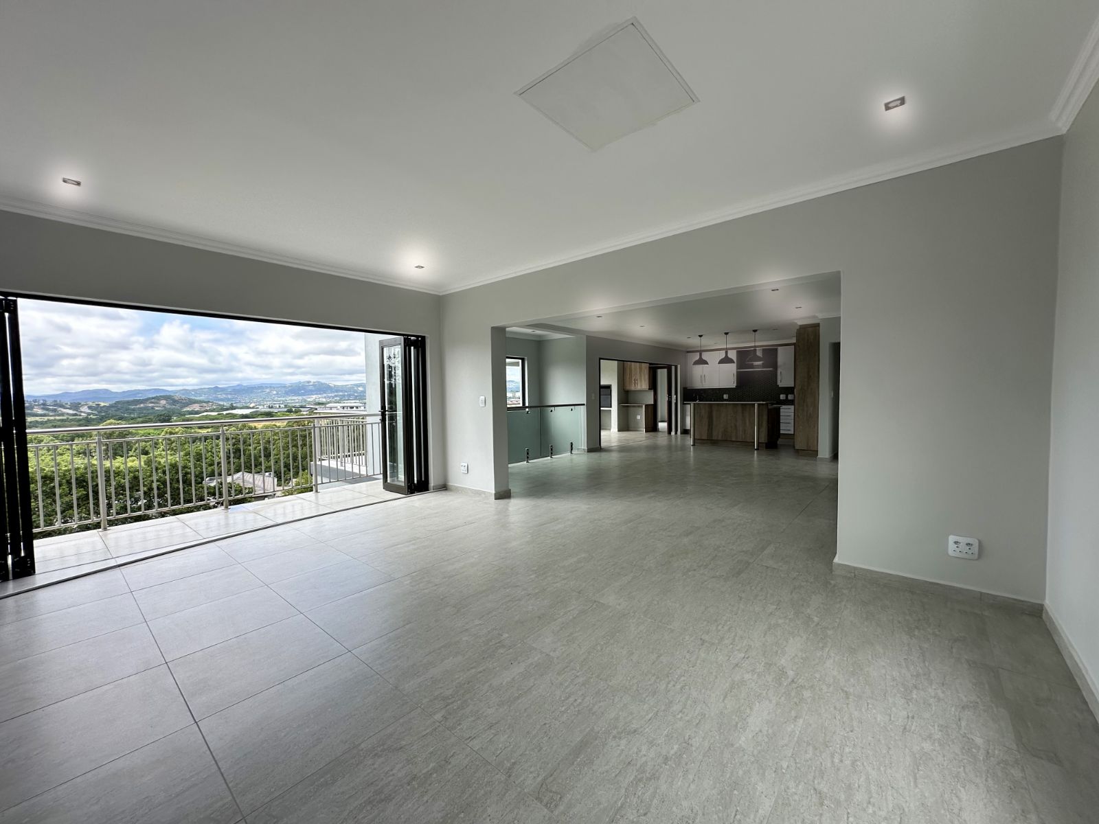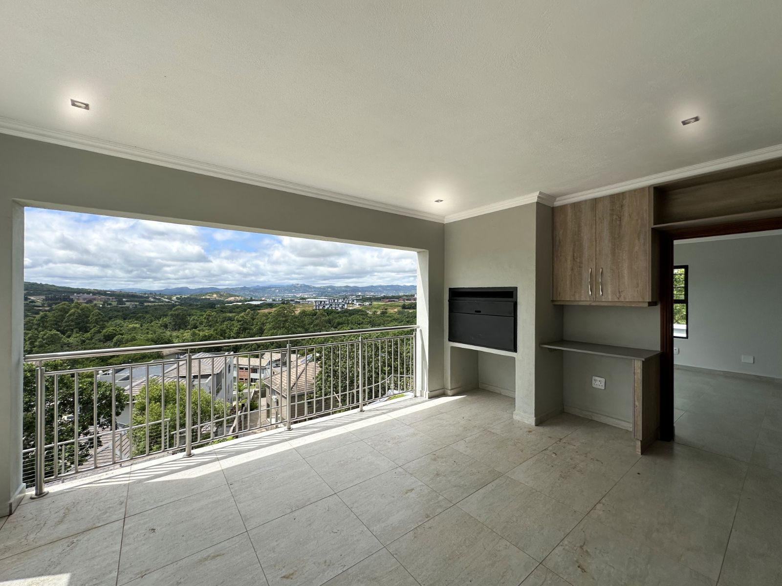 The floor-to-ceiling stack doors effortlessly connect the indoors with the outdoors, leading to a covered patio featuring a built-in braai and showcasing breathtaking views of the surrounding landscape.