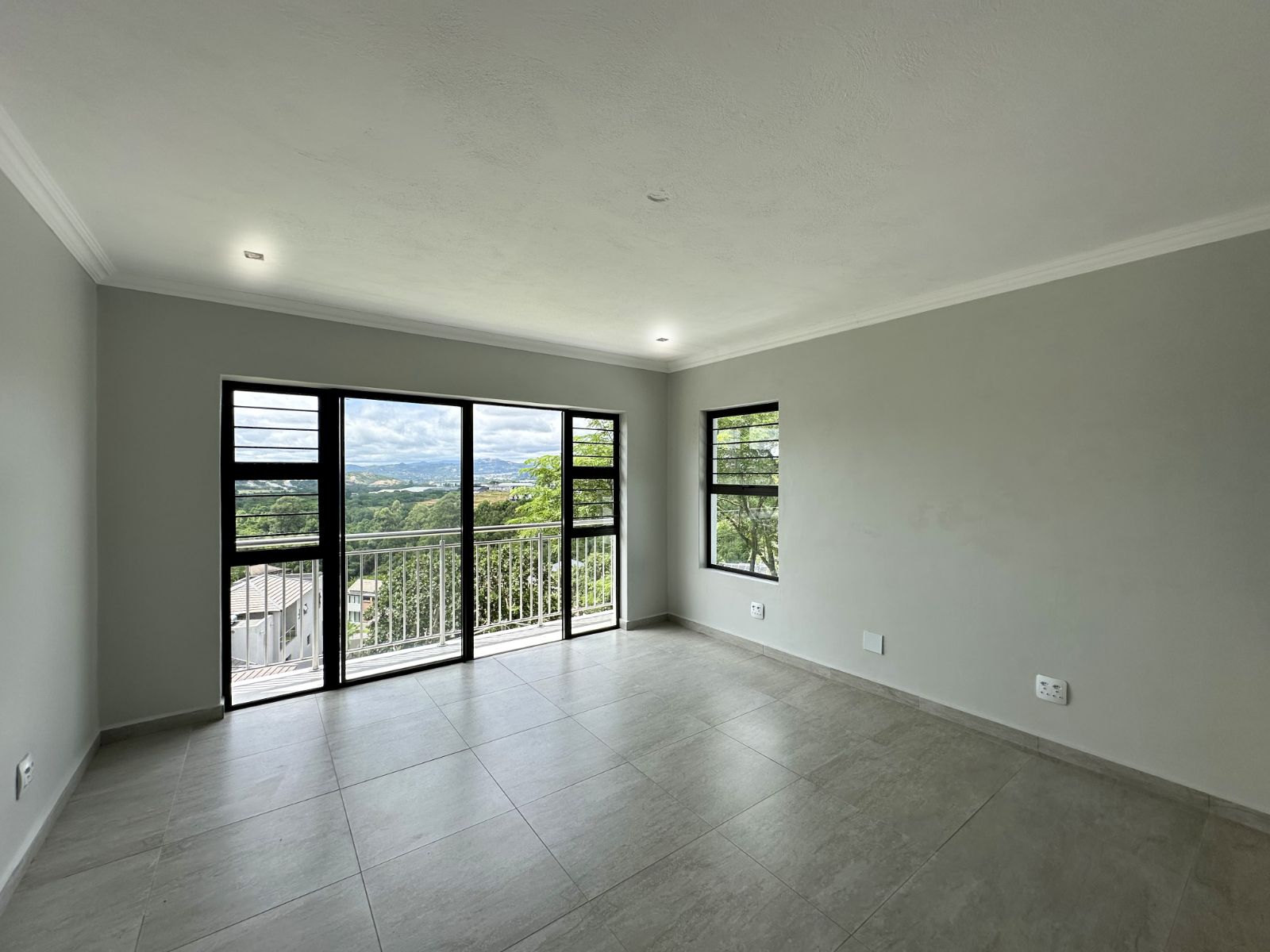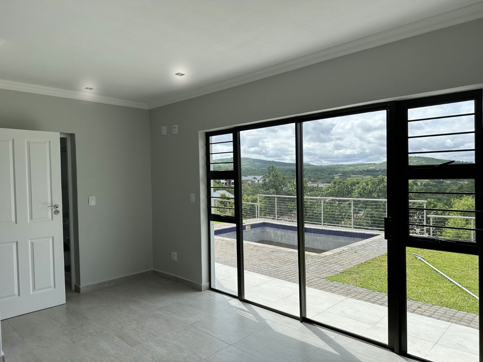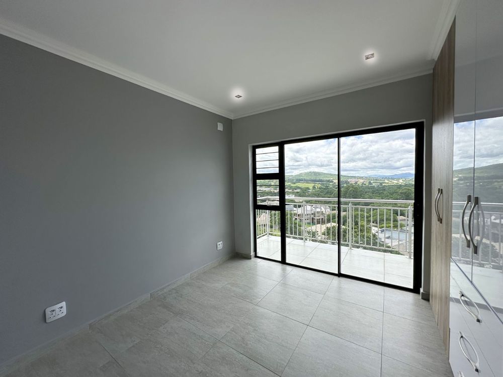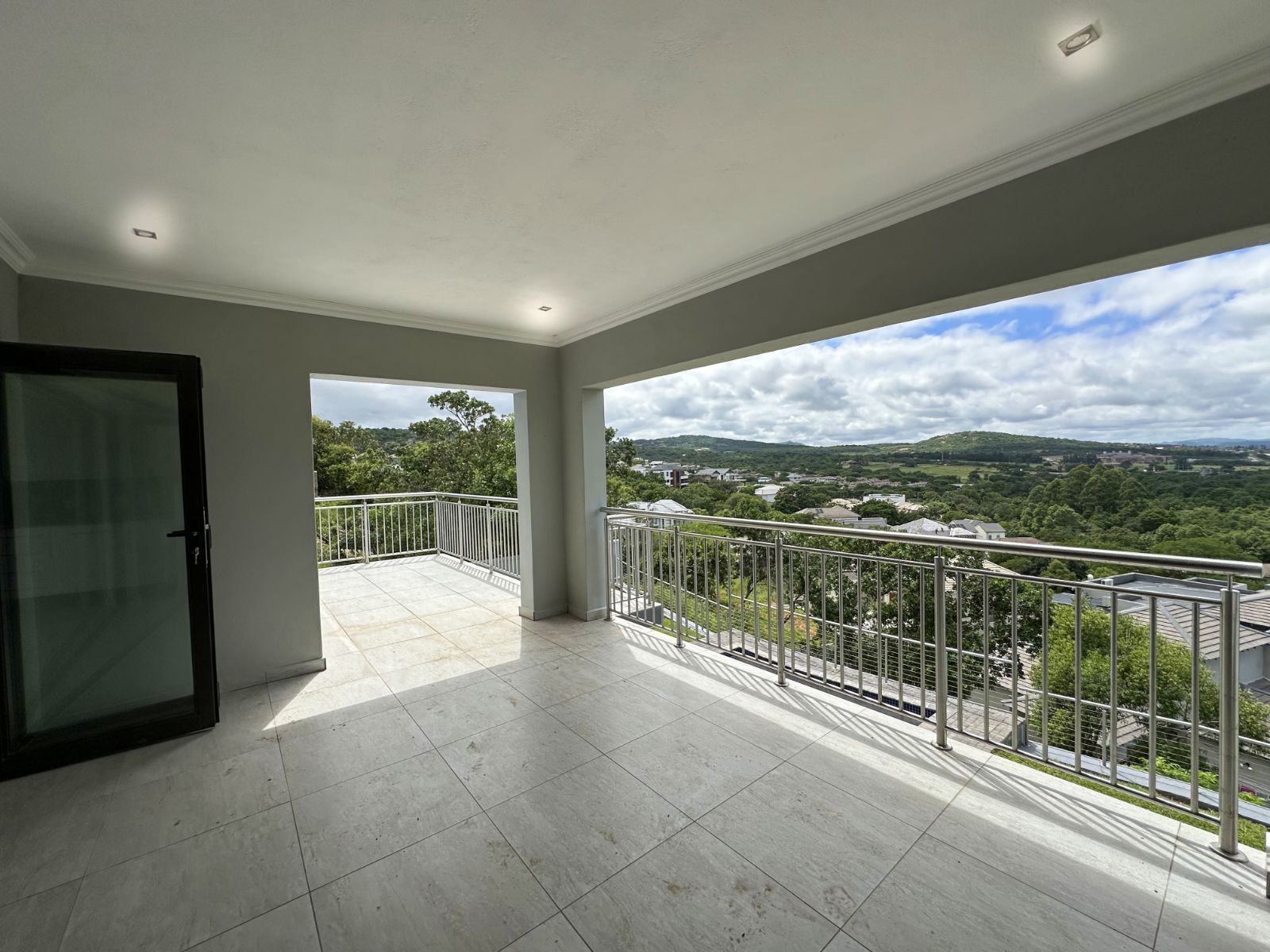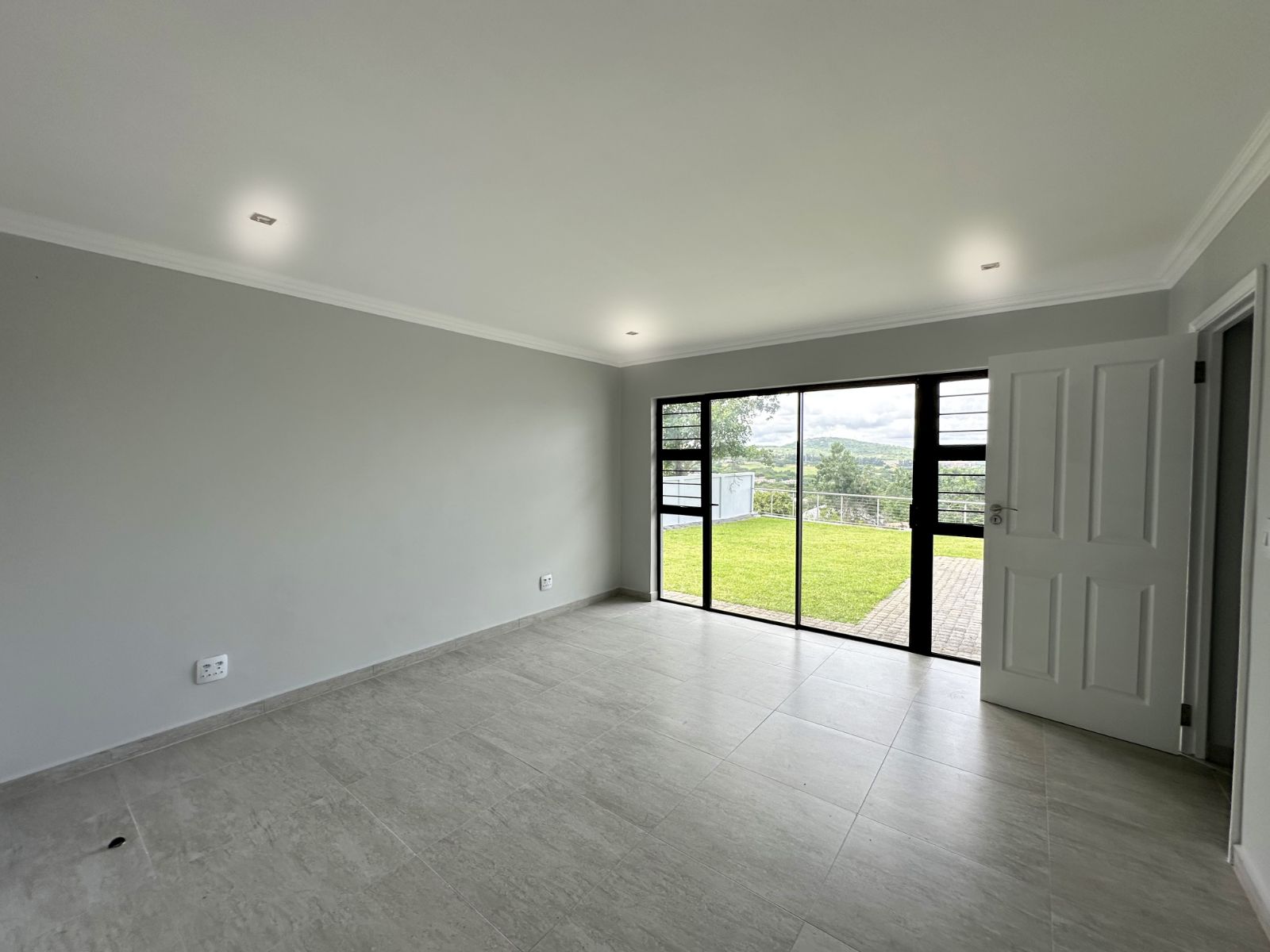 The floor-to-ceiling stack doors effortlessly connect the indoors with the outdoors, leading to a covered patio featuring a built-in braai and showcasing breathtaking views of the surrounding landscape.