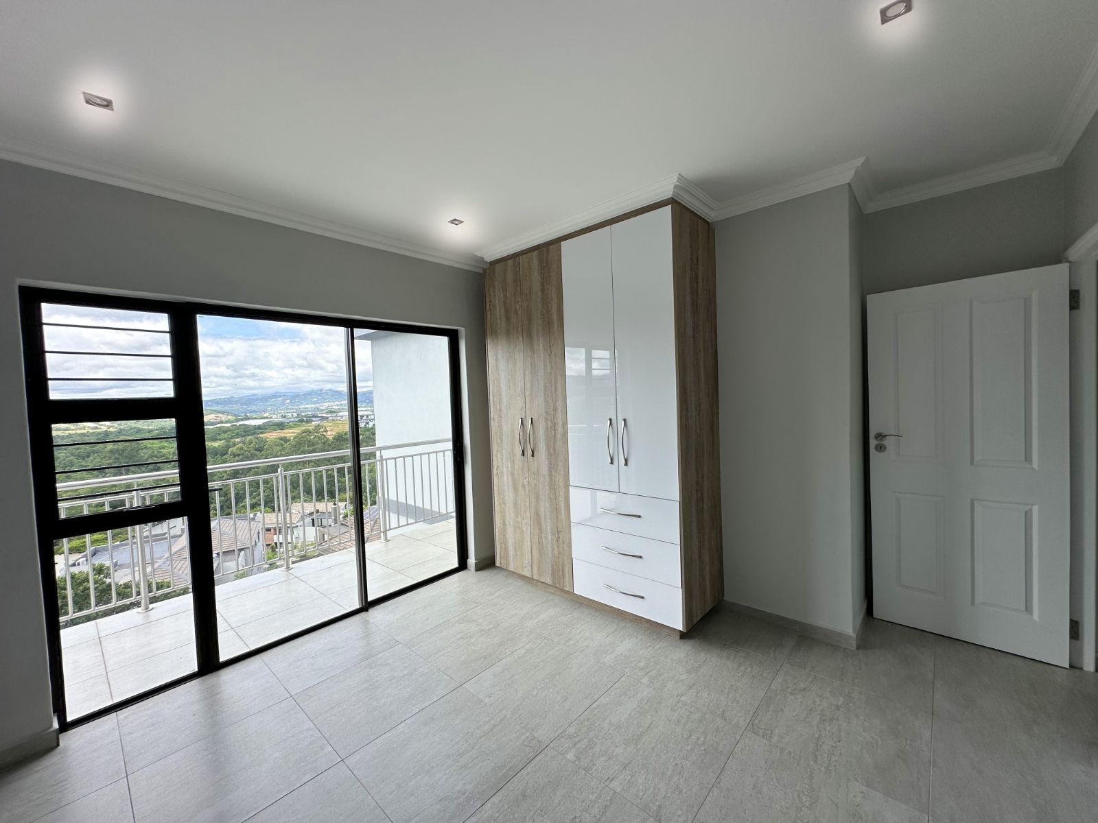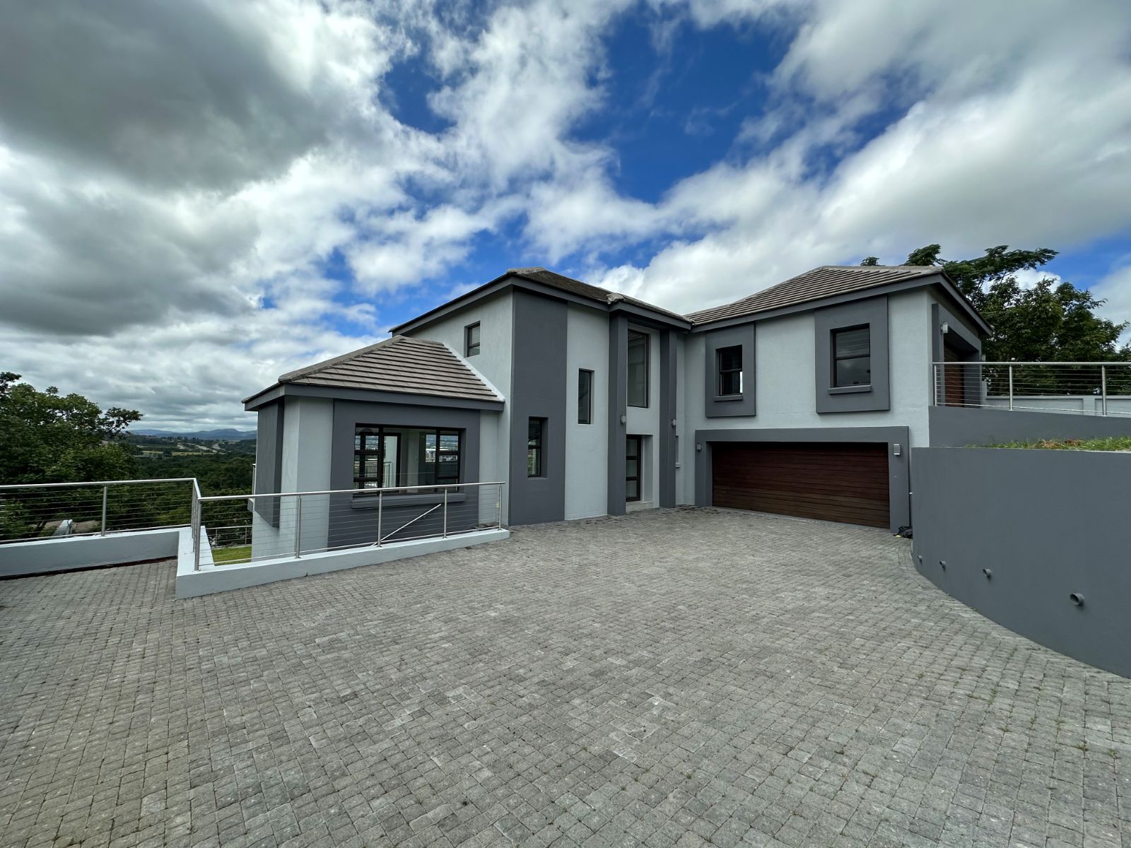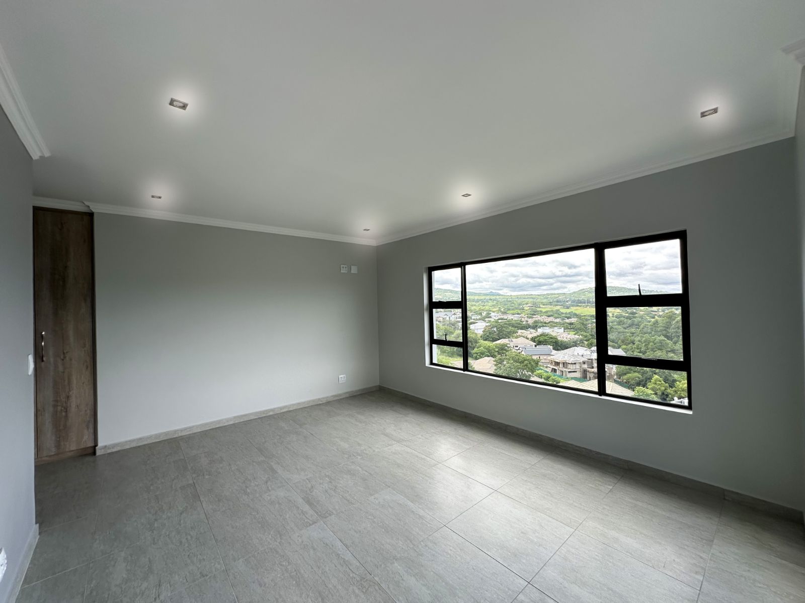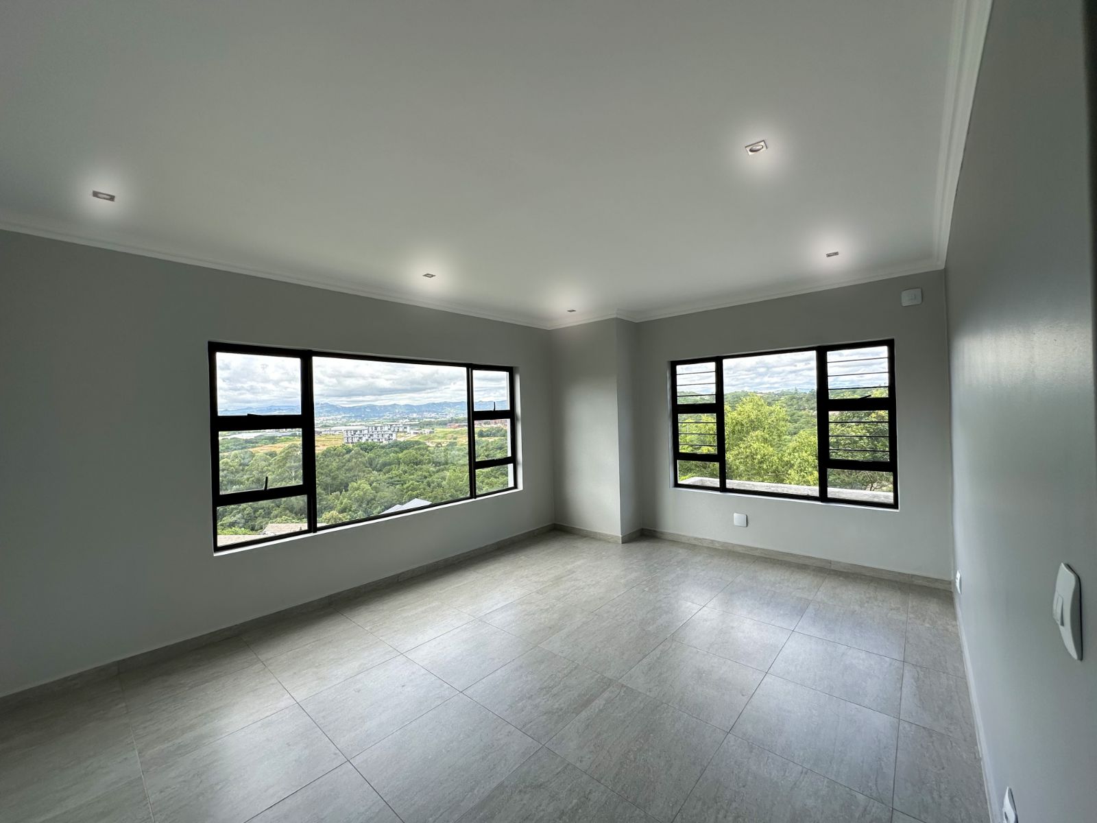 The floor-to-ceiling stack doors effortlessly connect the indoors with the outdoors, leading to a covered patio featuring a built-in braai and showcasing breathtaking views of the surrounding landscape.