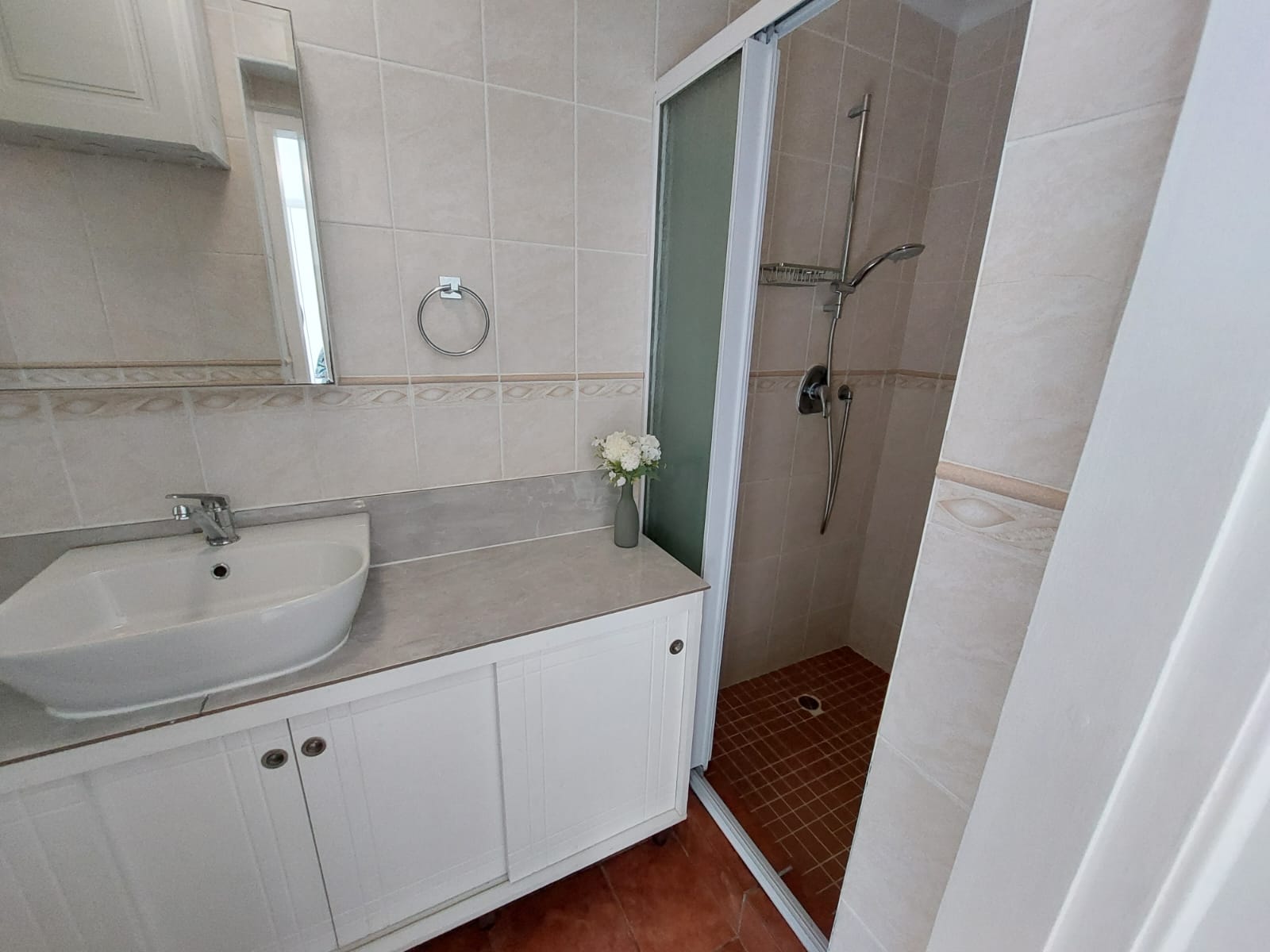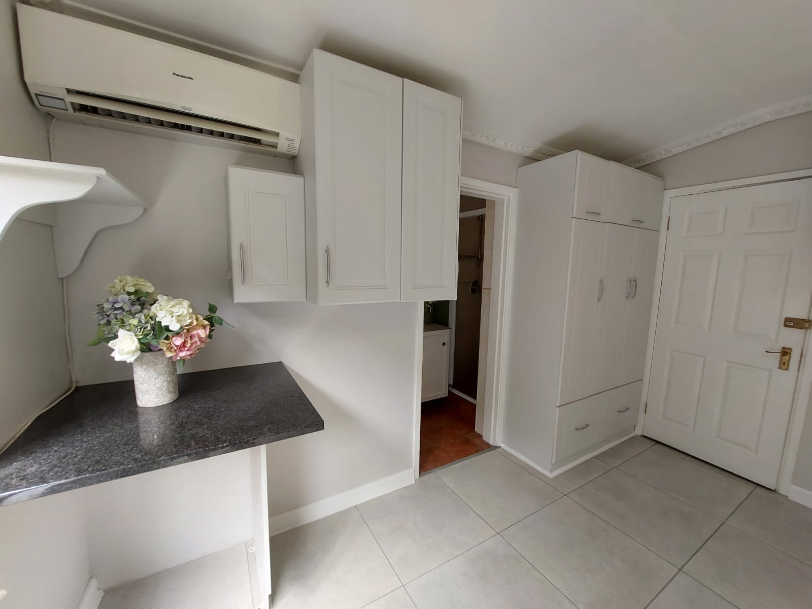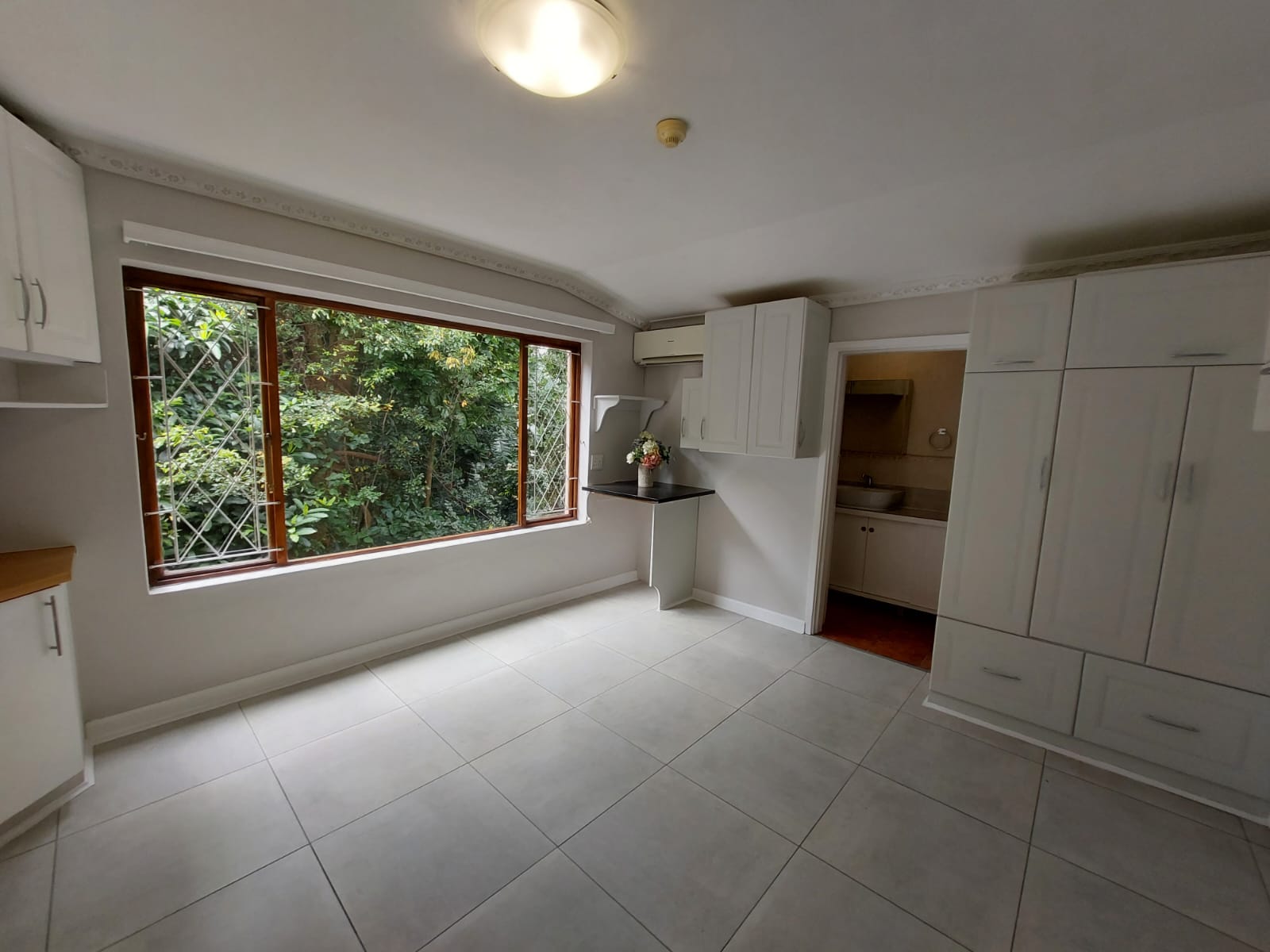The apartment is a corner unit which offers a lot of privacy and perfect for allowing lots of natural light in. The unit is fully tiled, equipped with aircon for those hot humid days and fitted with curtains with large windows giving you a view of plant and animal life. There is a small kitchenette with space for an under-counter refrigerator and space for other appliances. The unit has plenty of cupboard space and has a private en-suite bathroom equipped with shower, basin, and loo.