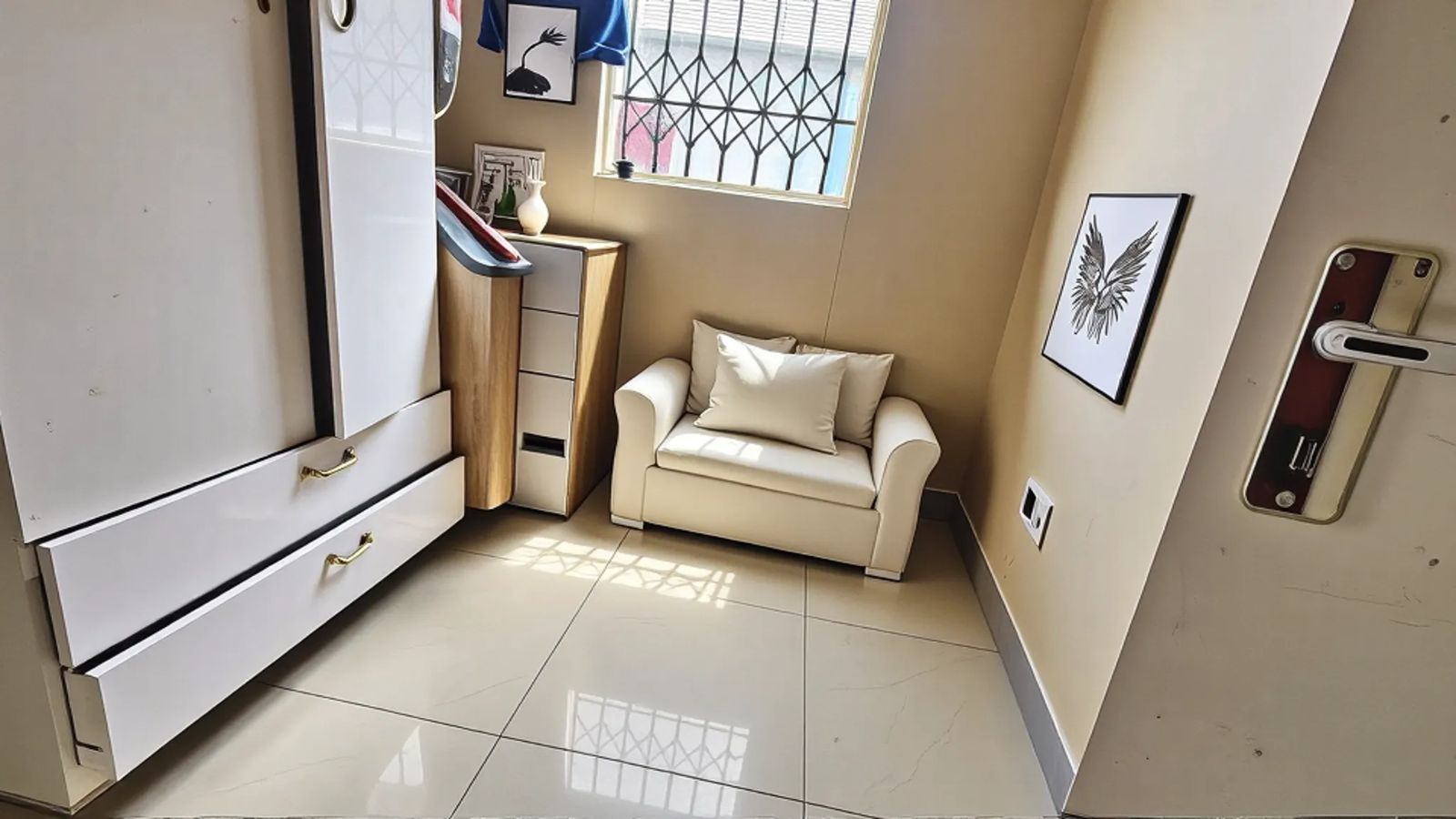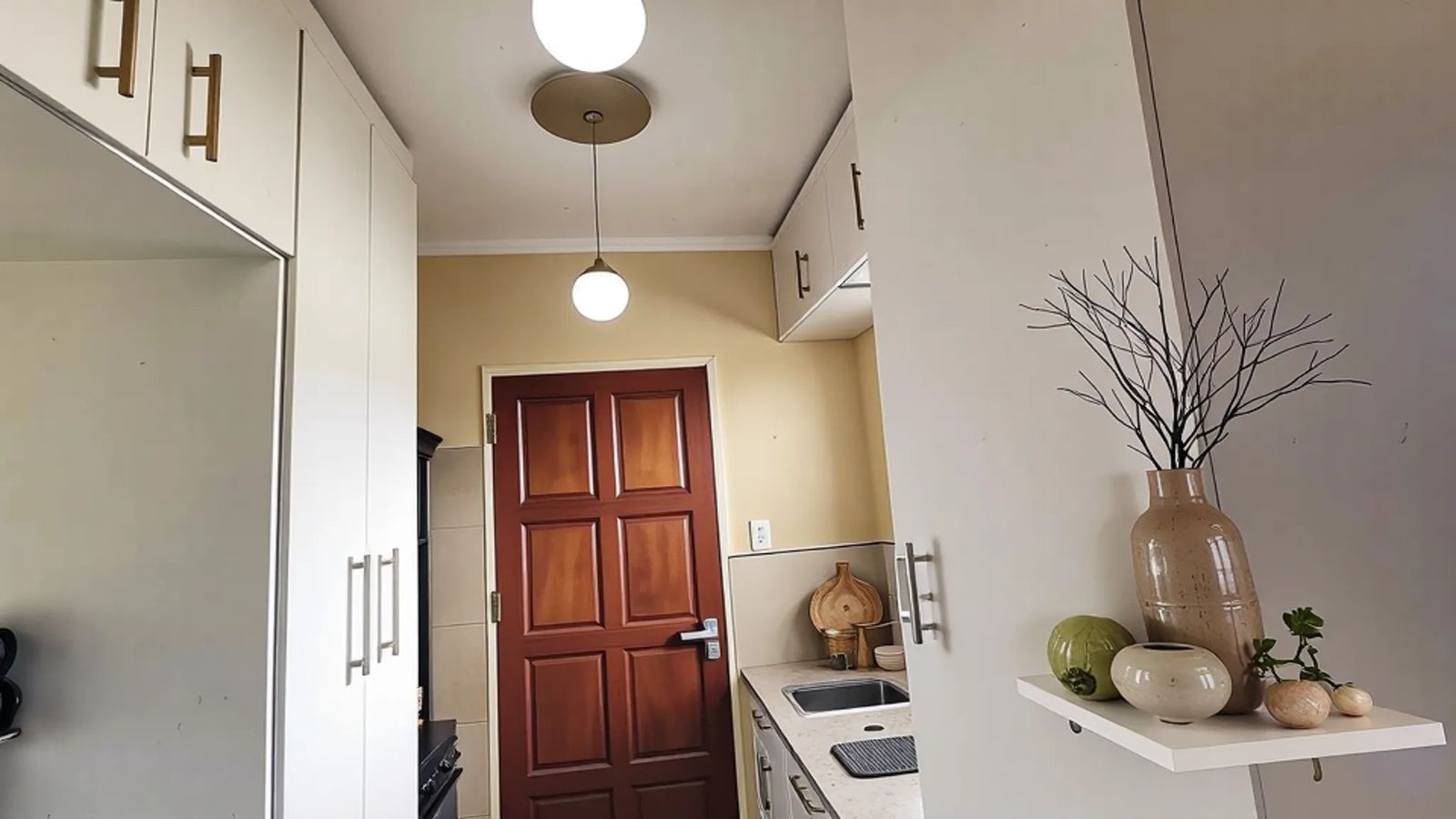 The house is tiled, and all necessary fixtures have been installed. A hybrid geyser is in place, which will save on electricity costs. Fixtures include cupboards in the kitchen housing, a built-in stove, and cupboards in all three rooms.