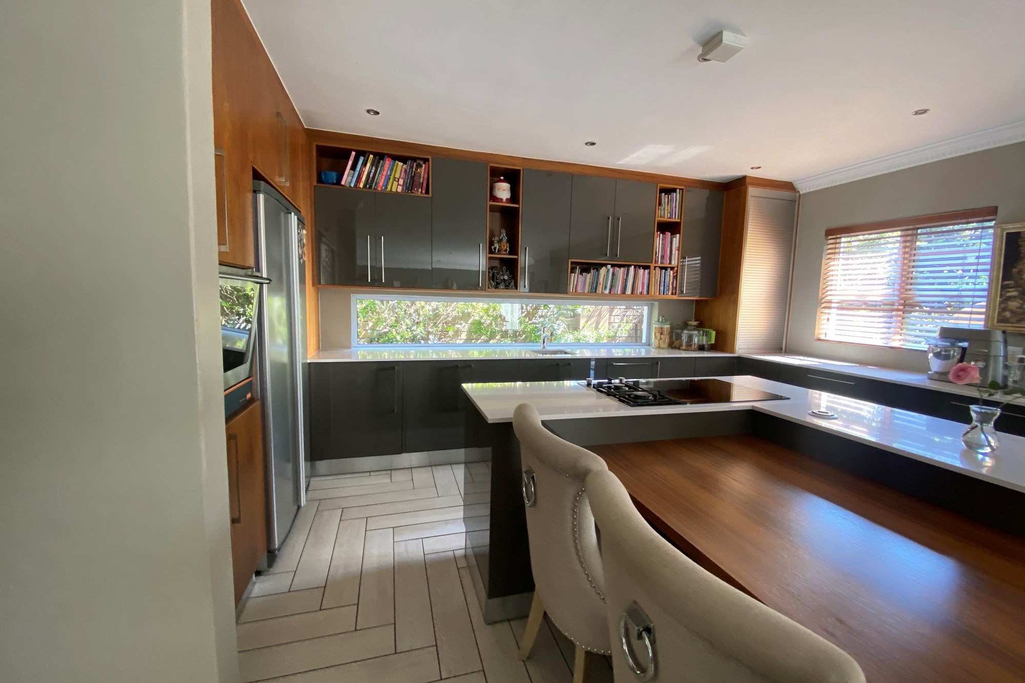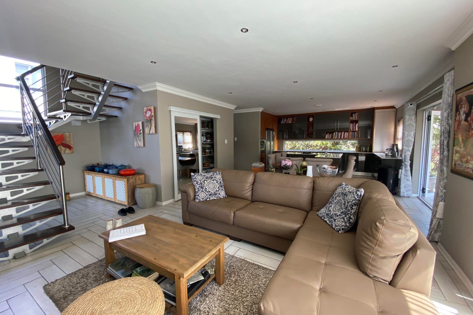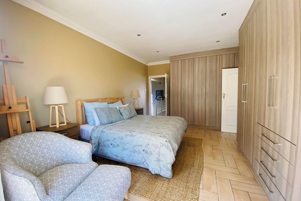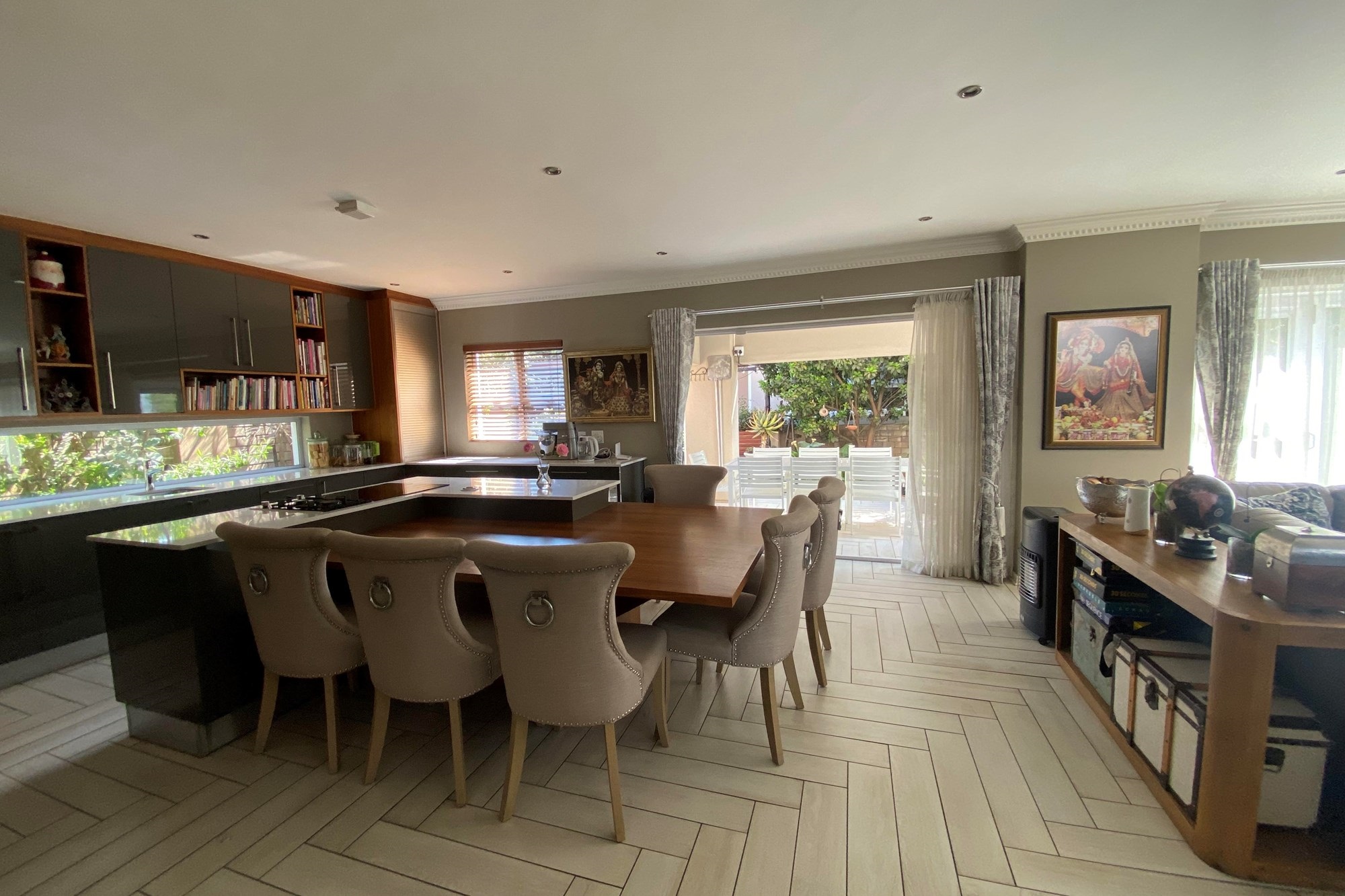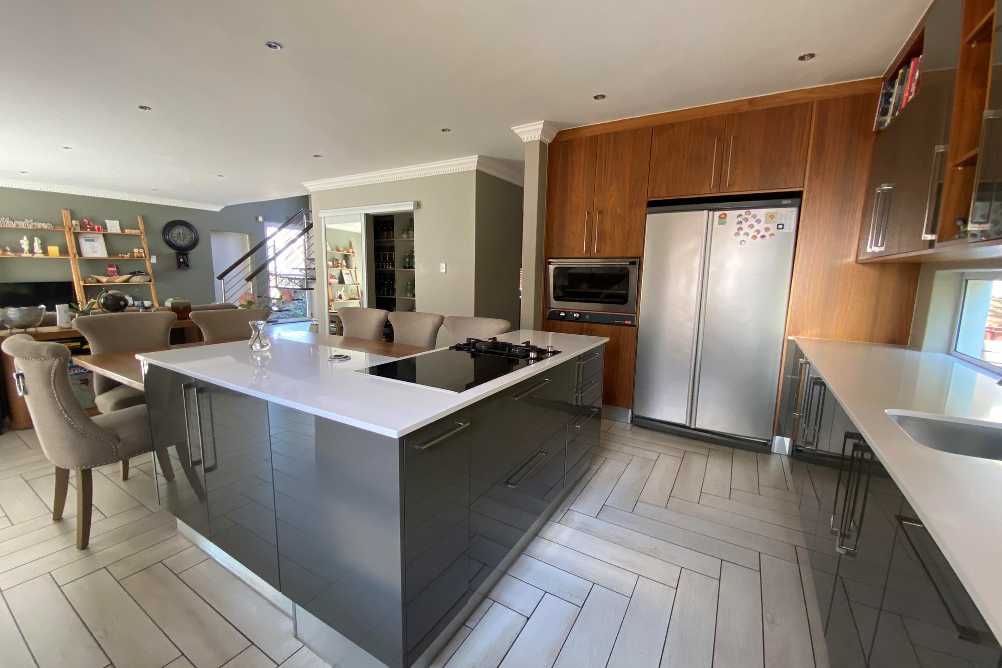 The Scandinavian-style kitchen is a chef`s dream, featuring elegant Caesarstone countertops, a dual gas and Siemens electric stove, separate electric oven, ample cupboard space , a large pantry, and a scullery accommodating a dishwasher, storage cupboard and a double sink making this kitchen as functional as it is beautiful. The kitchen is connected to the dining area with a beautiful genuine Oak dining table.