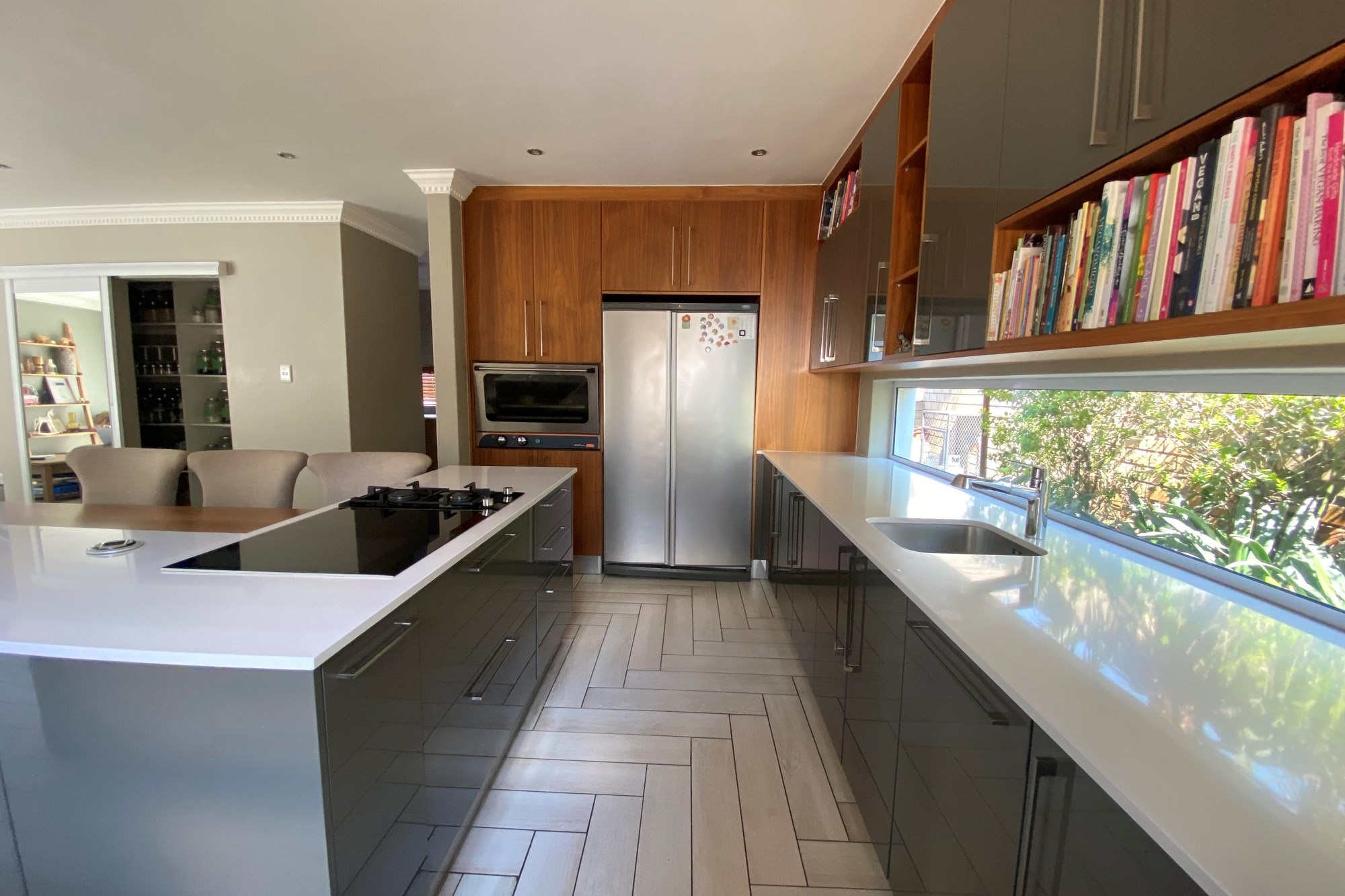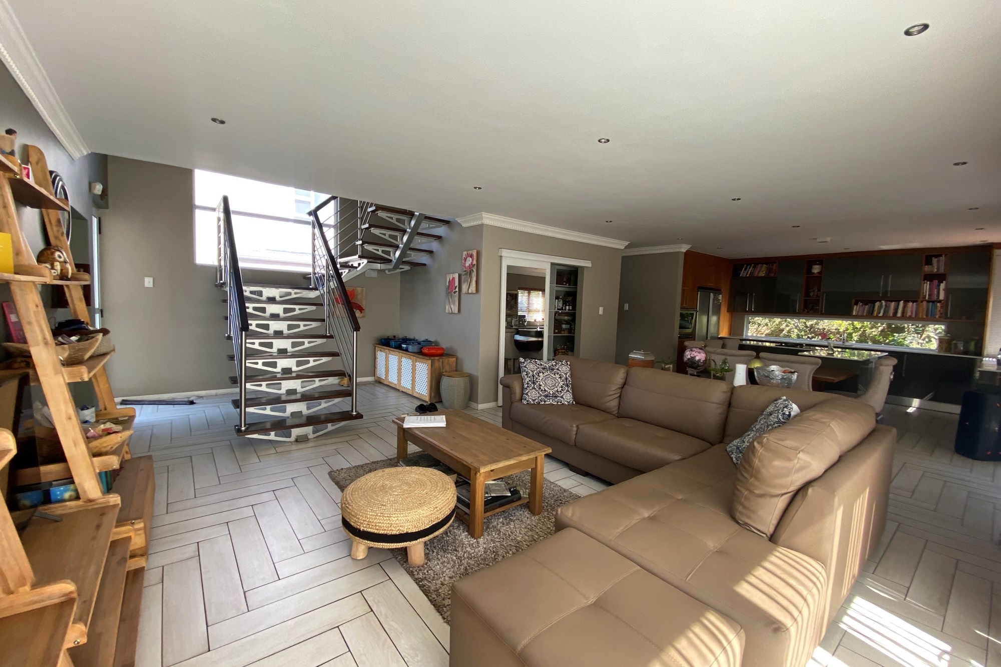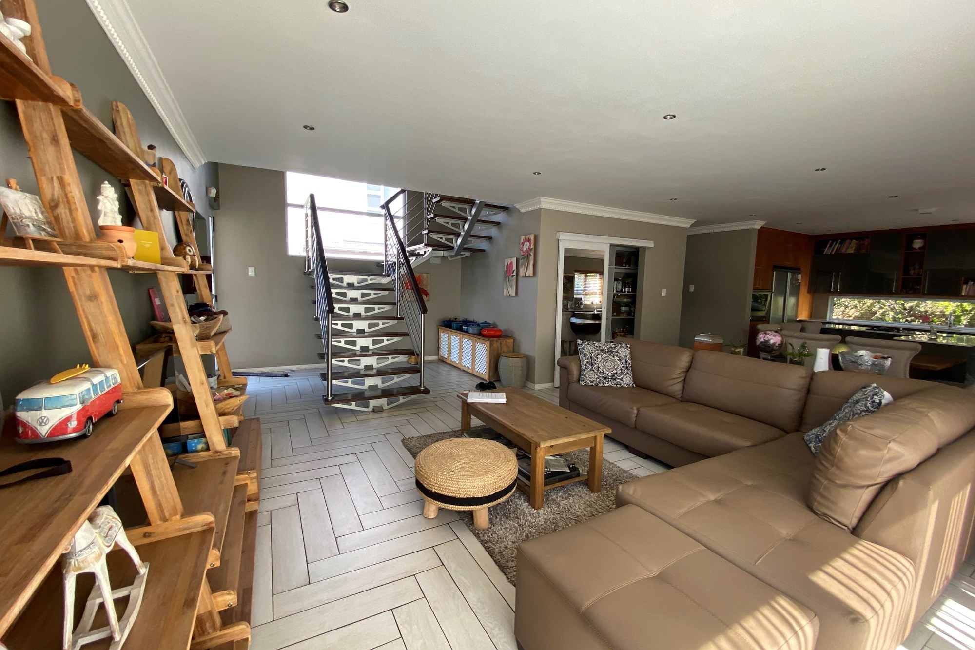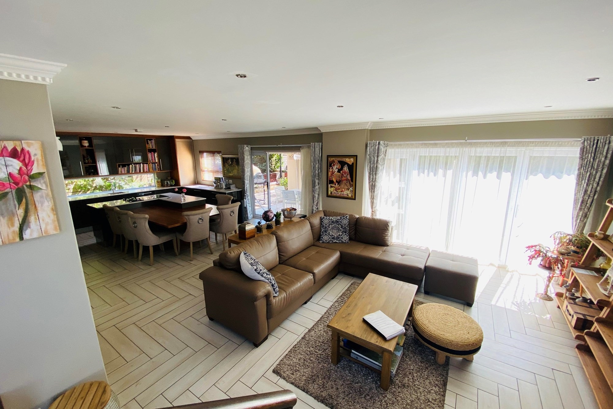 The Scandinavian-style kitchen is a chef`s dream, featuring elegant Caesarstone countertops, a dual gas and Siemens electric stove, separate electric oven, ample cupboard space , a large pantry, and a scullery accommodating a dishwasher, storage cupboard and a double sink making this kitchen as functional as it is beautiful. The kitchen is connected to the dining area with a beautiful genuine Oak dining table.