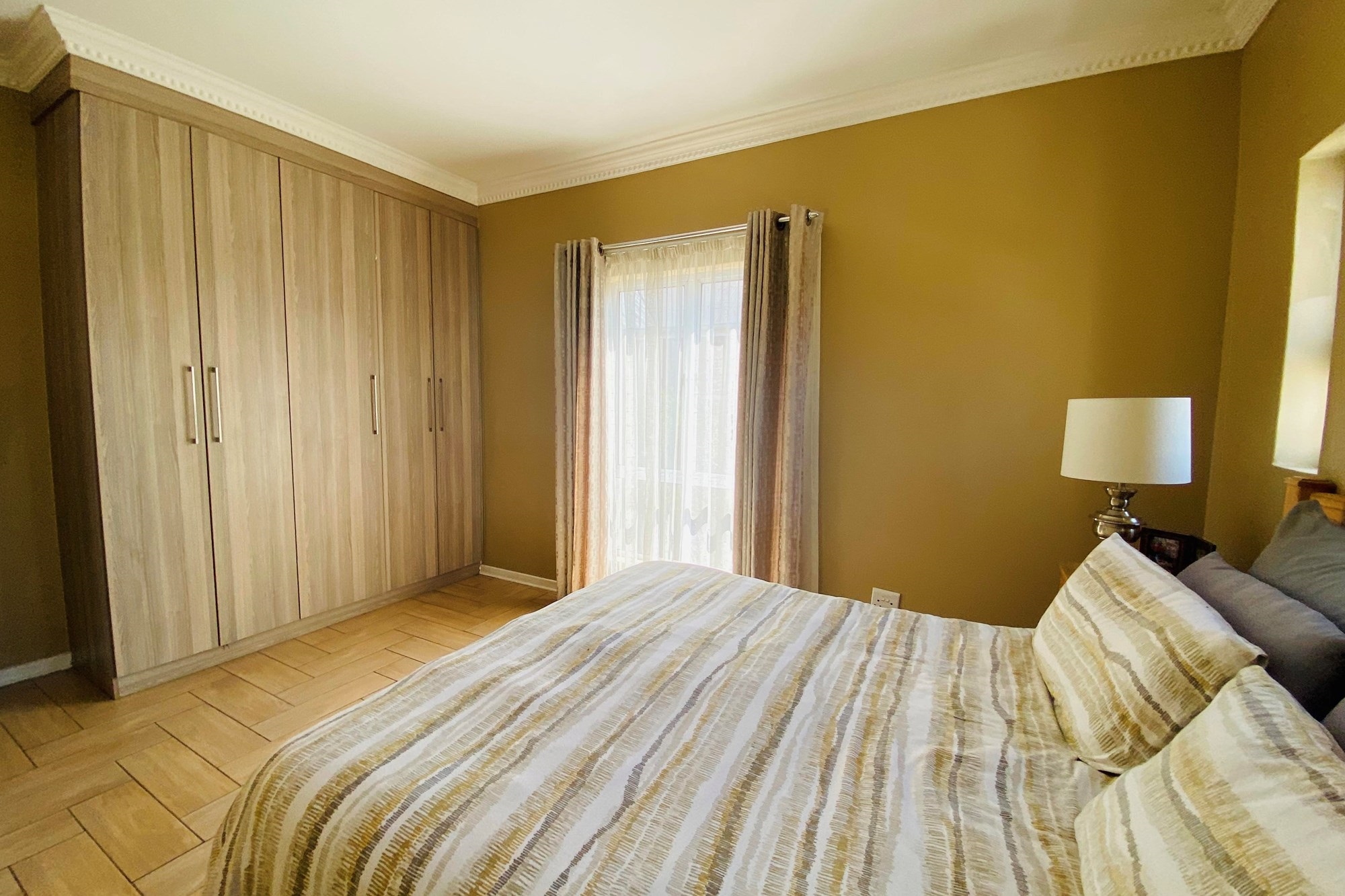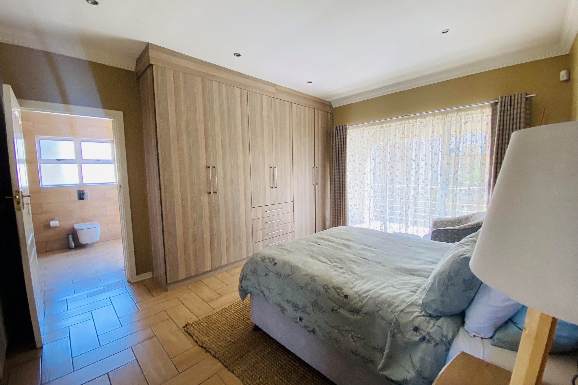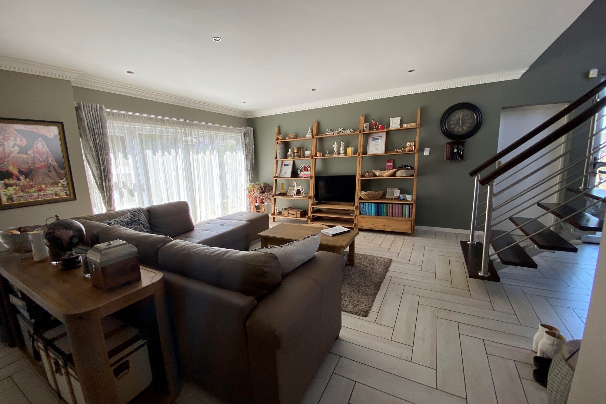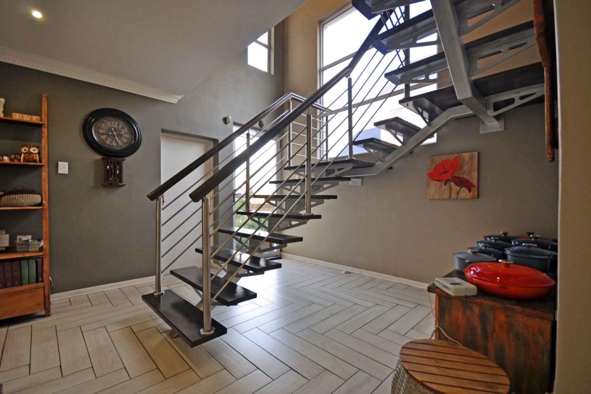 The Scandinavian-style kitchen is a chef`s dream, featuring elegant Caesarstone countertops, a dual gas and Siemens electric stove, separate electric oven, ample cupboard space , a large pantry, and a scullery accommodating a dishwasher, storage cupboard and a double sink making this kitchen as functional as it is beautiful. The kitchen is connected to the dining area with a beautiful genuine Oak dining table.