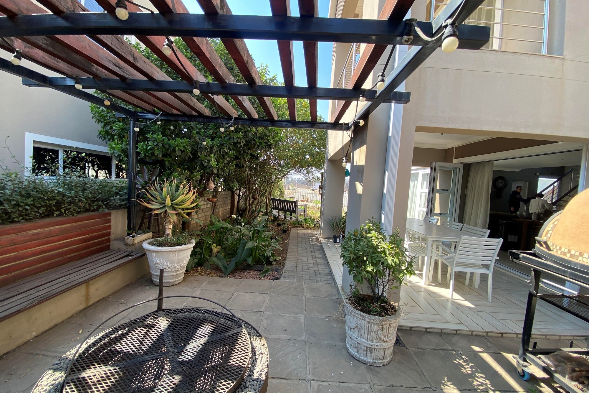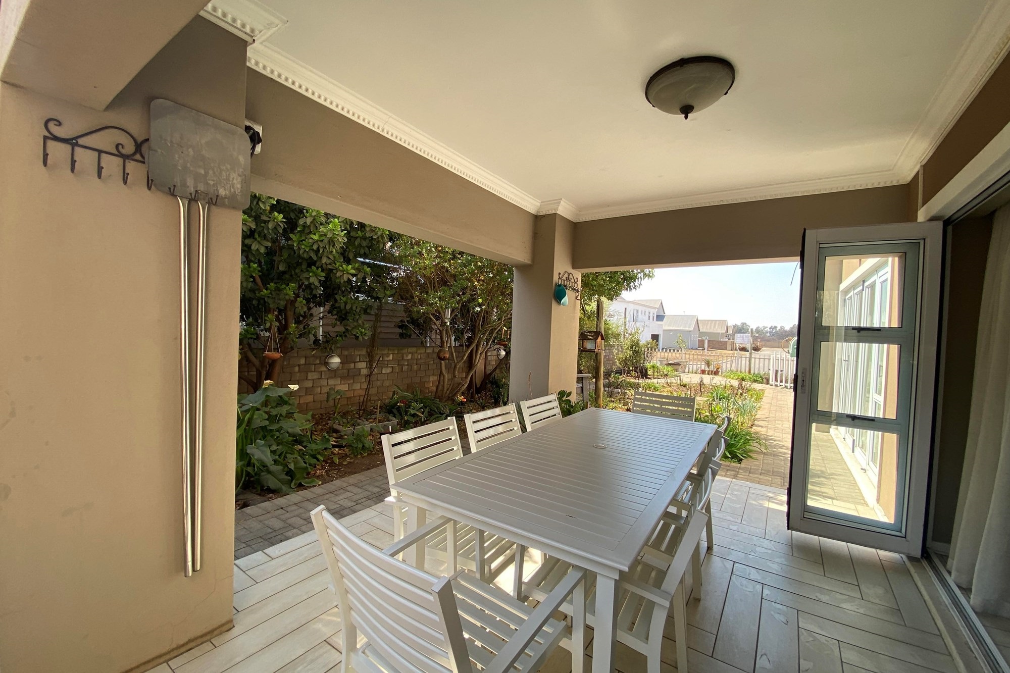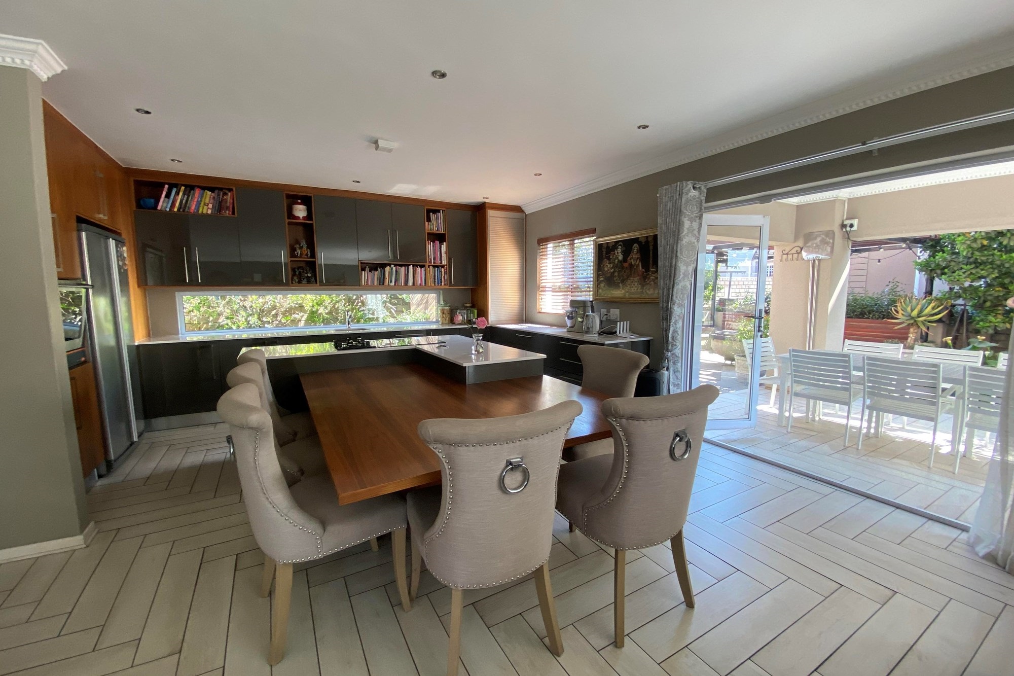 The open-plan dining area flows seamlessly from the kitchen, making it perfect for entertainment and everyday living. Overlooking a covered patio and a beautiful garden. With the foldable stacker doors you would not miss enjoying the outdoor ambiance in the forever green garden.
