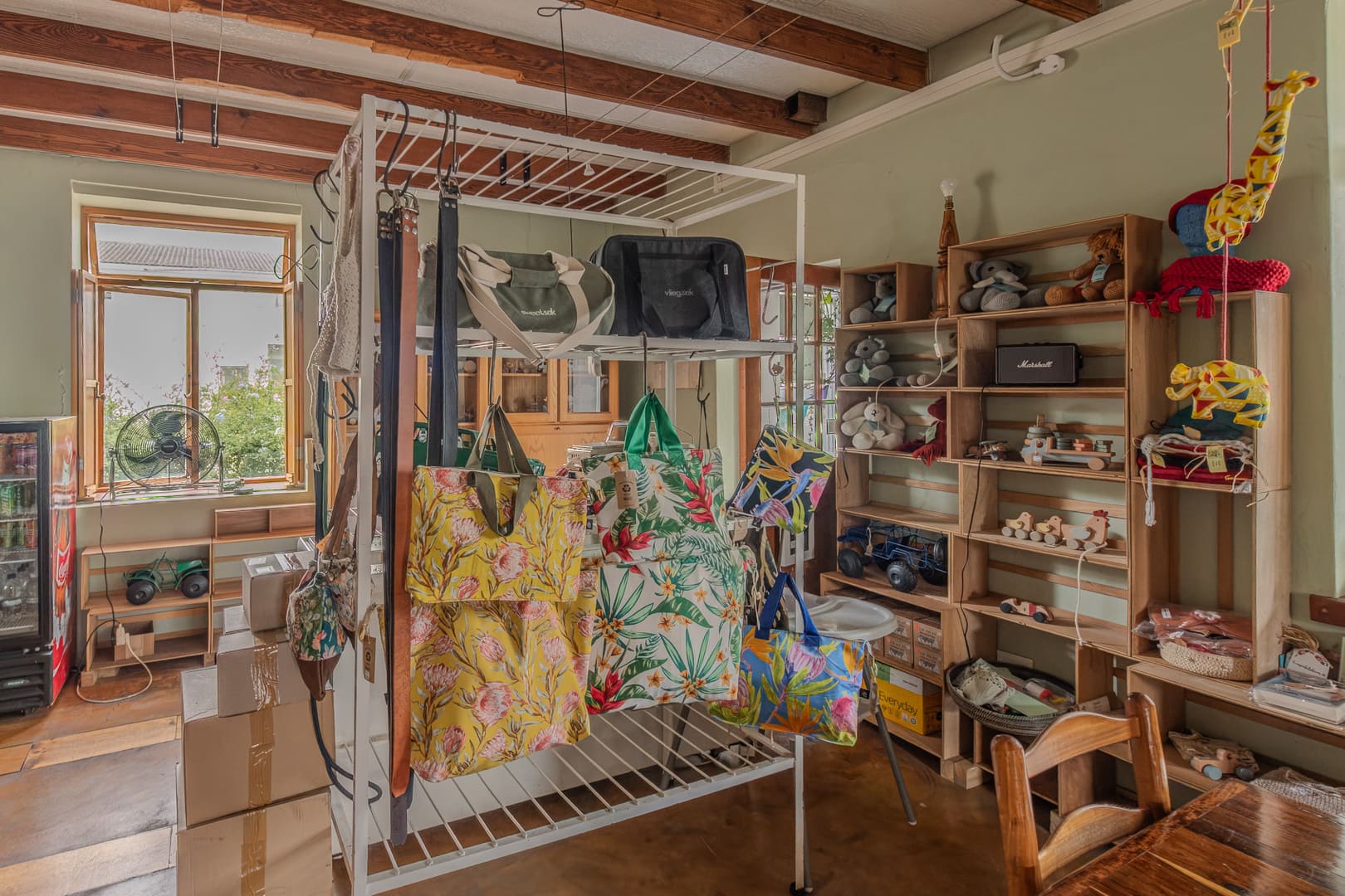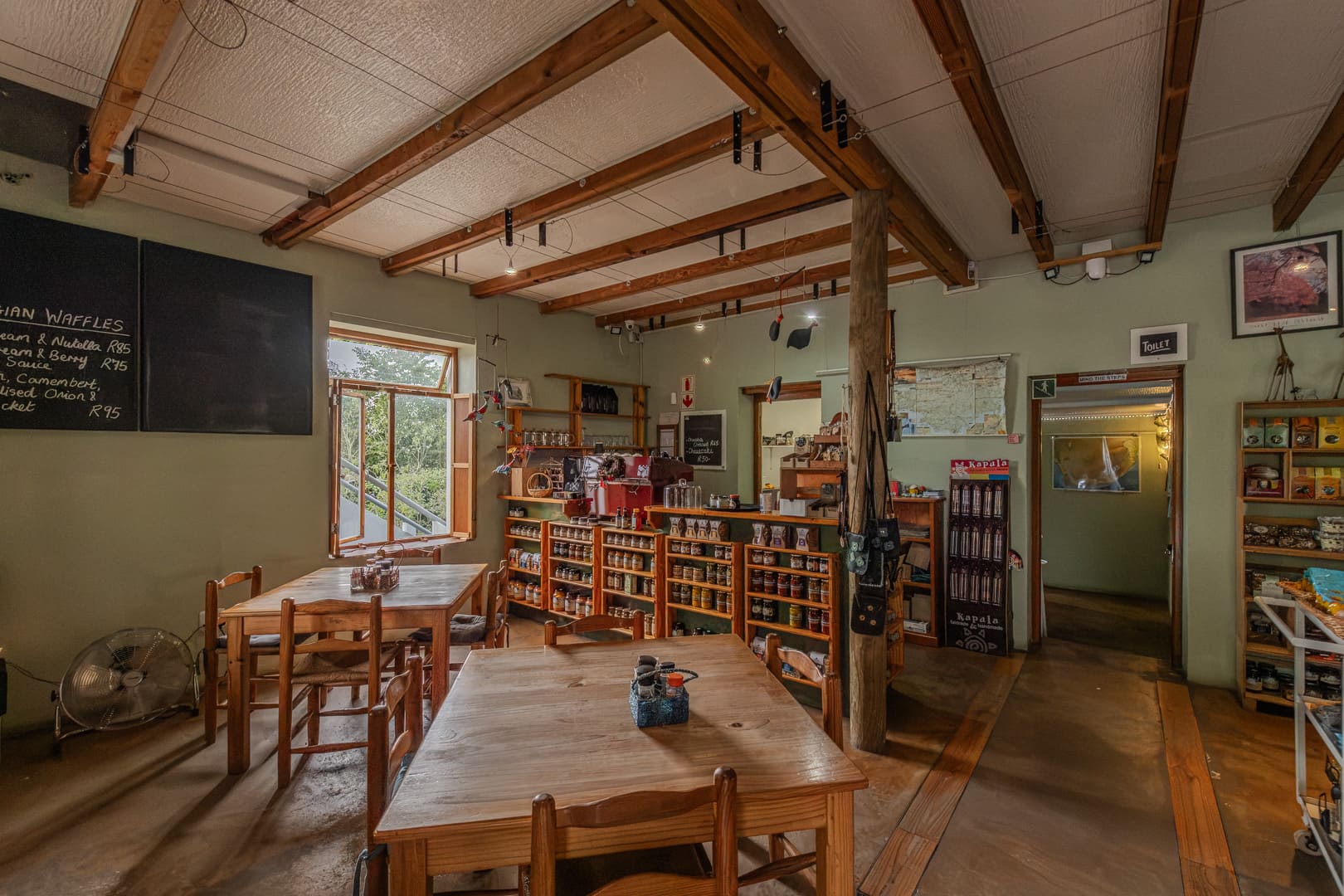 Upstairs is an open space currently used as an office, accessed via an outside staircase. With the addition of an internal staircase, this area could easily become an art gallery, studio, wine-tasting space, or an extension of the café’s craft and gift shop. The large balcony upstairs offers stunning, uninterrupted mountain views.