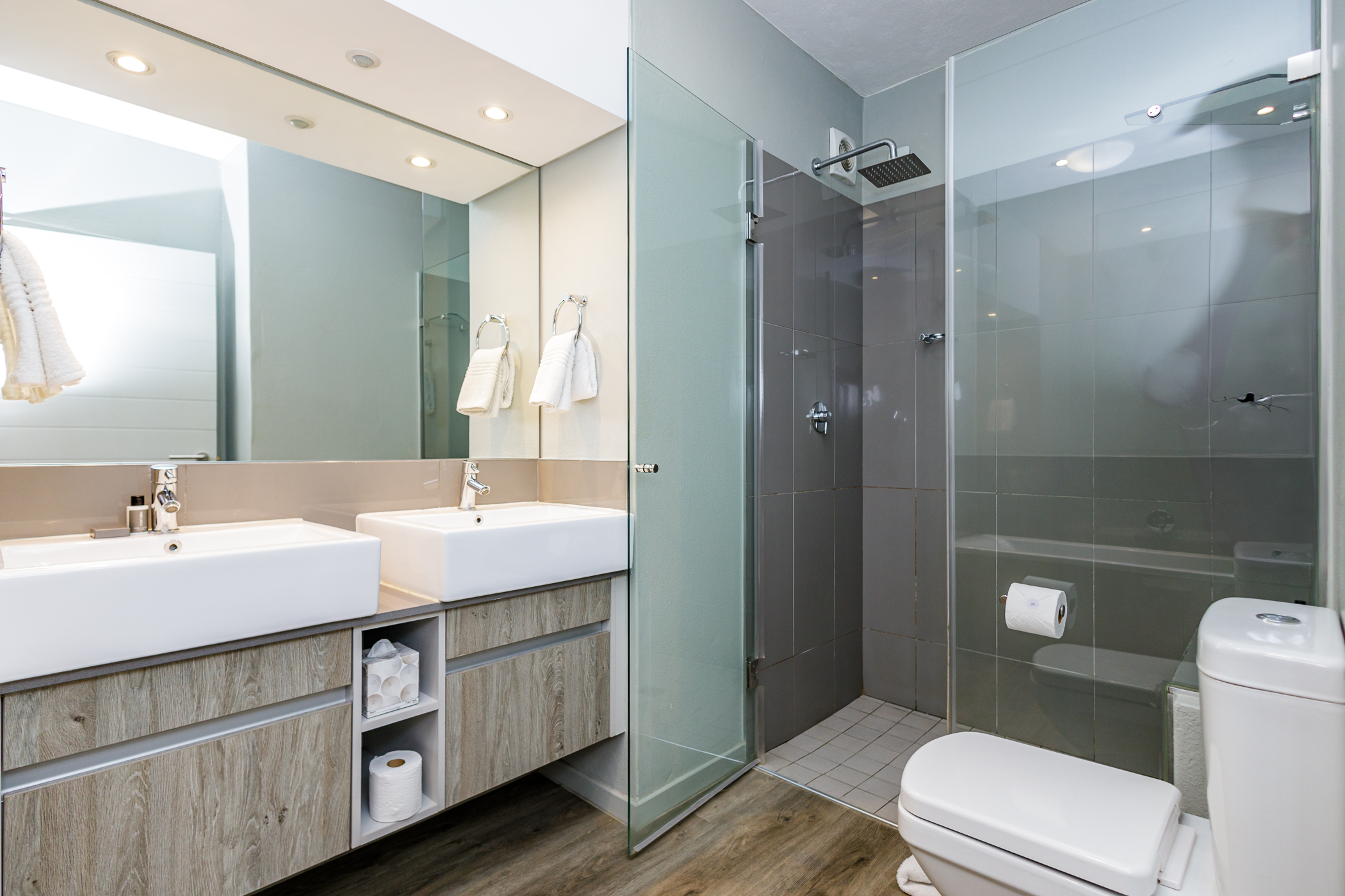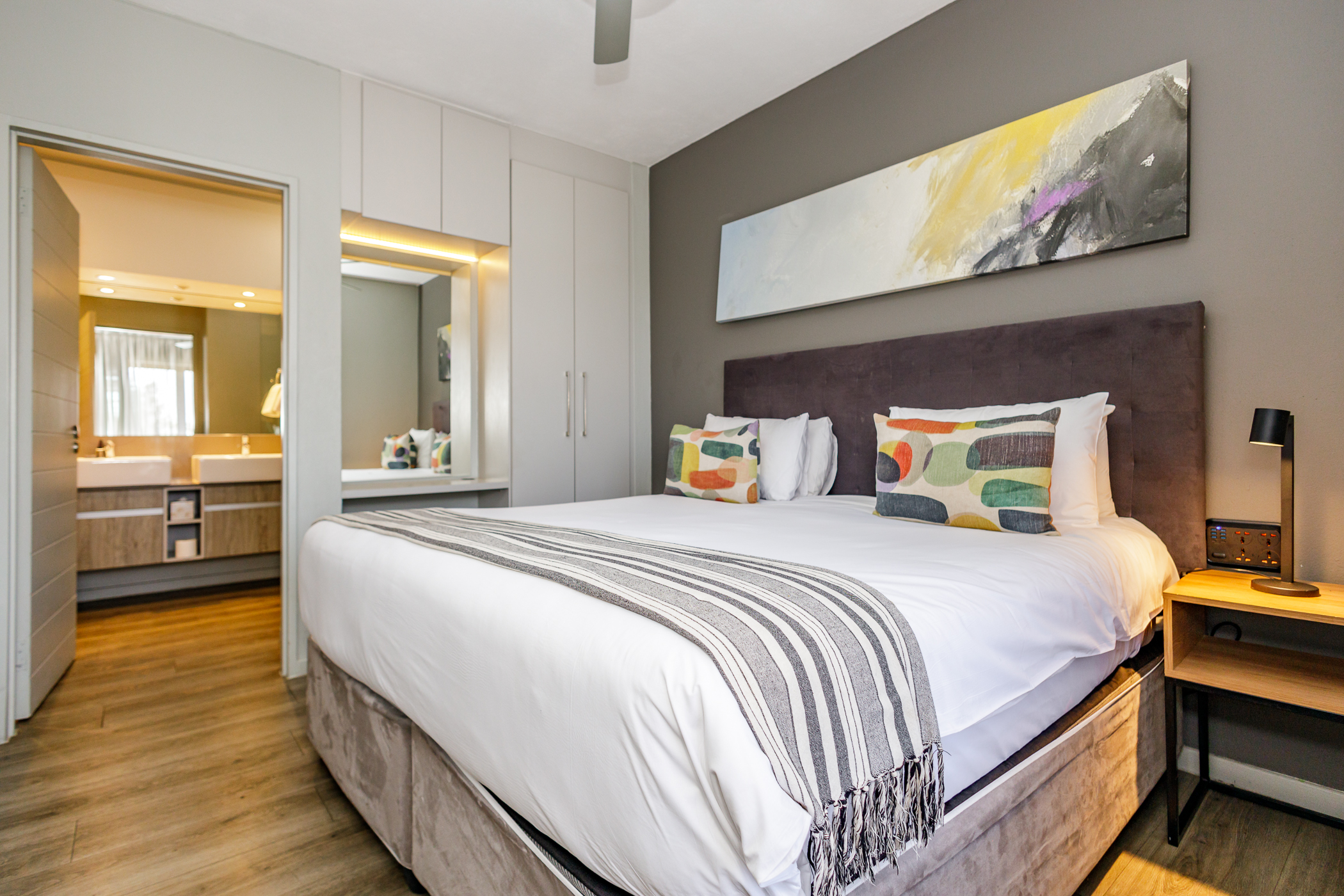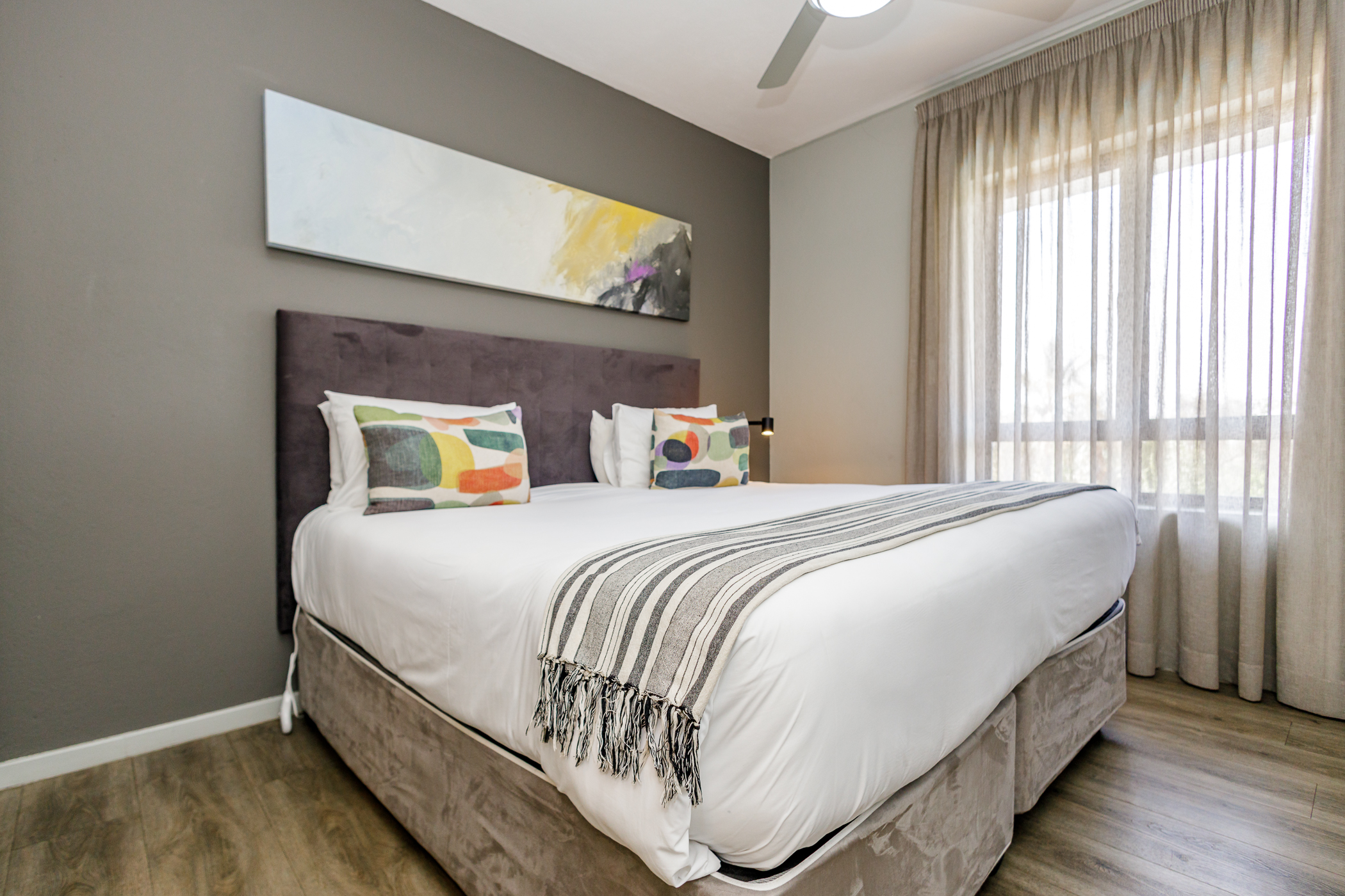 Spacious bedroom with timber vinyl floors, built in cupboards for his and hers.