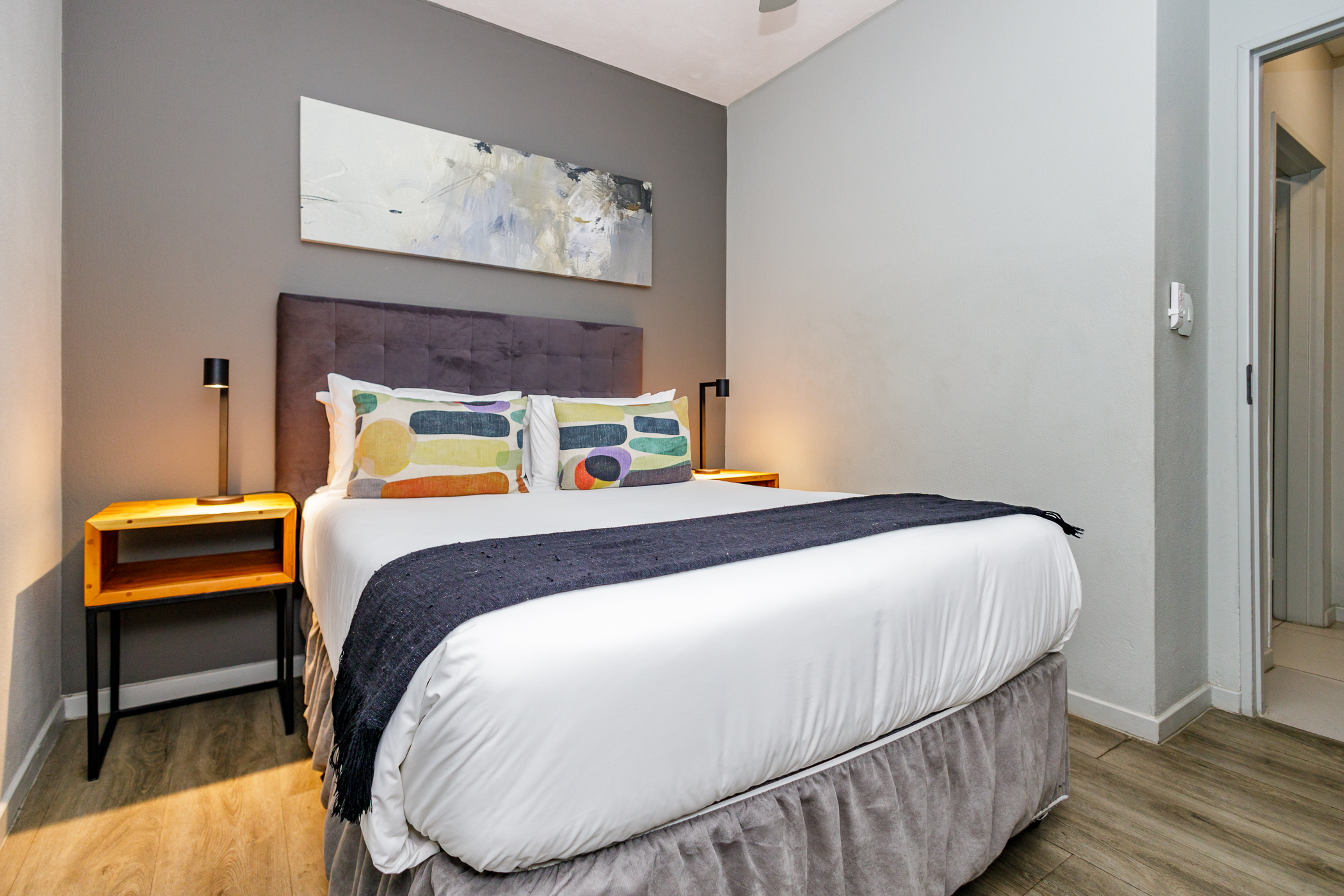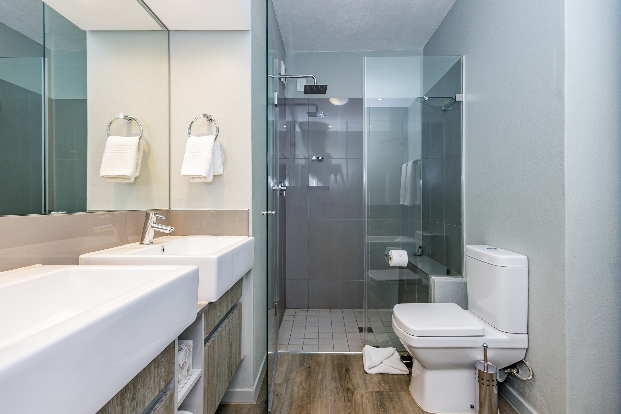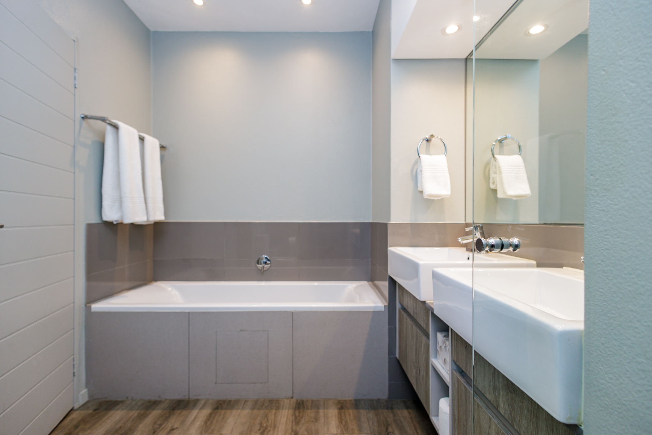 Spacious bedroom with timber vinyl floors, built in cupboards for his and hers.