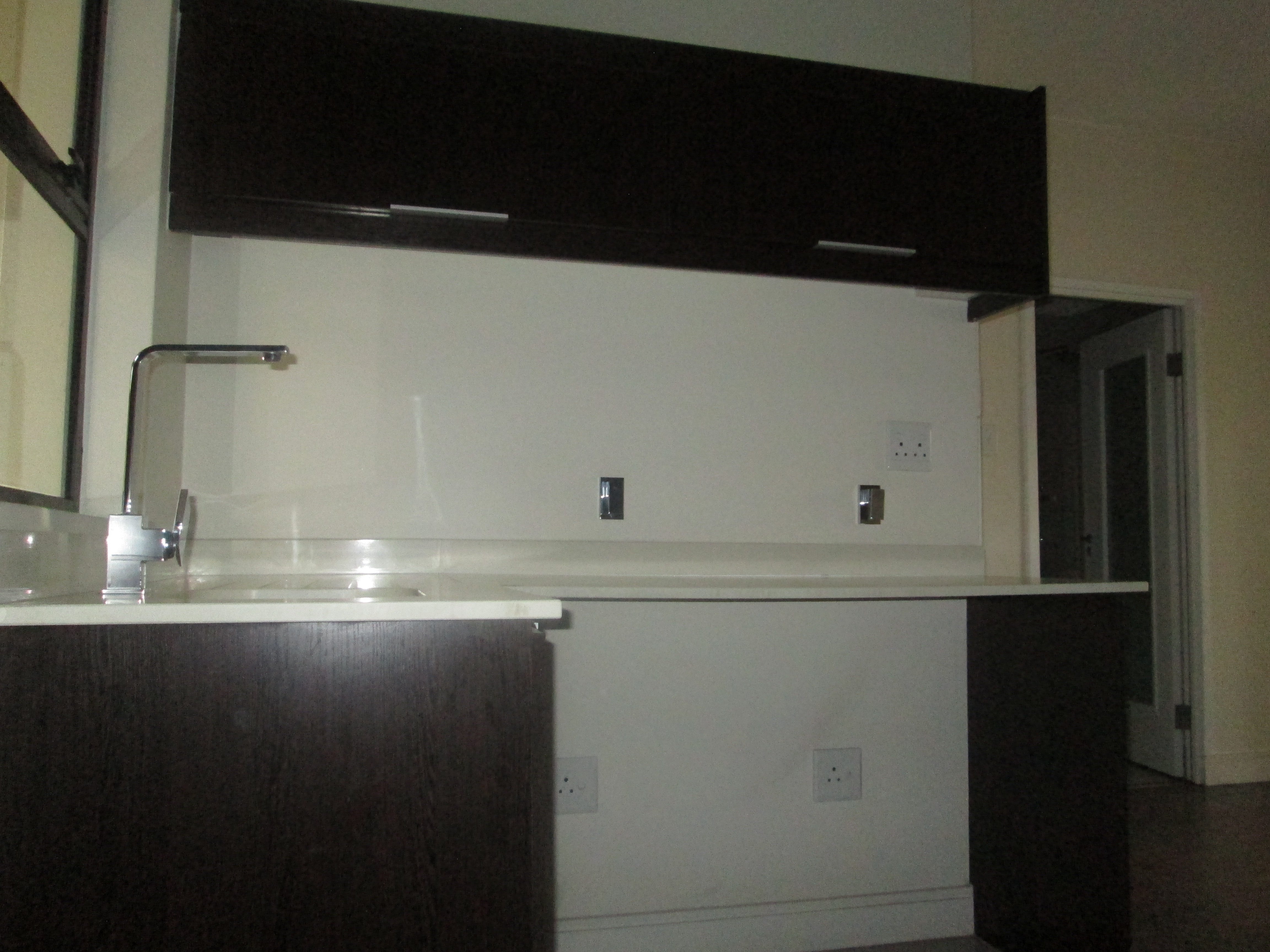 Modern tiled kitchen with granite tops, fitted stove and build in cupboard.