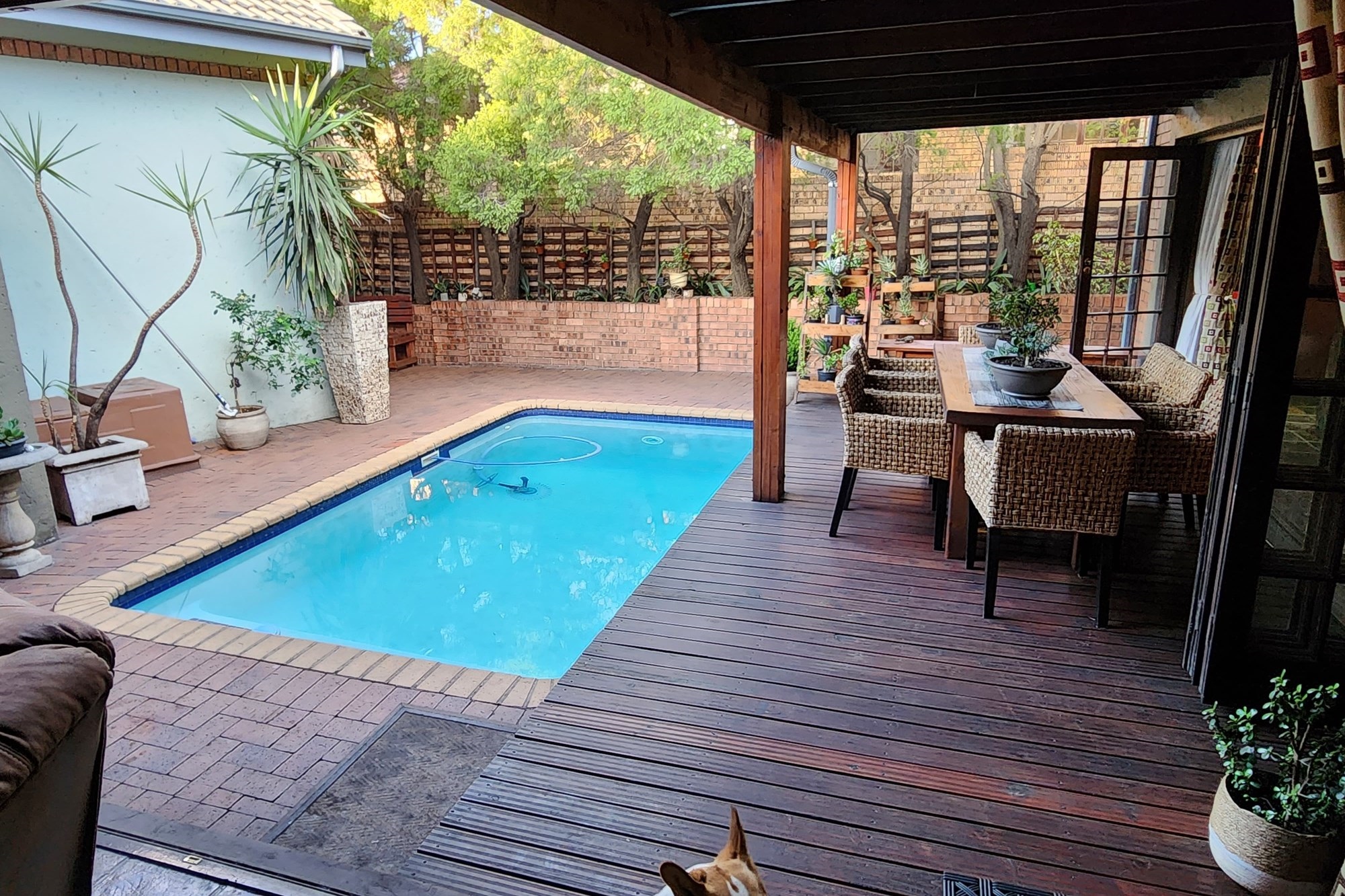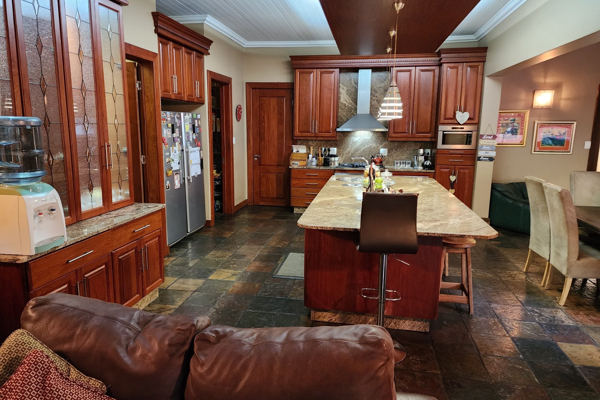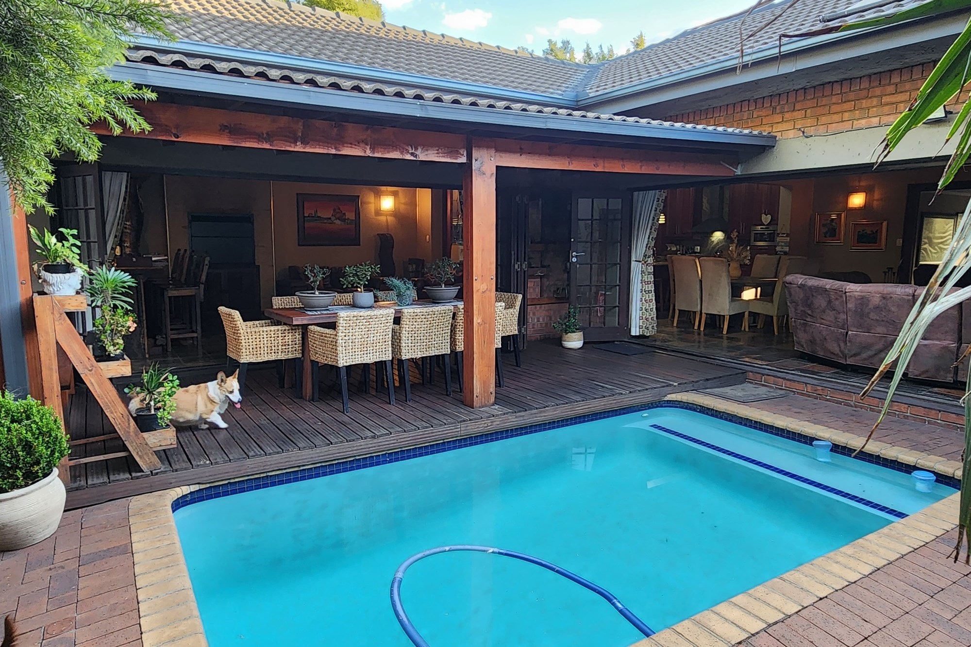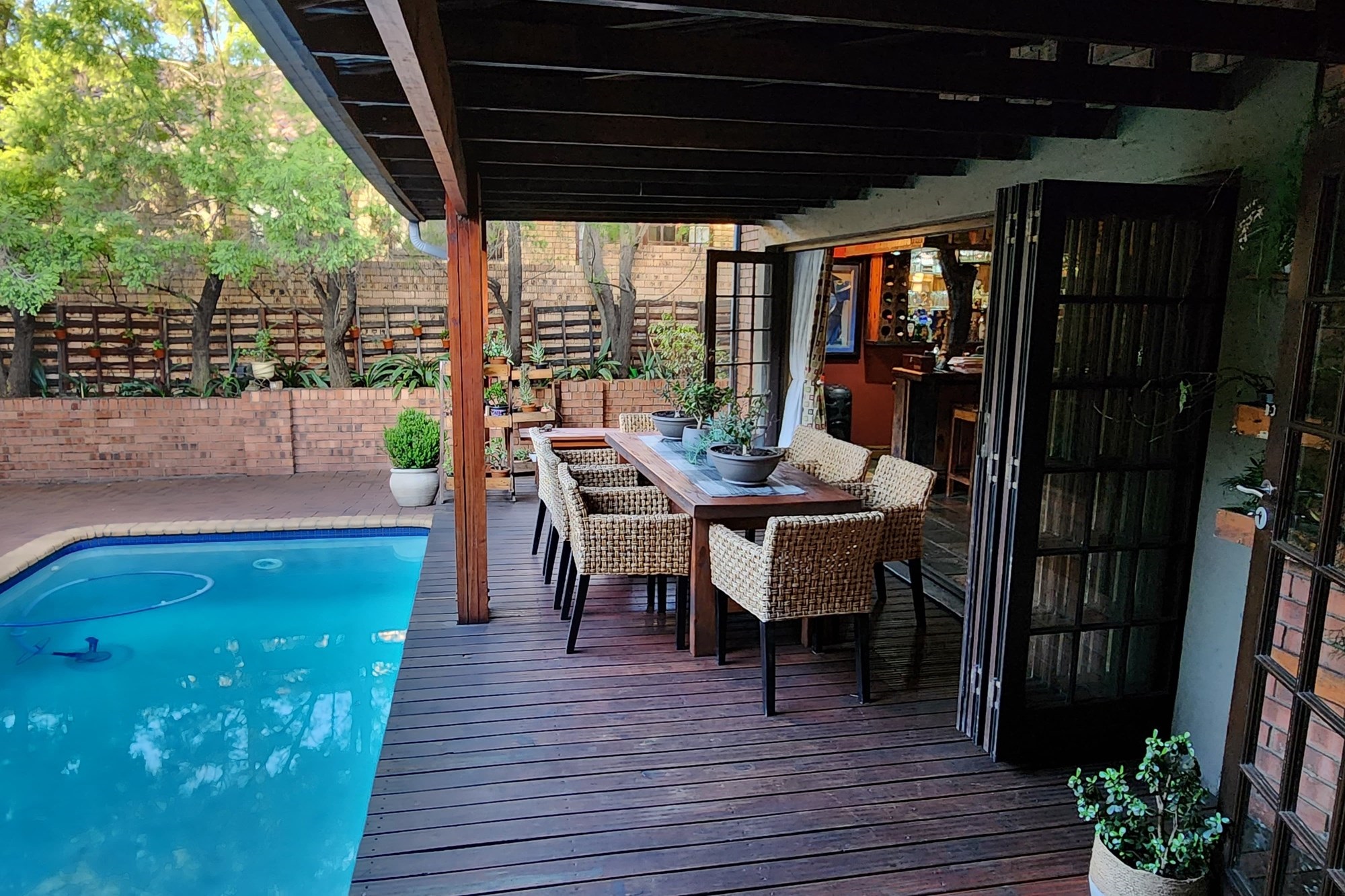 Step inside to an elegant open-plan living area, seamlessly connecting the lounge, kitchen, dining room, and built-in bar. The space flows effortlessly through stacking doors onto a covered patio with a wooden deck and sparkling pool, ideal for entertaining. The solid Rosewood kitchen is a chef’s dream, featuring a nook island, separate scullery, pantry, and a gas hob for effortless cooking.