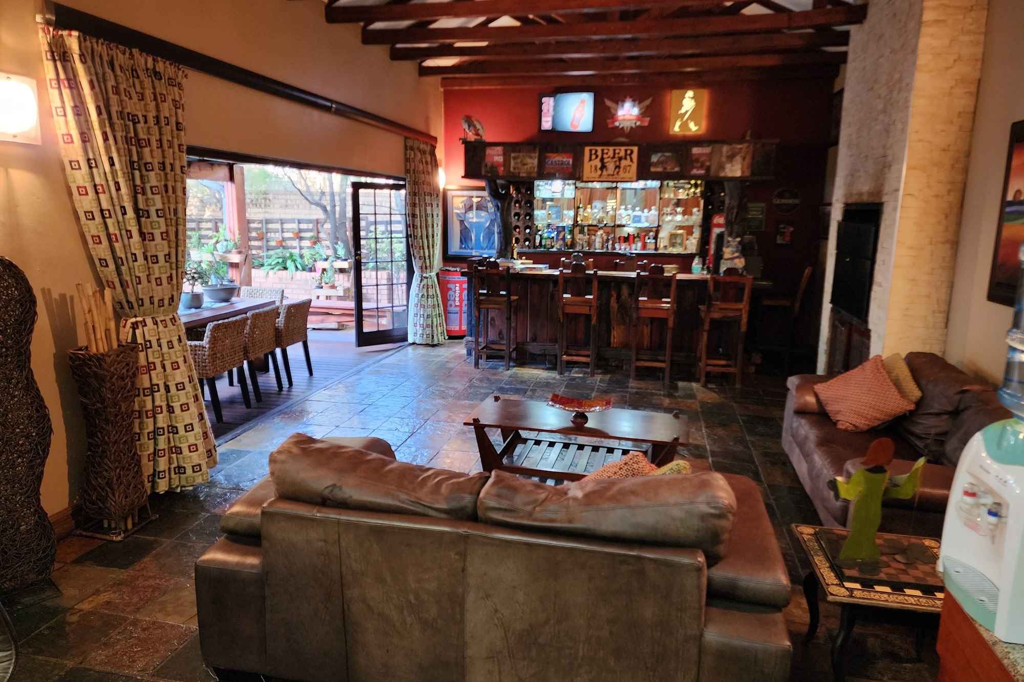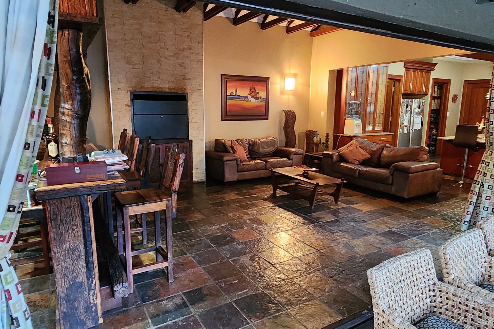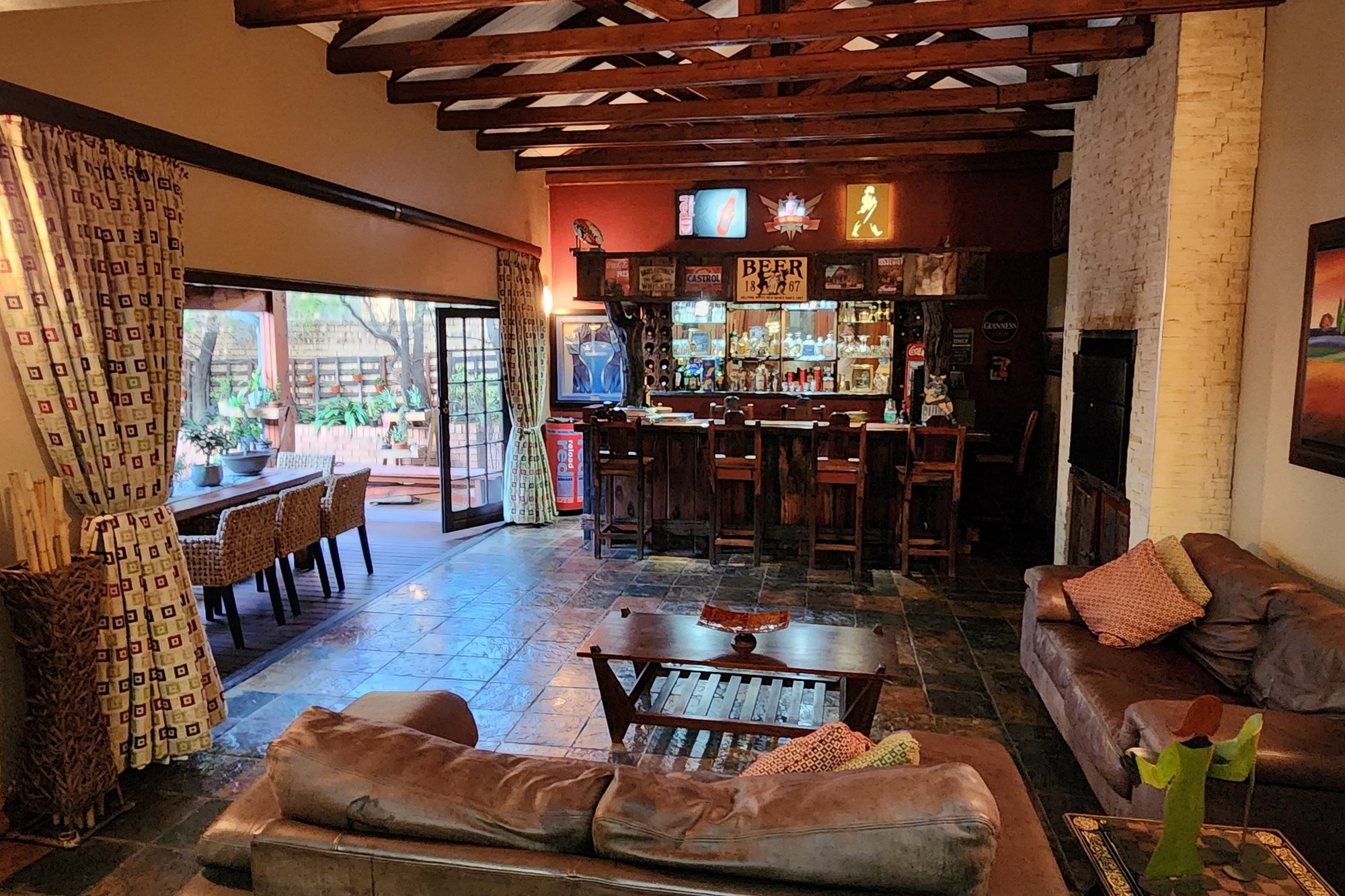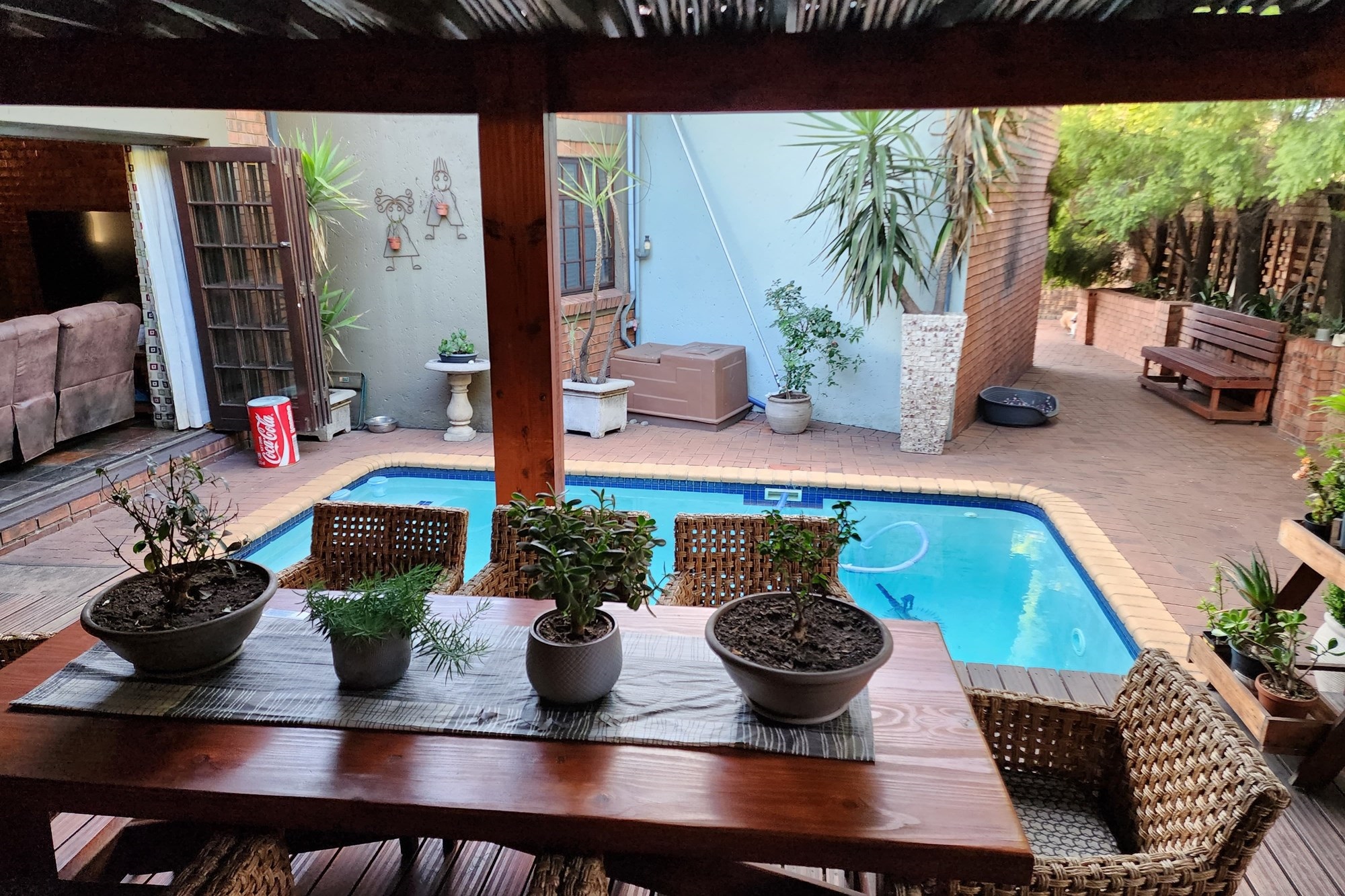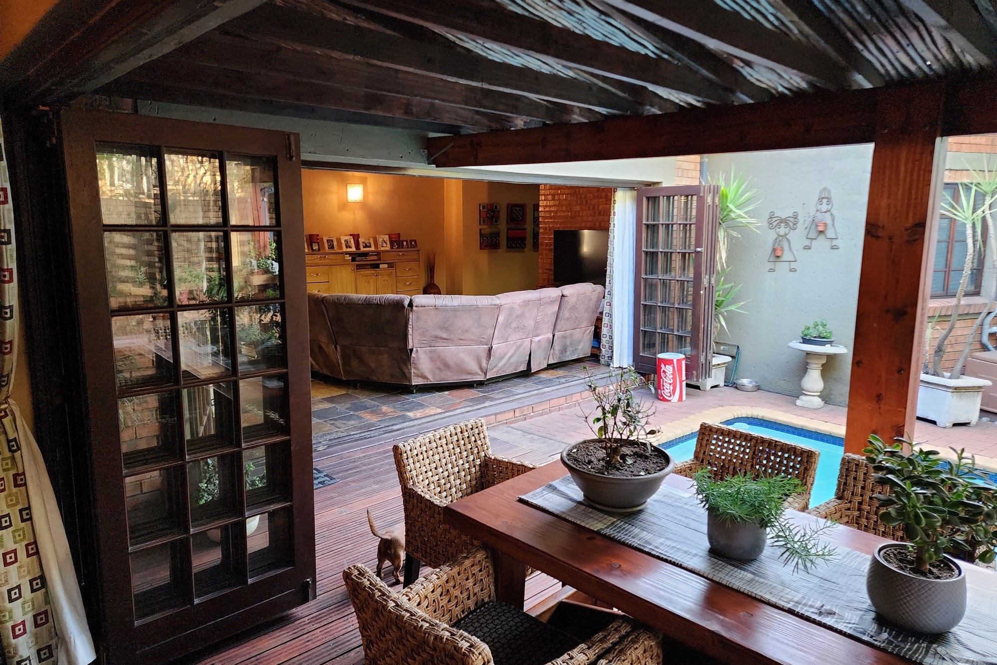 Step inside to an elegant open-plan living area, seamlessly connecting the lounge, kitchen, dining room, and built-in bar. The space flows effortlessly through stacking doors onto a covered patio with a wooden deck and sparkling pool, ideal for entertaining. The solid Rosewood kitchen is a chef’s dream, featuring a nook island, separate scullery, pantry, and a gas hob for effortless cooking.