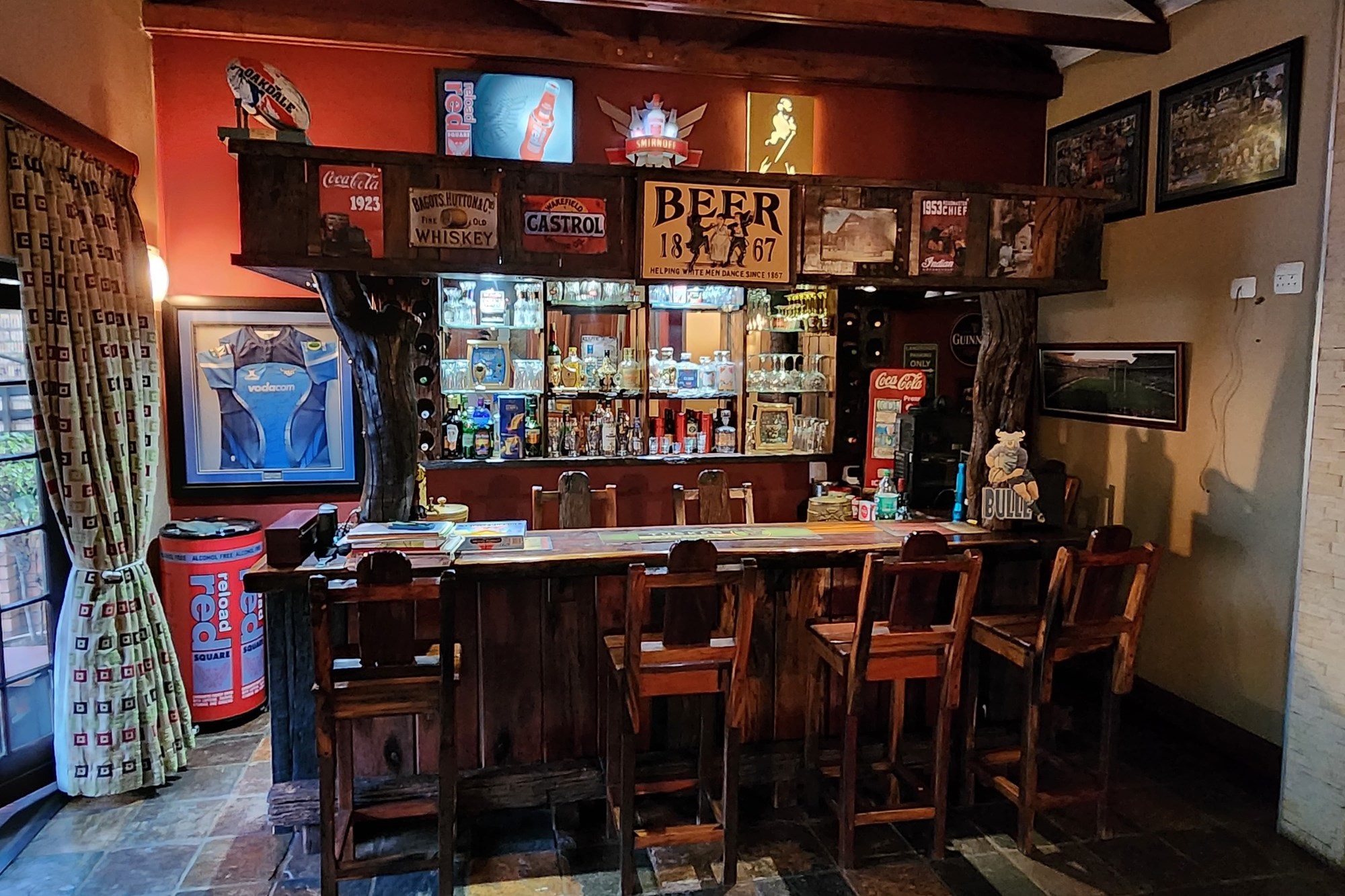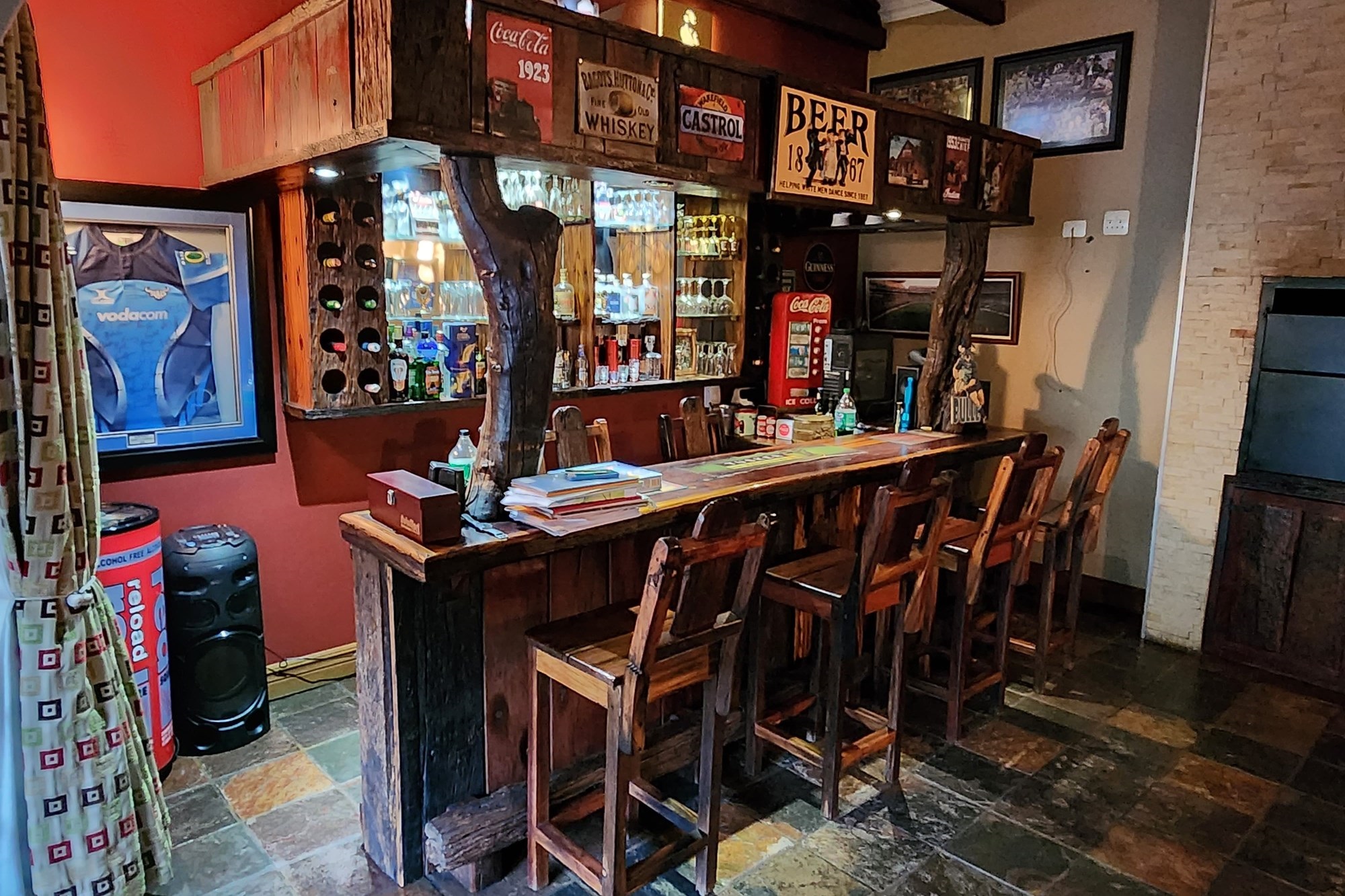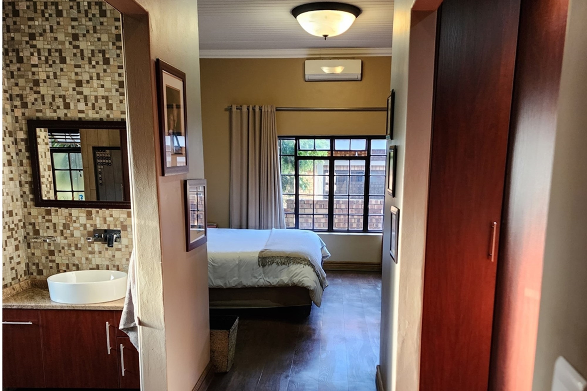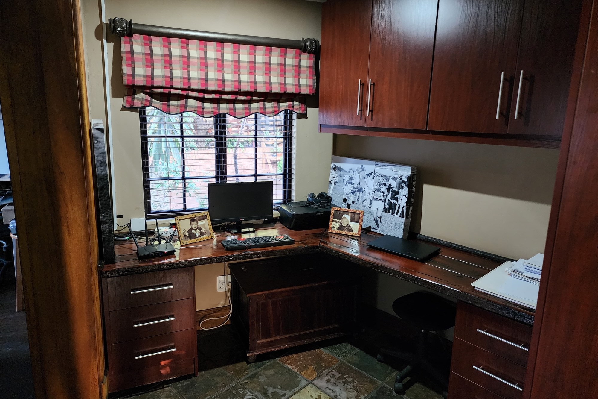 Step inside to an elegant open-plan living area, seamlessly connecting the lounge, kitchen, dining room, and built-in bar. The space flows effortlessly through stacking doors onto a covered patio with a wooden deck and sparkling pool, ideal for entertaining. The solid Rosewood kitchen is a chef’s dream, featuring a nook island, separate scullery, pantry, and a gas hob for effortless cooking.