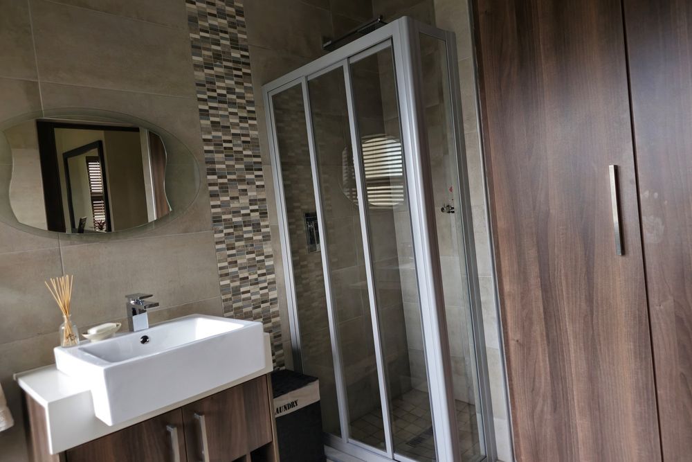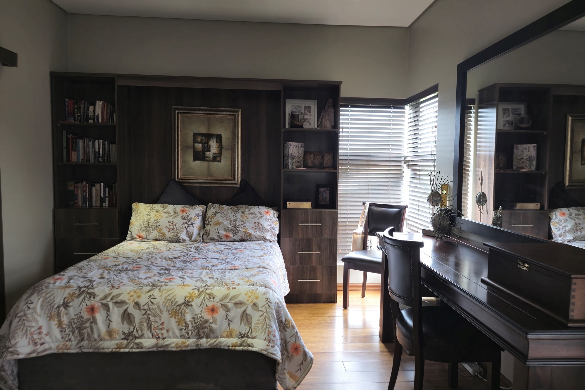 Your vehicles will be securely housed in the double garage with a motorized door. The property is equipped with a 2500L Jo-jo tank with a pressure pump, a generator switchover switch, and a borehole that can be connected if desired. Additional features include a storeroom, an outside toilet, and an irrigation system to keep your garden looking its best year-round.