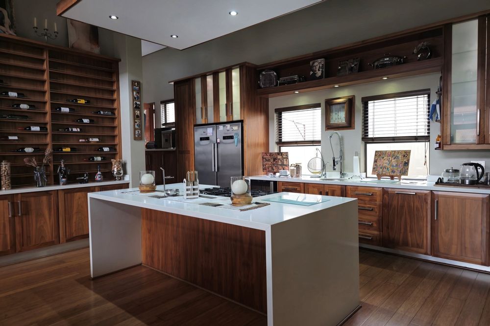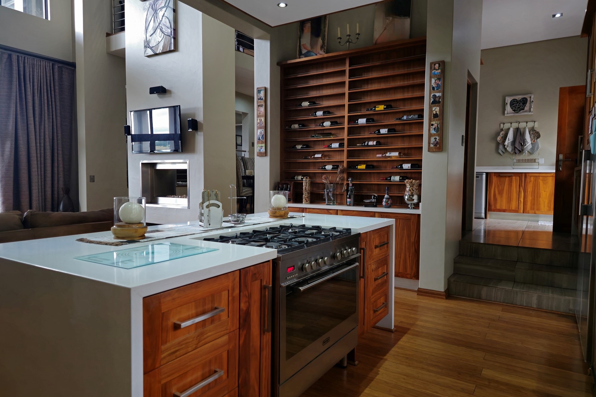 The stylish open-plan kitchen is designed for modern living, featuring a center island with a breakfast nook, a 5-plate gas hob, and sleek Caesarstone countertops. Wine enthusiasts will appreciate the custom wine rack, perfectly integrated into the kitchen`s design. The kitchen is complete with ample cupboard space, a walk-in pantry, and a separate scullery and laundry area that provides access to the outside. A water filtration system ensures that you have fresh, clean water on demand.