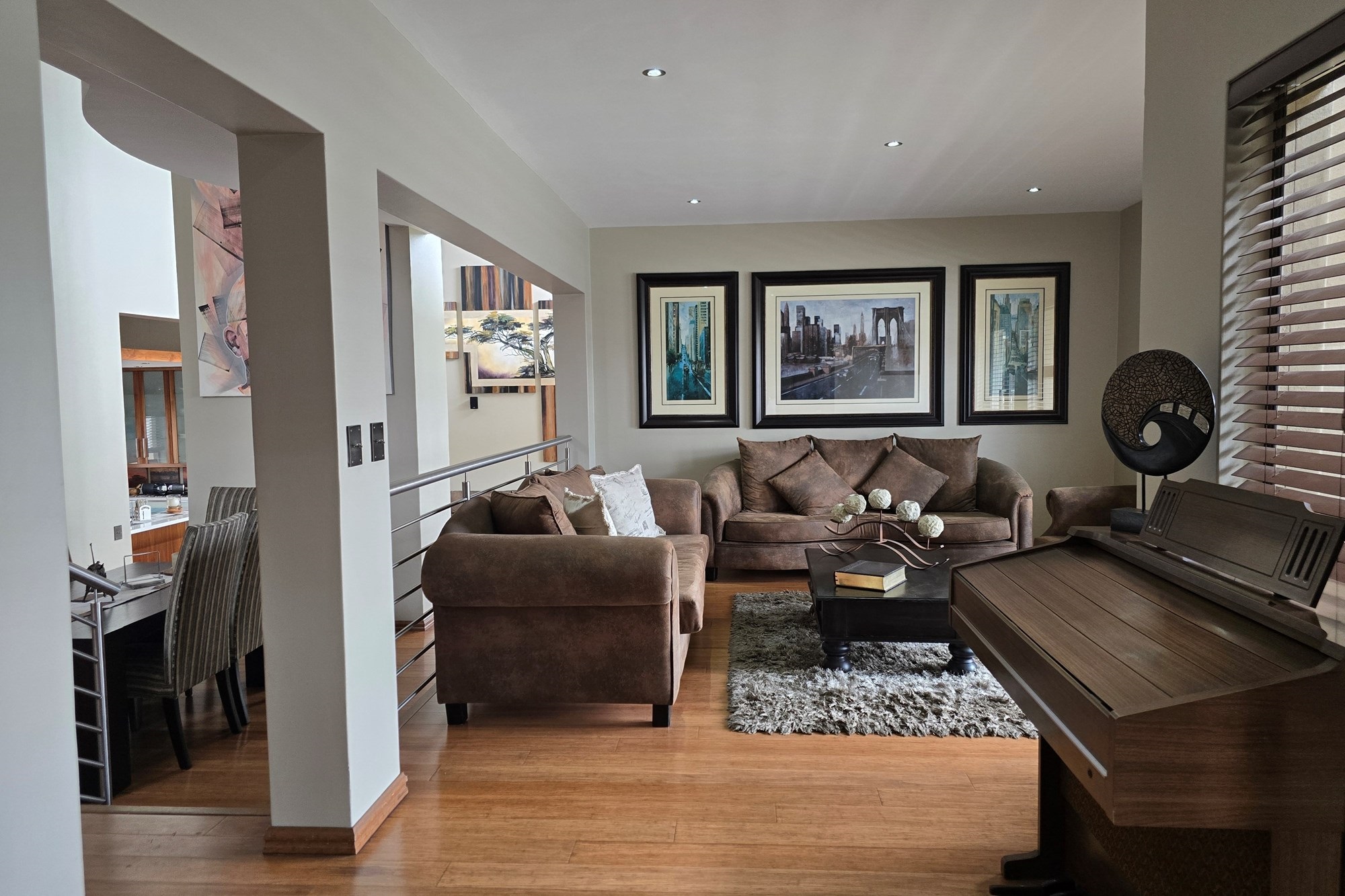 Step through the beautifully landscaped front garden and enter a world of elegance and comfort. The home greets you with an impressive entrance portal, providing an elevated view of the expansive living areas. The formal lounge, featuring doors that open to the patio, and the well-appointed study with ample cupboard space, are conveniently located on the entrance level, along with a guest cloakroom for visitors.