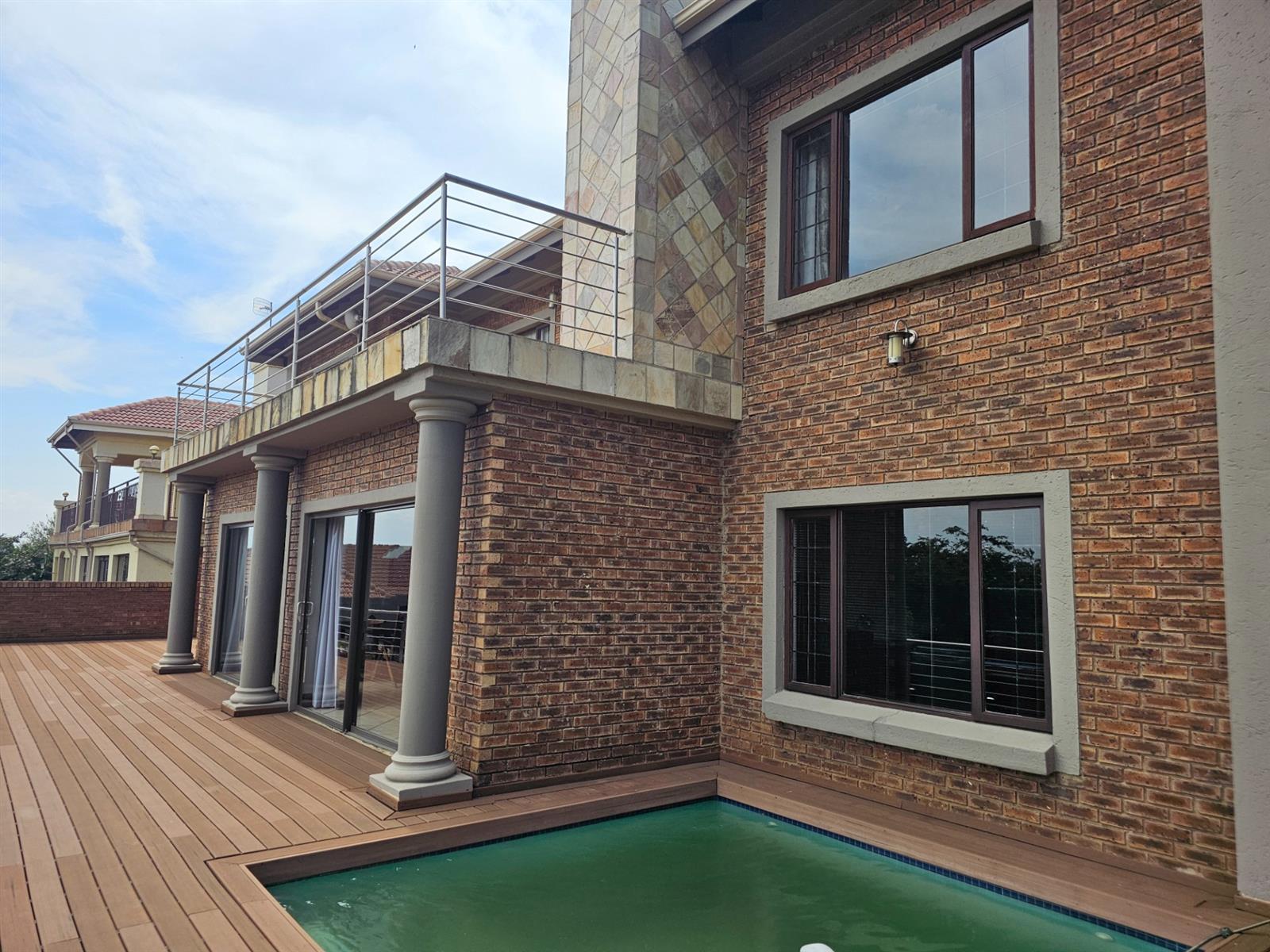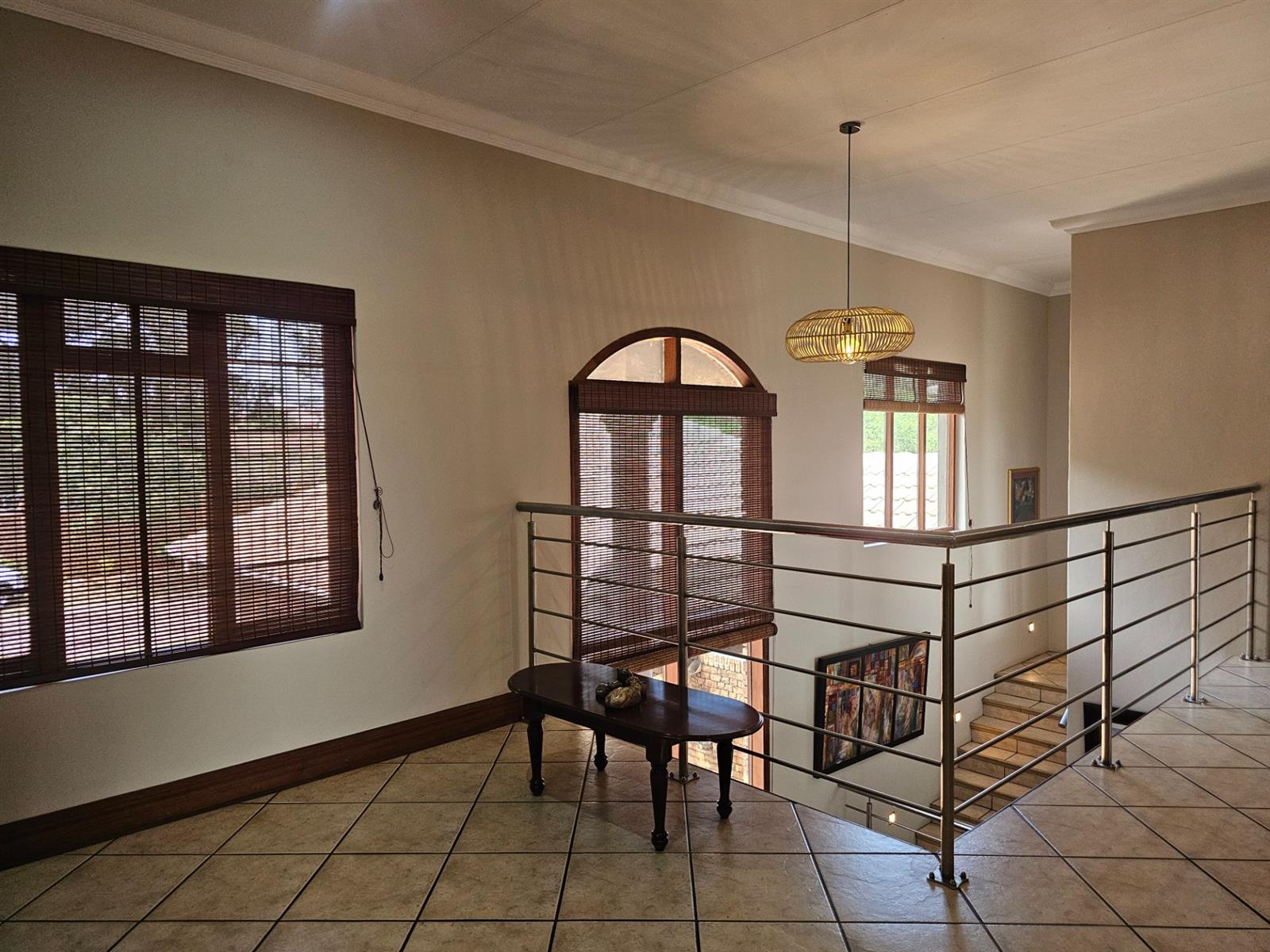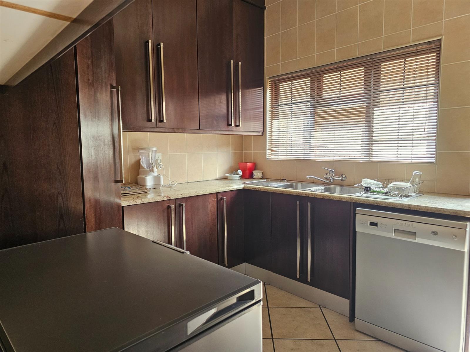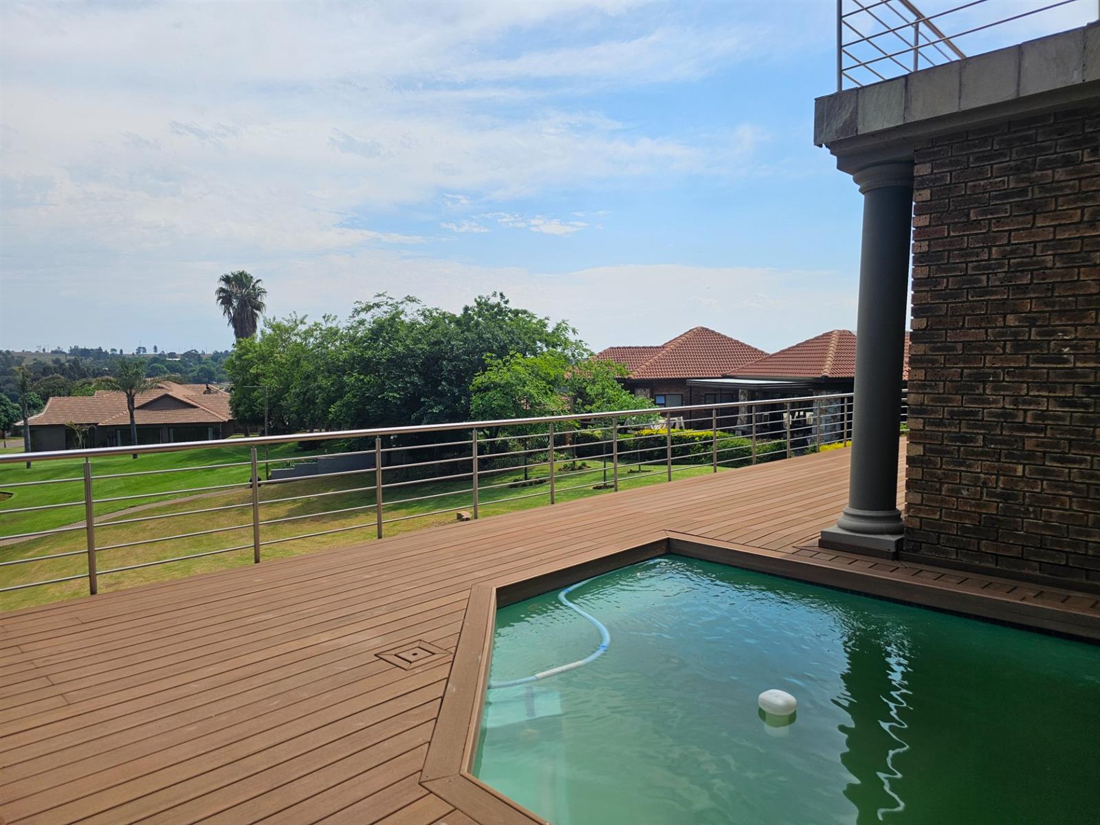 The home welcomes you with open-plan living areas that flow seamlessly to the kitchen with a separate scullery, leading out onto a deck and sparkling pool that offer fantastic views over the dam and park. Entertain effortlessly in the braai room, complete with a built-in braai and bar, ideal for hosting family and friends.