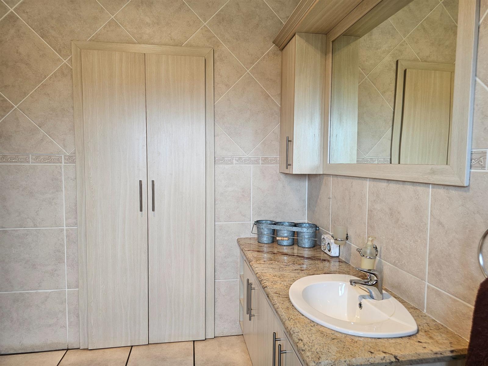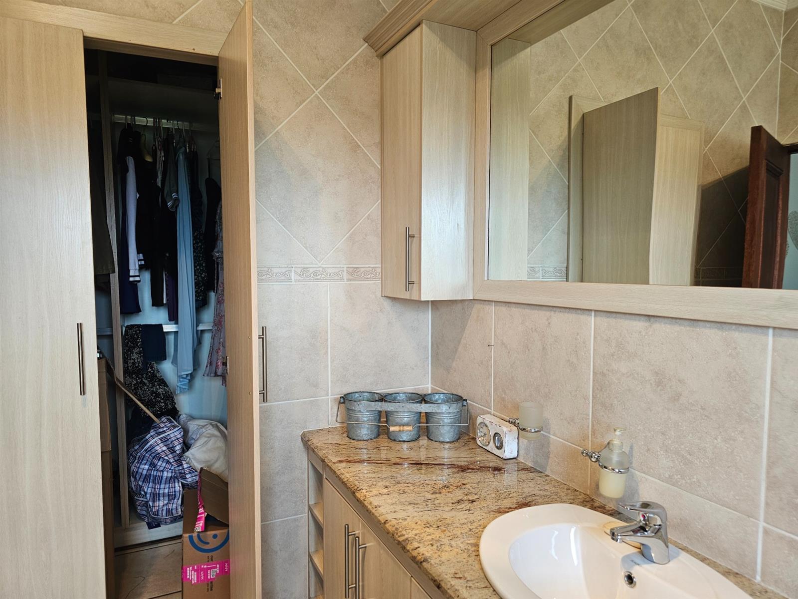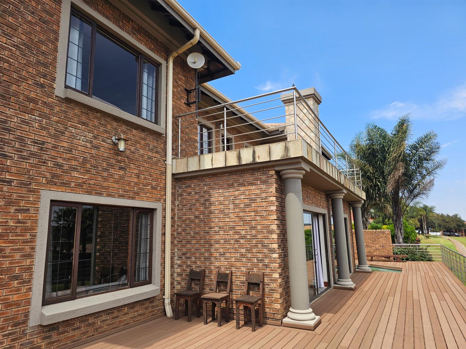 The home welcomes you with open-plan living areas that flow seamlessly to the kitchen with a separate scullery, leading out onto a deck and sparkling pool that offer fantastic views over the dam and park. Entertain effortlessly in the braai room, complete with a built-in braai and bar, ideal for hosting family and friends.